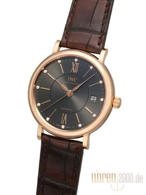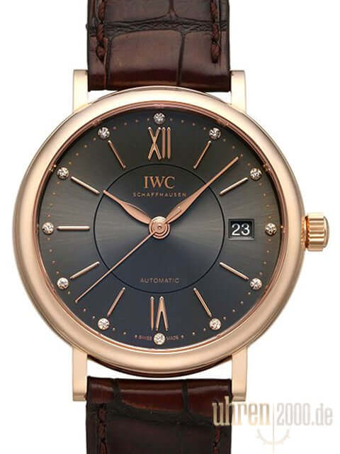 Gehäuse aus 18 kt Rotgold poliert, Gehäusedurchmesser 37 mm, Gehäusehöhe 9 mm, braunes Lederarmband mit 18 kt Rotgold Dornschließe, graues Zifferblatt mit Sonnenschliff und 12 Diamanten, Rotgold Zeiger, Automatikwerk, Kaliber IWC 35111, Schwingung 28.800 A/h, Gangreserve für 42 Stunden, kratzfestes Saphirglas, Datum,verschraubter 18 kt Rotgold Boden, Wasserdicht bis zu 3 bar.