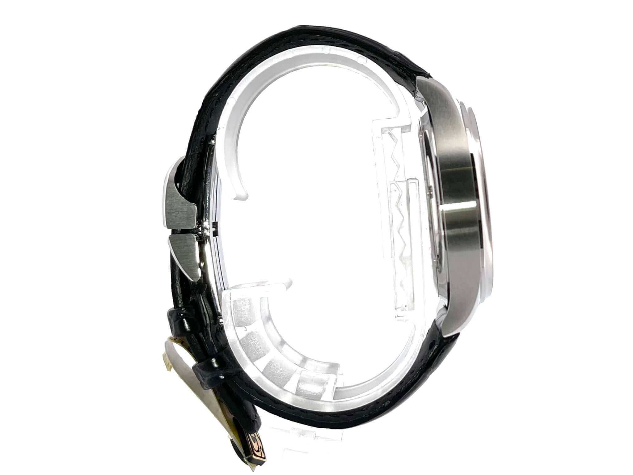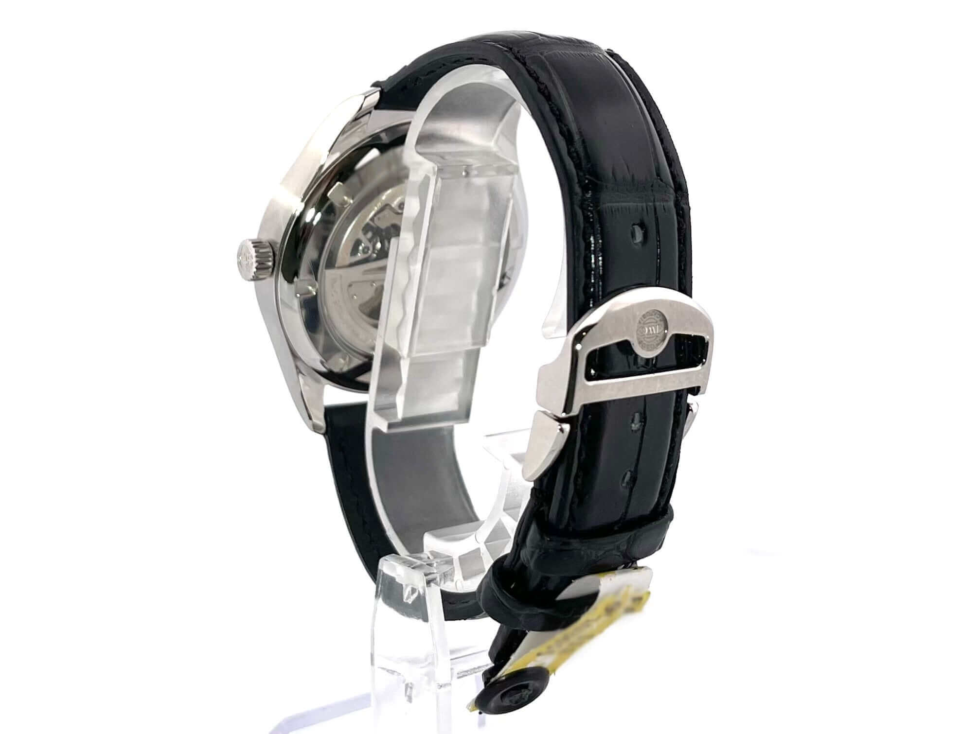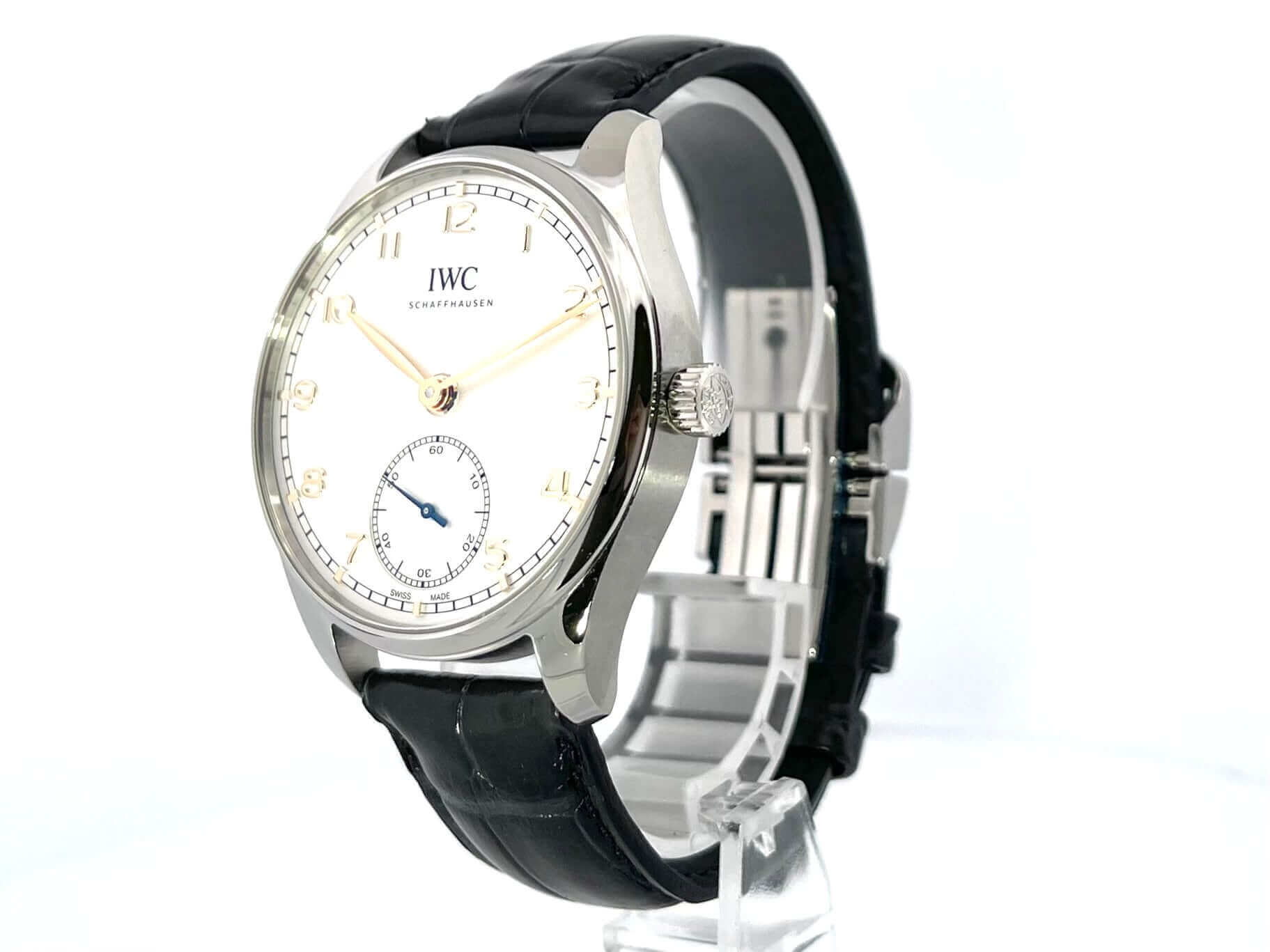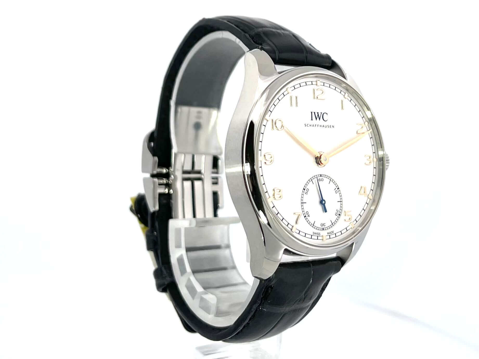 Gehäuse aus Edelstahl poliert, Gehäusedurchmesser 40,4 mm, Höhe 12,3 mm, polierte Edelstahl Lünette, schwarzes Alligatorlederband mit Faltschließe, silberfarbenes Zifferblatt, Automatik, Kaliber IWC 82200, 60 Stunden Gangreserve, kleine Sekunde, Saphirglas, Sichtboden mit Saphirglas, Wasserdicht bis zu 3 bar.