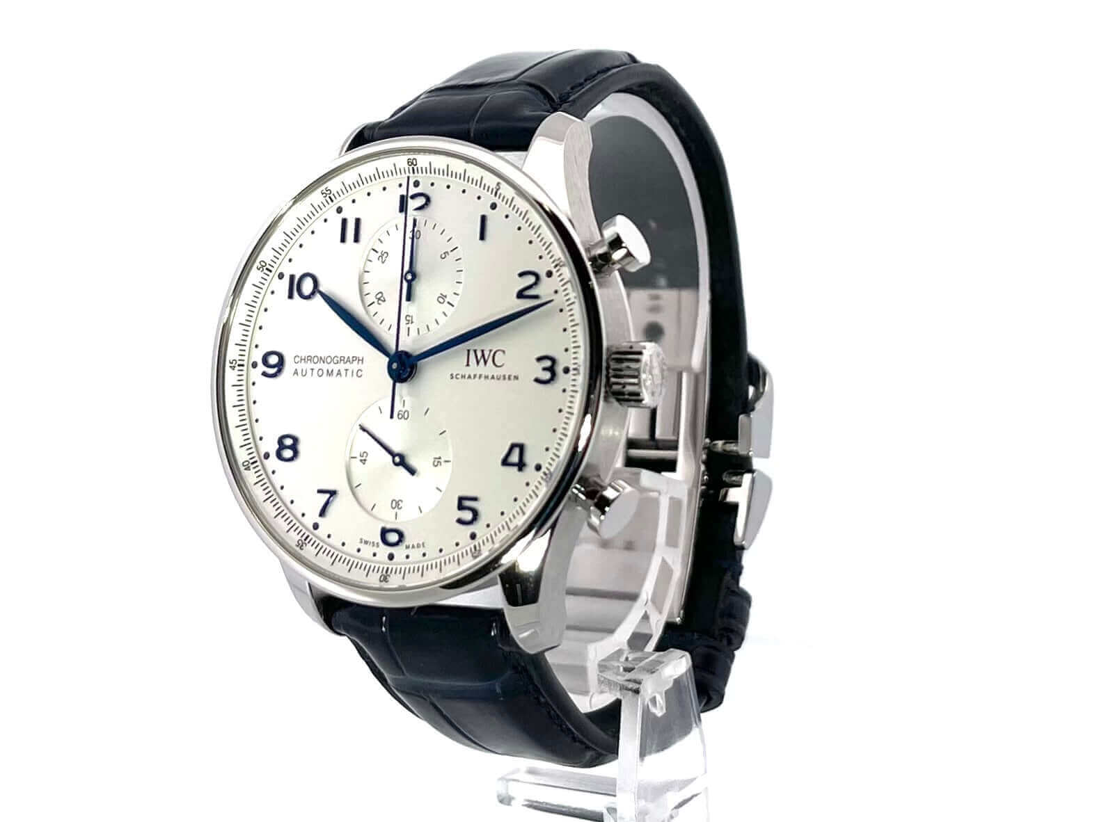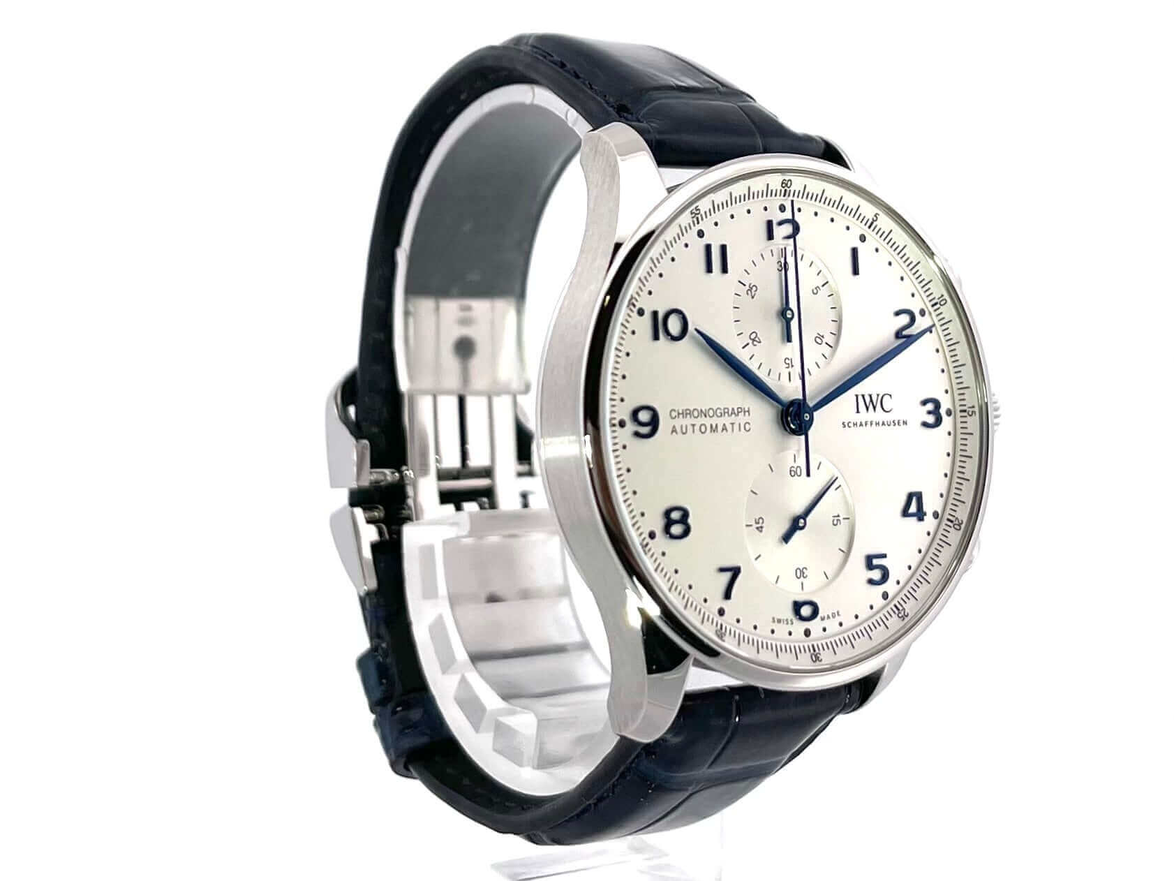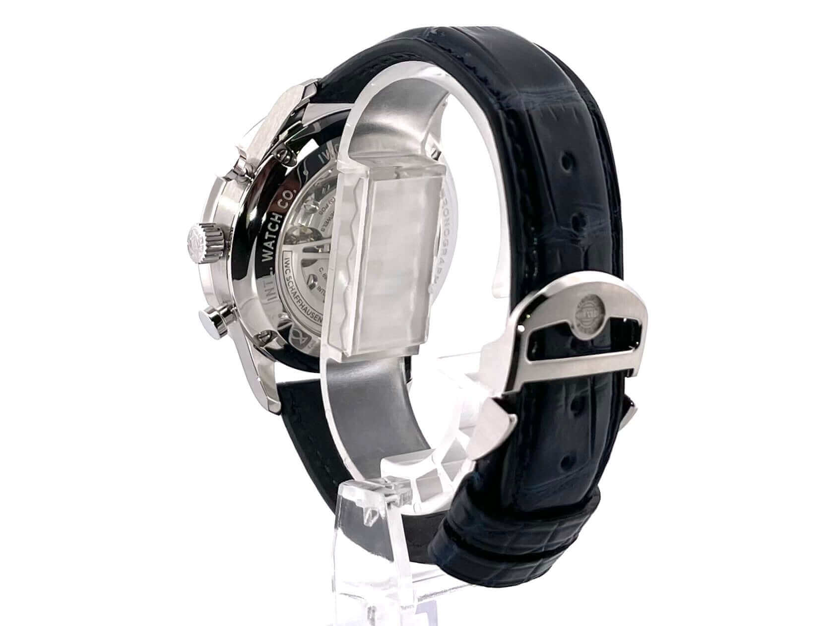 Gehäuse aus Edelstahl poliert und satiniert, Gehäusedurchmesser 41 mm, Gehäusehöhe 13 mm, blaues Alligatorlederband mit Faltschließe, silbernes Zifferblatt mit aufgesetzten blau eloxierten arabischen Ziffern, blau eloxierte Zeiger, Automatikwerk, Kaliber IWC 69355, 27 Steine, 28.800 A/h, Gangreserve ca 46 Stunden, Chronograph, kleine Sekunde, kratzfestes Saphirglas, Edelstahlboden mit Sichtfenster, Wasserdicht bis zu 3 bar.