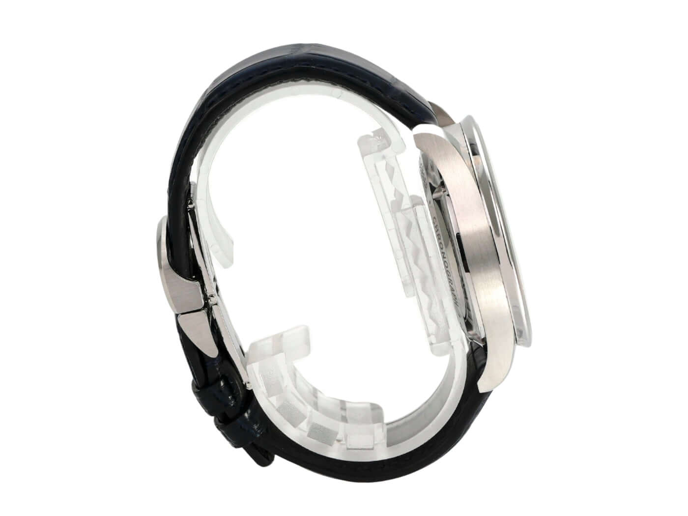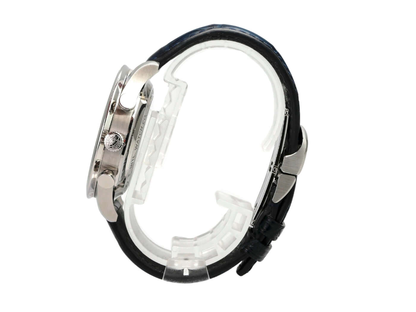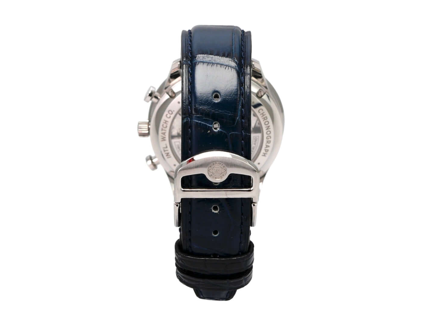 Gehäuse aus Edelstahl poliert und satiniert, Gehäusedurchmesser 41 mm, Gehäusehöhe 13 mm, blaues Alligatorlederband mit Faltschließe, silbernes Zifferblatt mit aufgesetzten, blau eloxierten arabischen Ziffern, blau eloxierte Zeiger, Automatikwerk, Kaliber IWC 69355, 27 Steine, 28.800 A/h, Gangreserve ca. 46 Stunden, Chronograph, kleine Sekunde, kratzfestes Saphirglas, Edelstahlboden mit Sichtfenster, wasserdicht bis zu 3 bar.