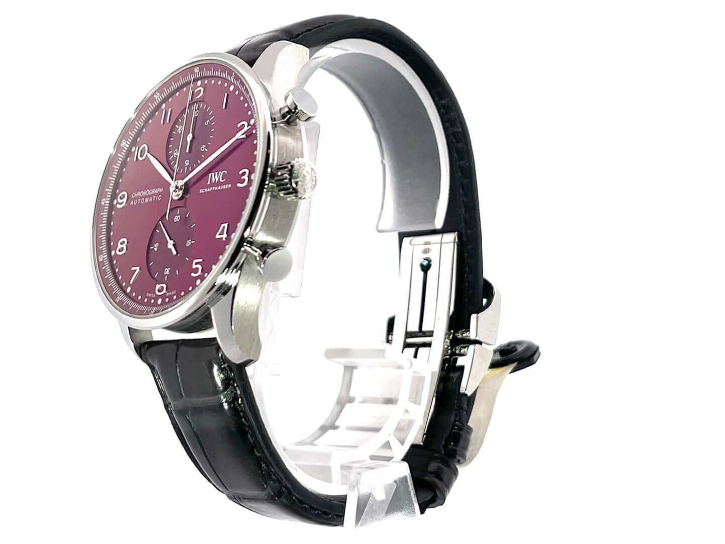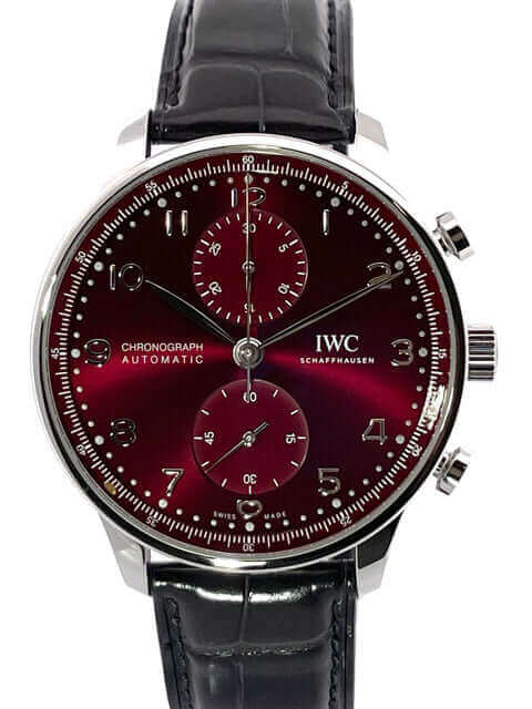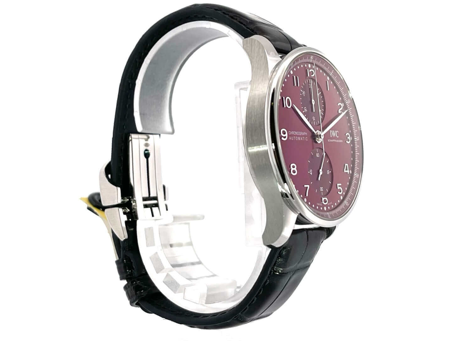 Gehäuse aus Edelstahl poliert und satiniert, Gehäusedurchmesser 41 mm, Gehäusehöhe 13 mm, weinrotes Zifferblatt mit aufgesetzten arabischen Ziffern, schwarzes Alligatorlederband mit Faltschließe, Automatikwerk, Kaliber IWC 69355, 27 Steine, 28.800 A/h, Gangreserve ca 46 Stunden, Chronograph, kleine Sekunde, kratzfestes Saphirglas, Edelstahlboden mit Sichtfenster, Wasserdicht bis zu 3 bar.