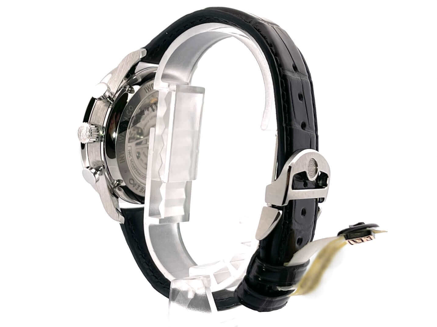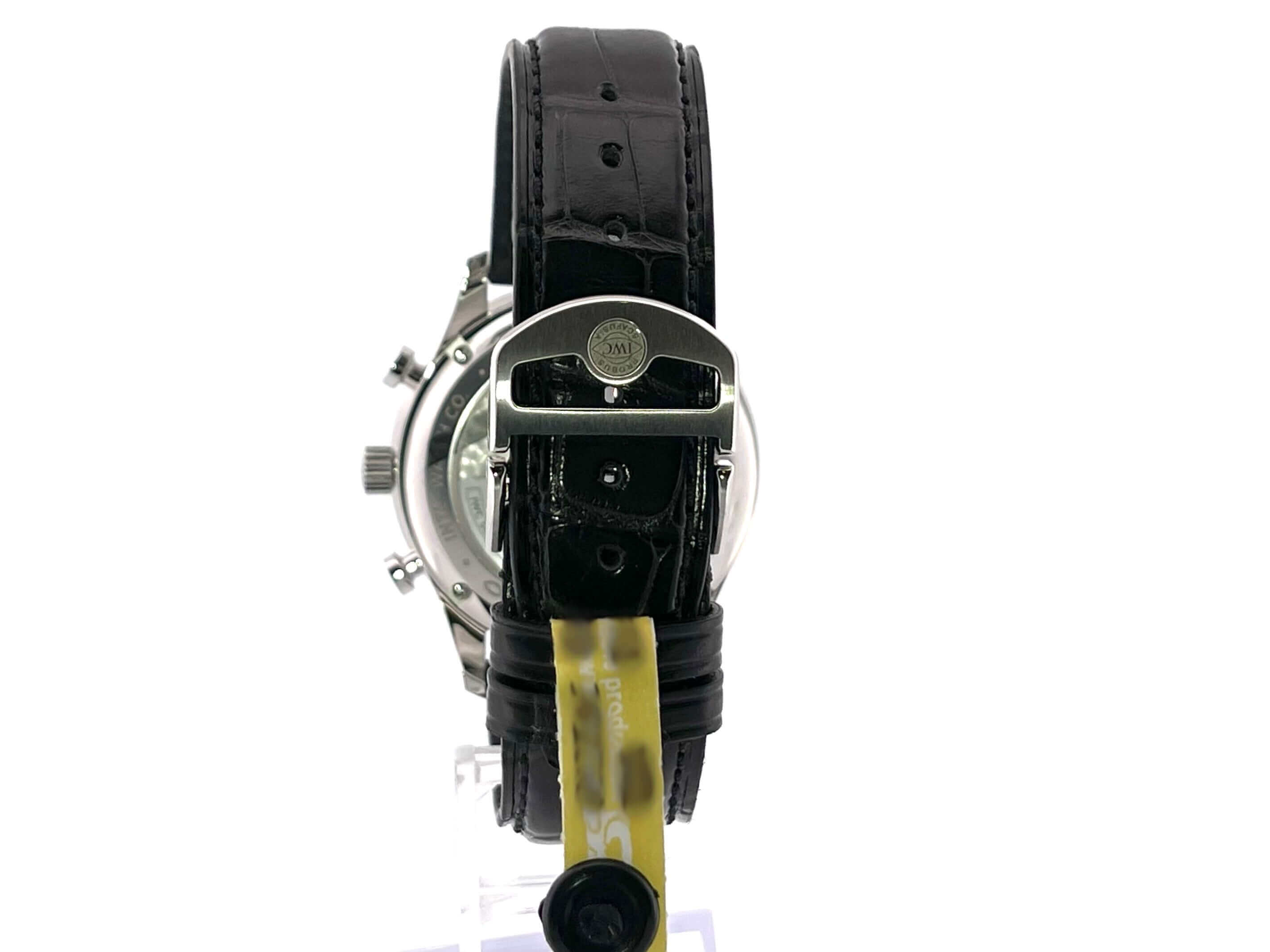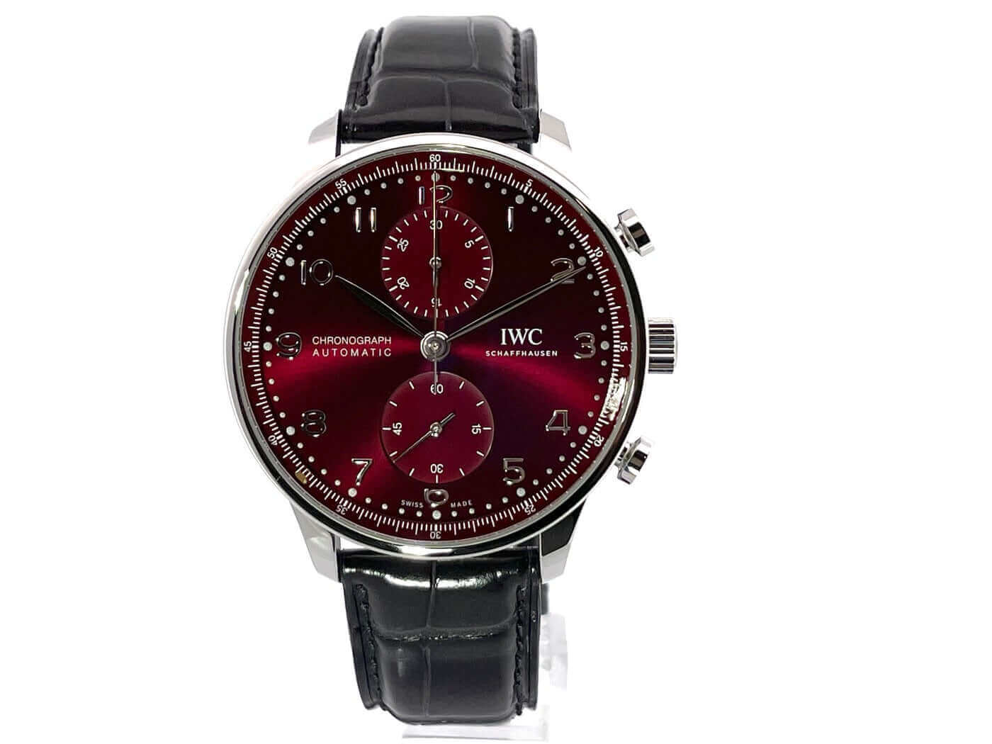 Gehäuse aus Edelstahl poliert und satiniert, Gehäusedurchmesser 41 mm, Gehäusehöhe 13 mm, weinrotes Zifferblatt mit aufgesetzten arabischen Ziffern, schwarzes Alligatorlederband mit Faltschließe, Automatikwerk, Kaliber IWC 69355, 27 Steine, 28.800 A/h, Gangreserve ca 46 Stunden, Chronograph, kleine Sekunde, kratzfestes Saphirglas, Edelstahlboden mit Sichtfenster, Wasserdicht bis zu 3 bar.