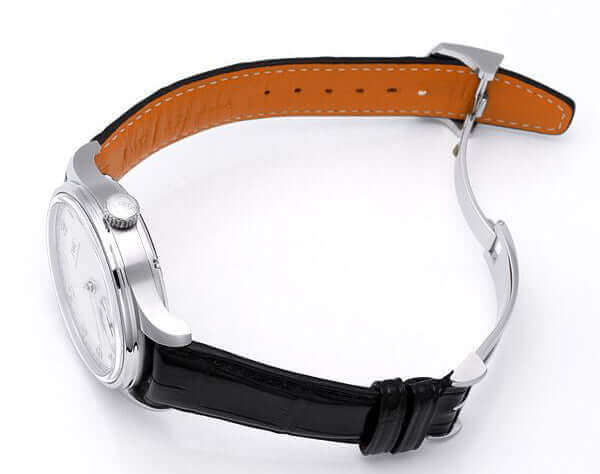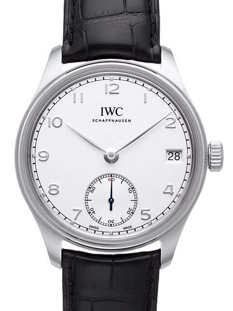 Gehäuse aus Edelstahl poliert, Durchmesser 43 mm, Höhe 12 mm, Edelstahl Lünette poliert, schwarzes Alligator Lederband mit Faltschließe, Zifferblatt Silberfarben, Handaufzugswerk Kaliber IWC 59215, Saphirglas, kleine Sekunde, Datumsanzeige auf 3 Uhr Position, Sichtboden mit Saphirglas, Wasserdicht bis zu 3 bar.