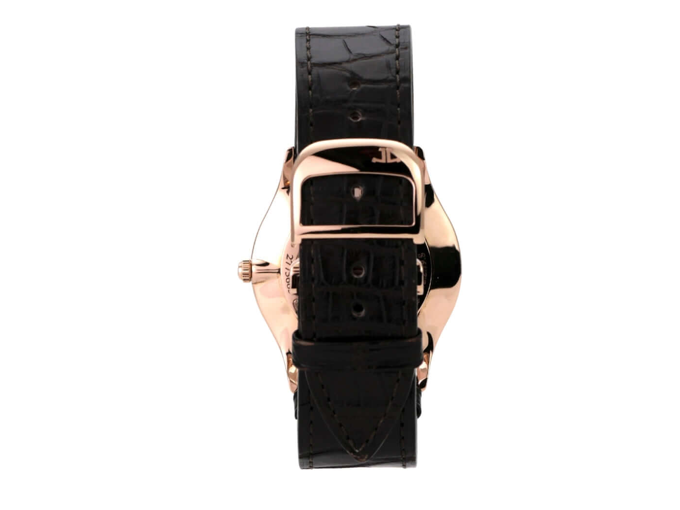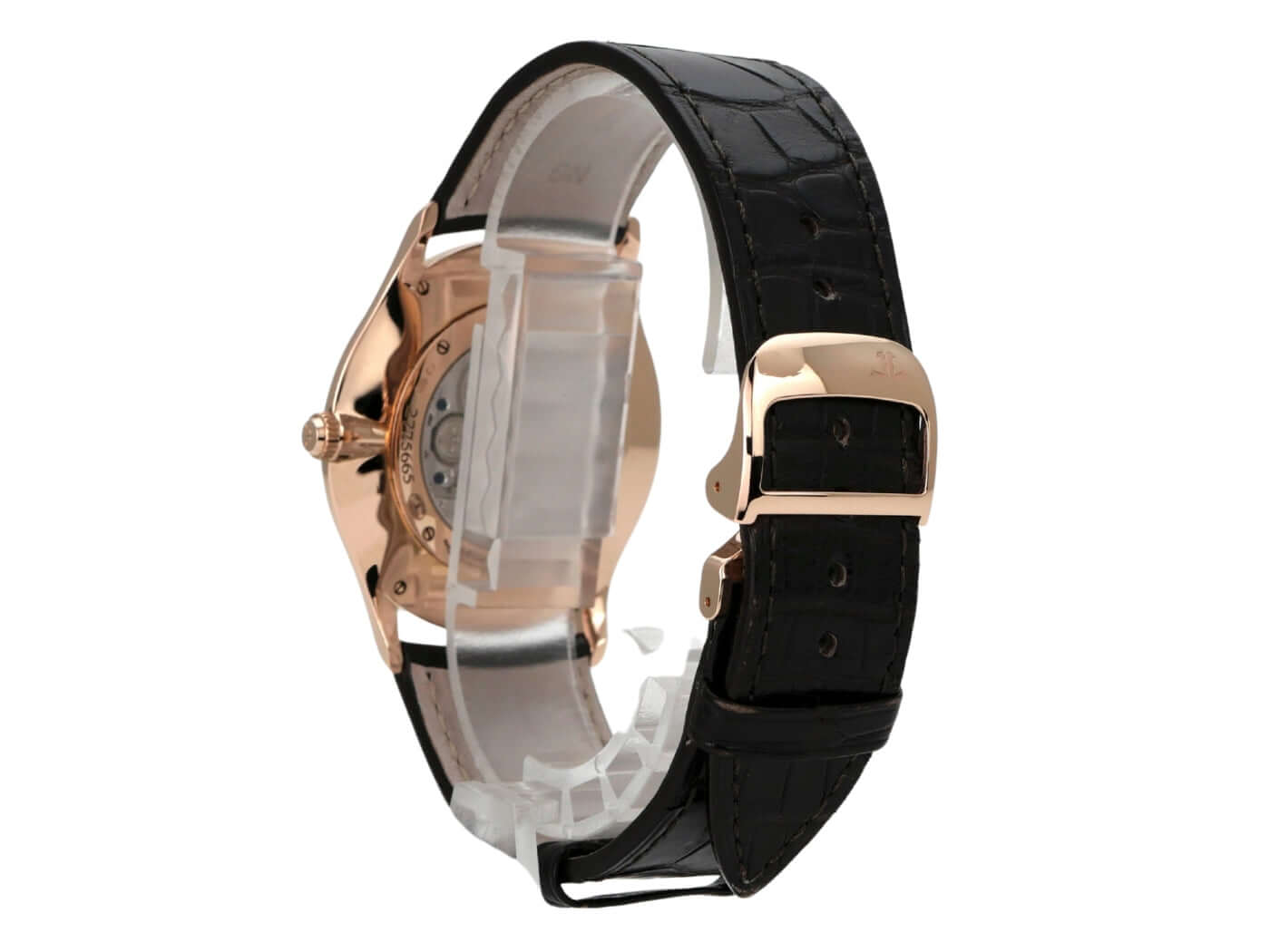 Gehäuse aus 18 kt Roségold poliert, Gehäusedurchmesser 38 mm, Gehäusehöhe 6,31 mm, polierte Roségold Lünette, braunes Alligatorlederband mit Dornschließe, silbernes Zifferblatt, Handaufzug, Kaliber Jaeger-LeCoultre 849, 21.600 A/h, Gangreserve ca. 35 Stunden, Saphirglas, Sichtboden mit Saphirglas, wasserdicht bis zu 5 bar.