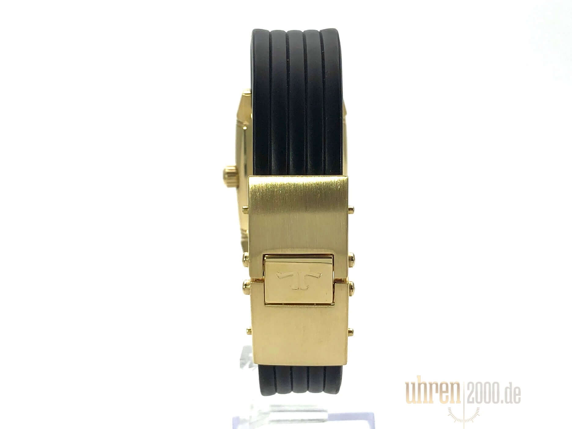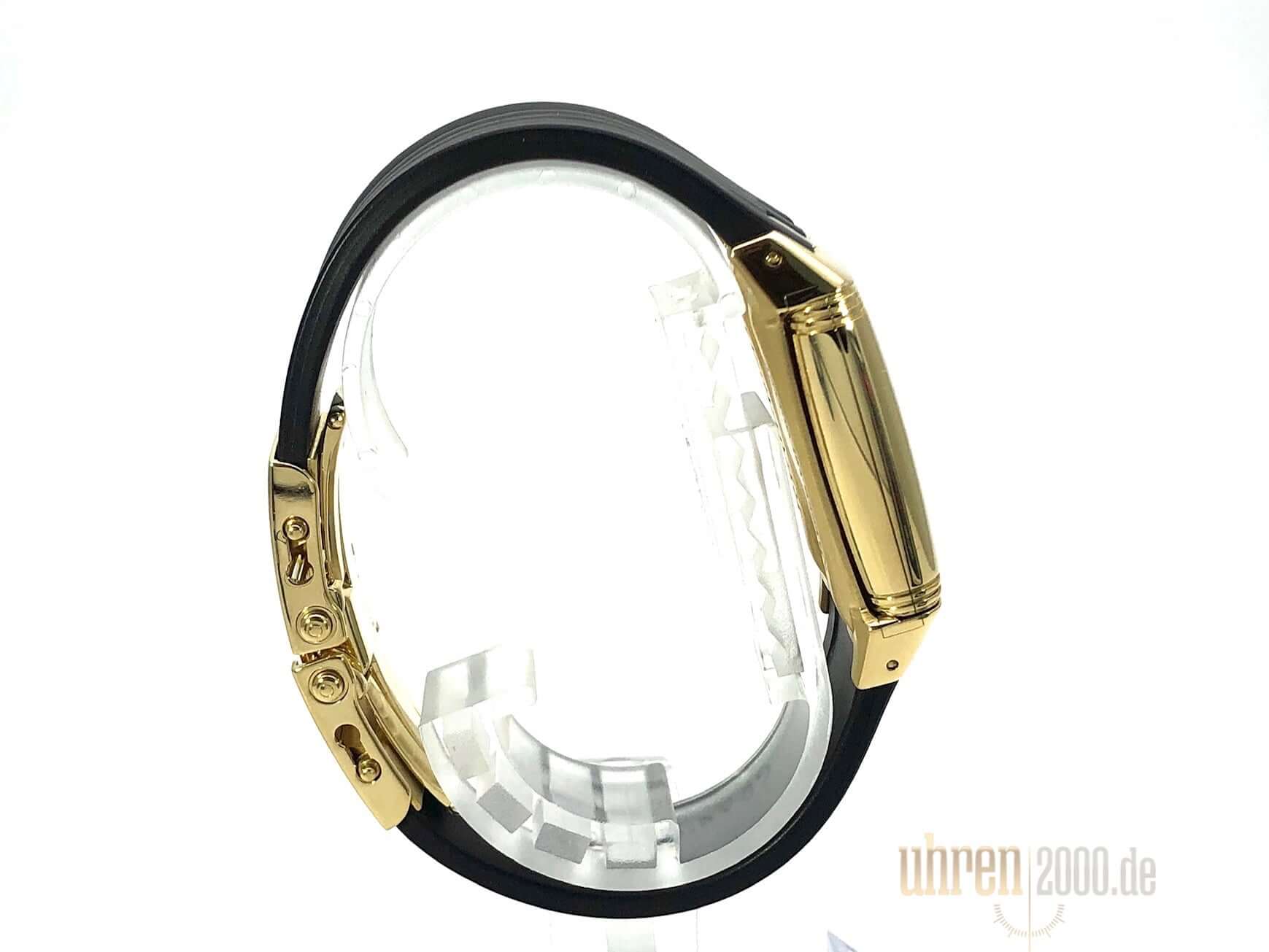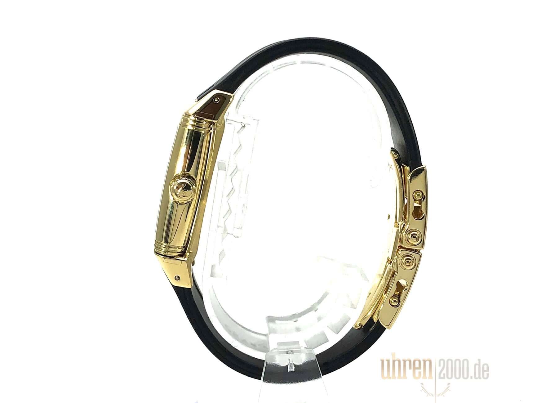 Gehäuse aus Gelbgold poliert, Gehäuse ca 40,5 x 26,5 mm, Gehäusehöhe 10 mm, polierte Gelbgold Lünette, schwarzes Kautschukband mit Doppelfaltschließe, silberfarbenes Zifferblatt, Automatik, Kaliber Jaeger-LeCoultre, Gangreserve ca. 38 Stunden, Datum, kleine Sekunde, Saphirglas, Wasserdicht bis zu 3 bar.