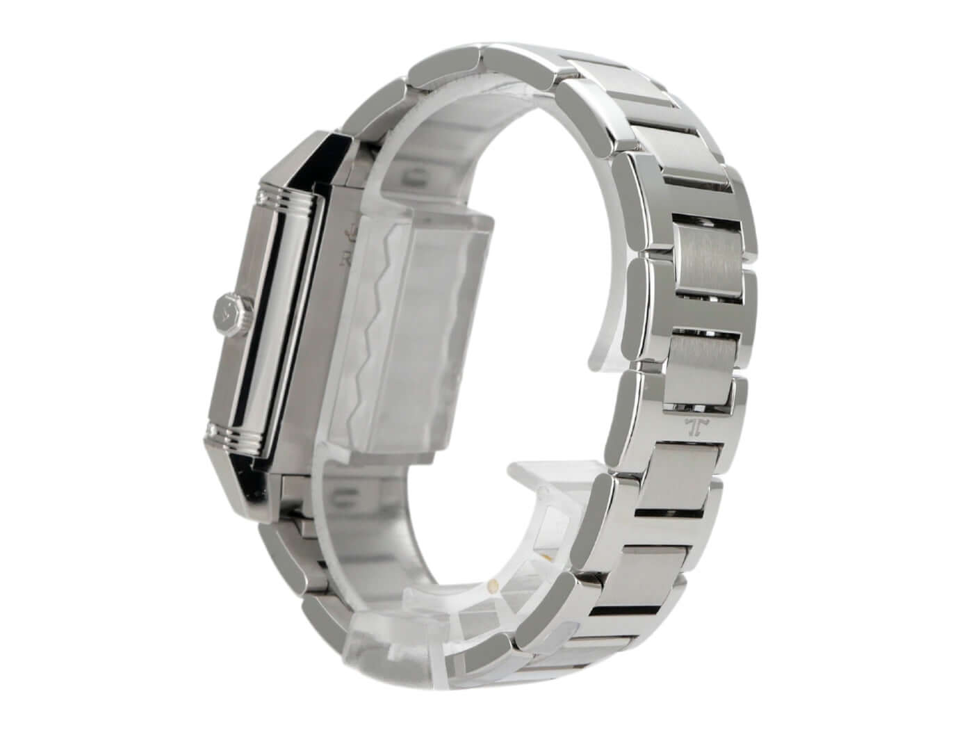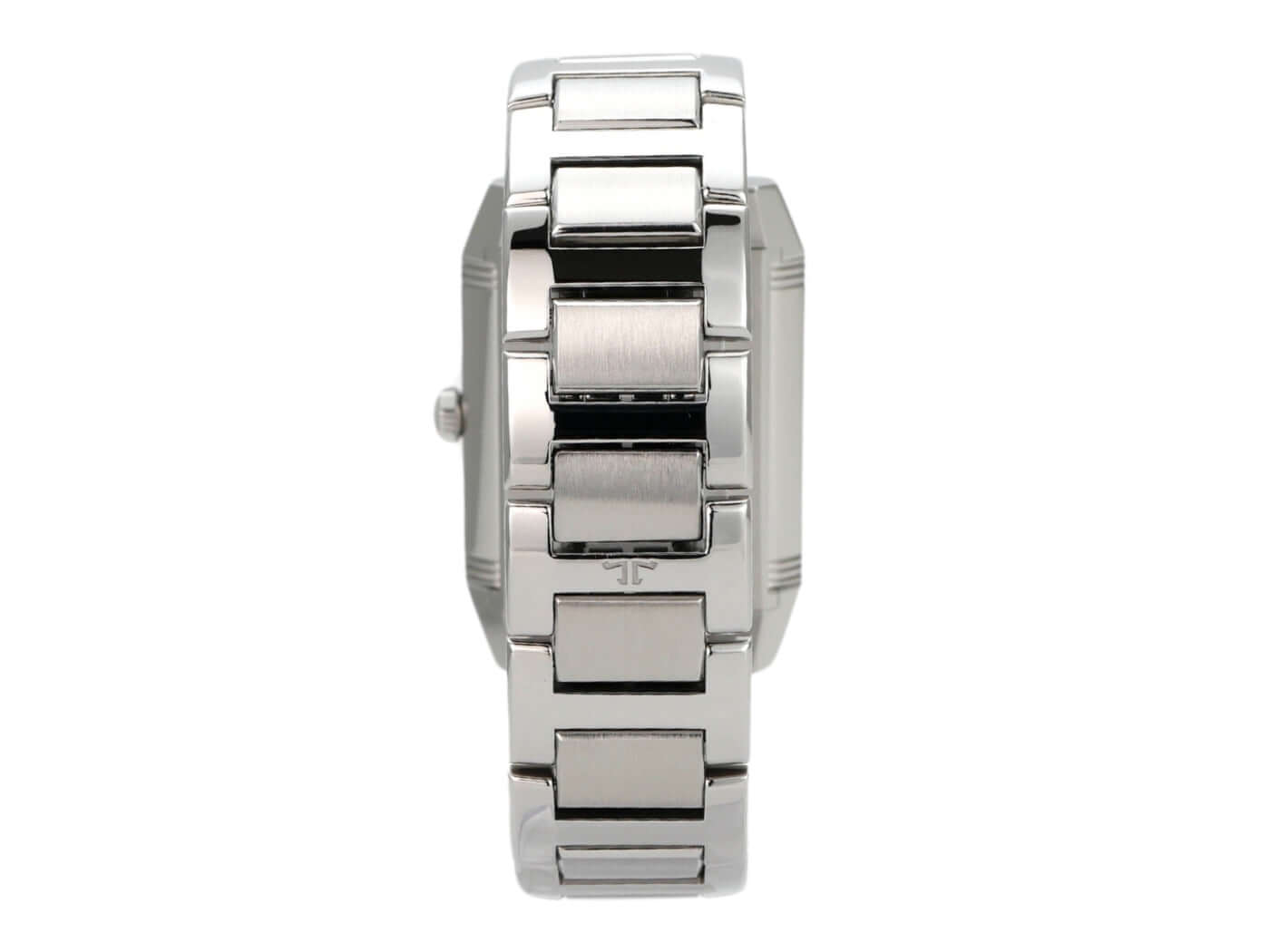 Gehäuse aus Edelstahl poliert, Gehäuse 42 X 29 mm, Gehäusehöhe 10,75 mm, polierte Edelstahl Lünette mit Diamanten besetzt, Edelstahlband mit Doppelfaltschließe, silberfarbenes Zifferblatt, Quarz Uhrwerk, Kaliber Jaeger-LeCoultre 657 Saphirglas, wasserdicht bis zu 5 bar.