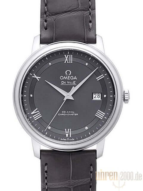 Gehäuse aus Edelstahl poliert, Gehäusedurchmesser 39,5 mm, Lünette aus Edelstahl poliert, graues Lederband mit Dornschließe, graues Zifferblatt mit aufgesetzten römischen Ziffern, Uhrwerk Automatik, Kaliber Omega 2500 mit Co-Axial Hemmung, 27 Steine, 25.200 A/h, Gangreserve ca. 48 Stunden, Datumsanzeige, Chronometer, Saphirglas, Edelstahlboden, Wasserdicht bis 3 bar.
