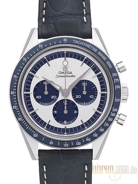 Edelstahlgehäuse poliert und satiniert, Gehäusedurchmesser 39,70 mm, blaue Keramik Tachymeter-Lünette, blaues Lederband mit Dornschließe, Saphirglas, Handaufzug, Omega Kaliber 1861, 48 Stunden Gangreserve, silberfarbenes Zifferblatt mit Strichindexen, Limited Edition, Wasserdicht bis zu 5 bar.
