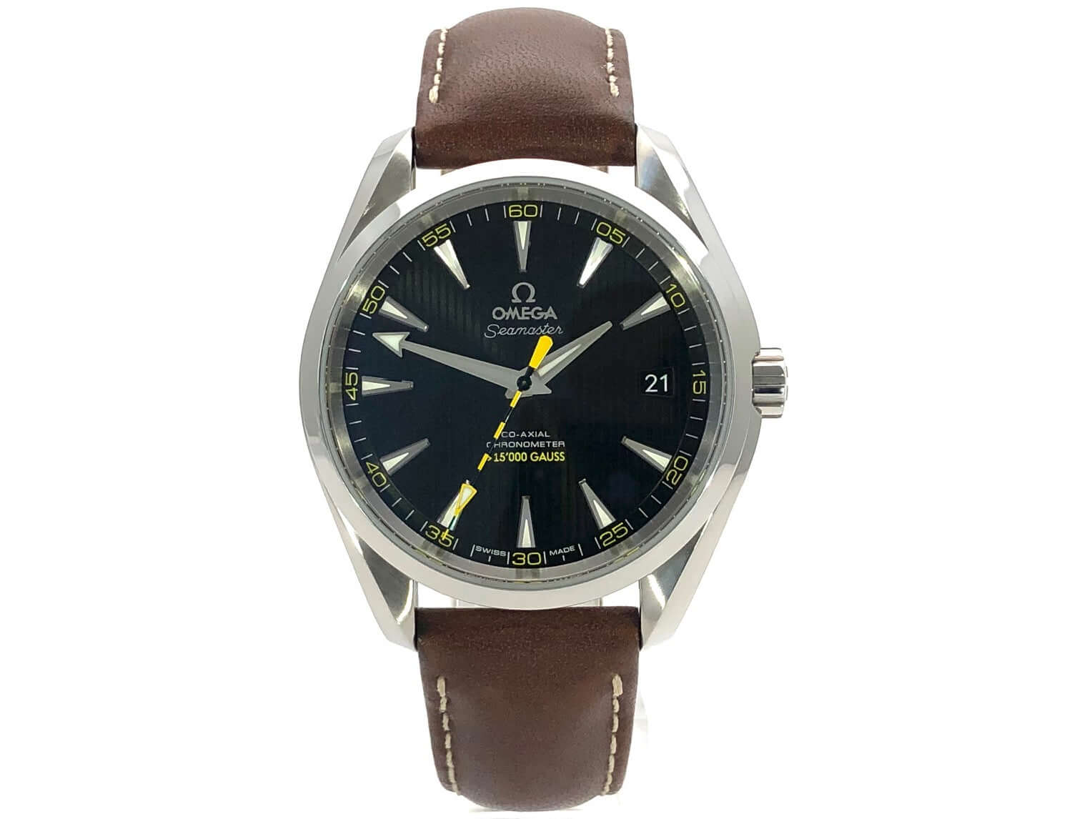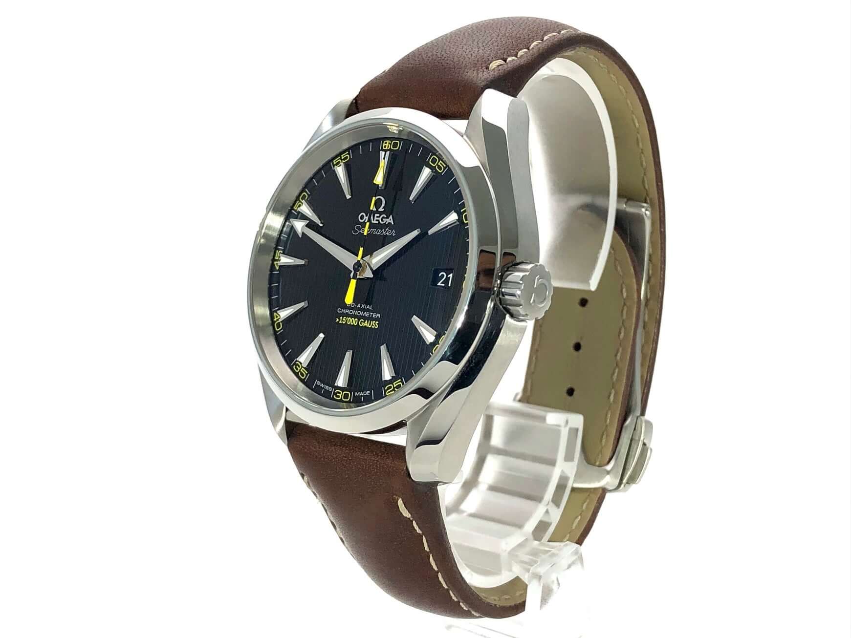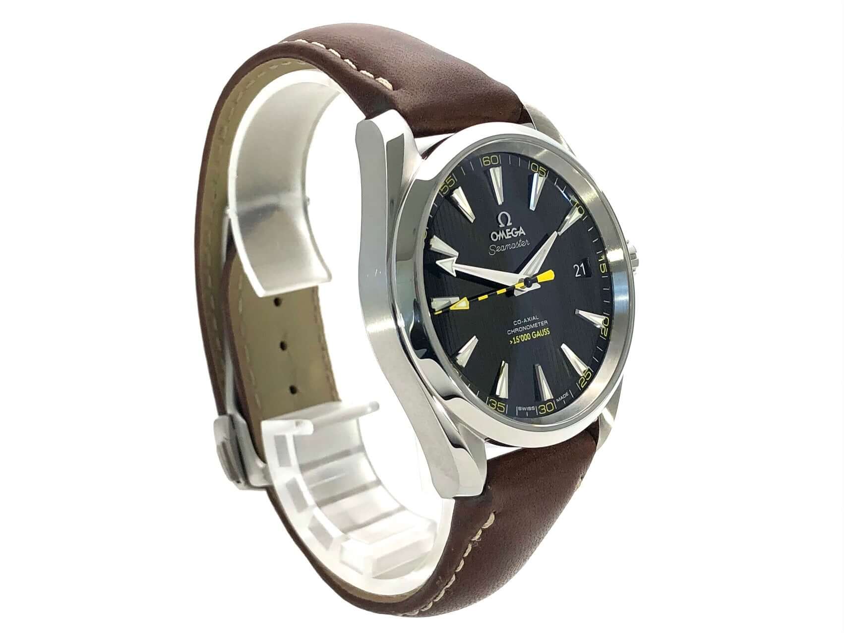 Gehäuse aus Edelstahl poliert und satiniert, Gehäusedurchmesser 41,50 mm, Gehäusehöhe 14,30 mm, braunes Ledernband mit Faltschließe, schwarzes Zifferblatt, Automatik, OMEGA Kaliber 8508, Datumsanzeige, Si14-Silizium-Unruh-Spiralfeder, Antimagnetisches Uhrwerk das einer Belastung von über 15.000 Gauß standhält. (bis 10.000 Gauß funktionsfähig) Wasserdicht bis zu 15 bar.