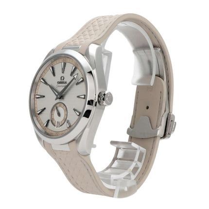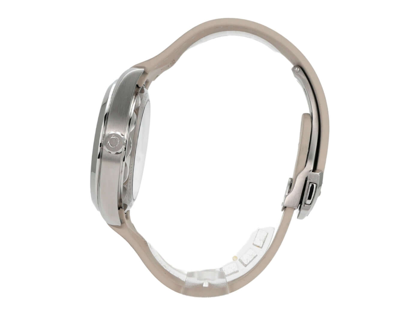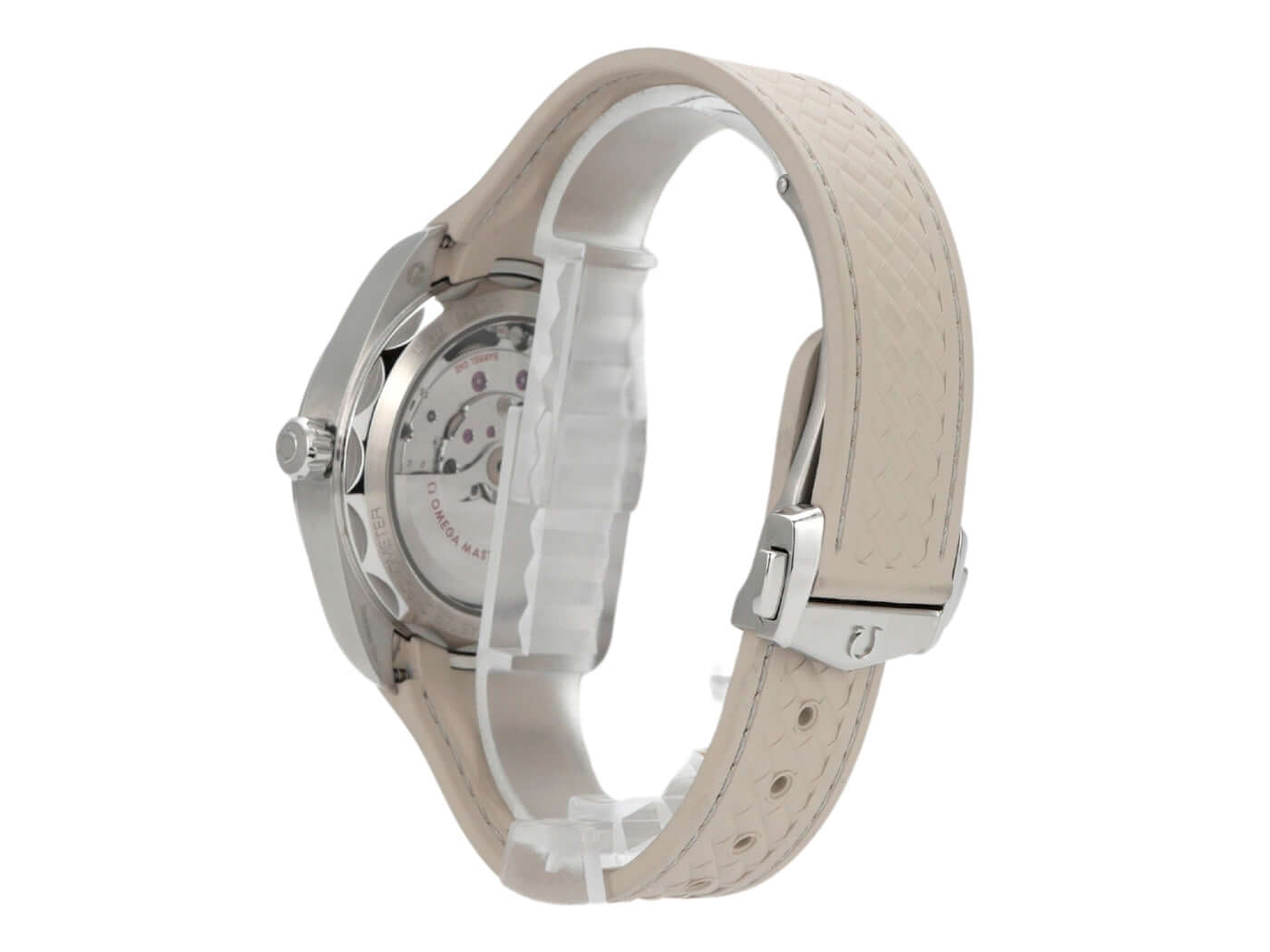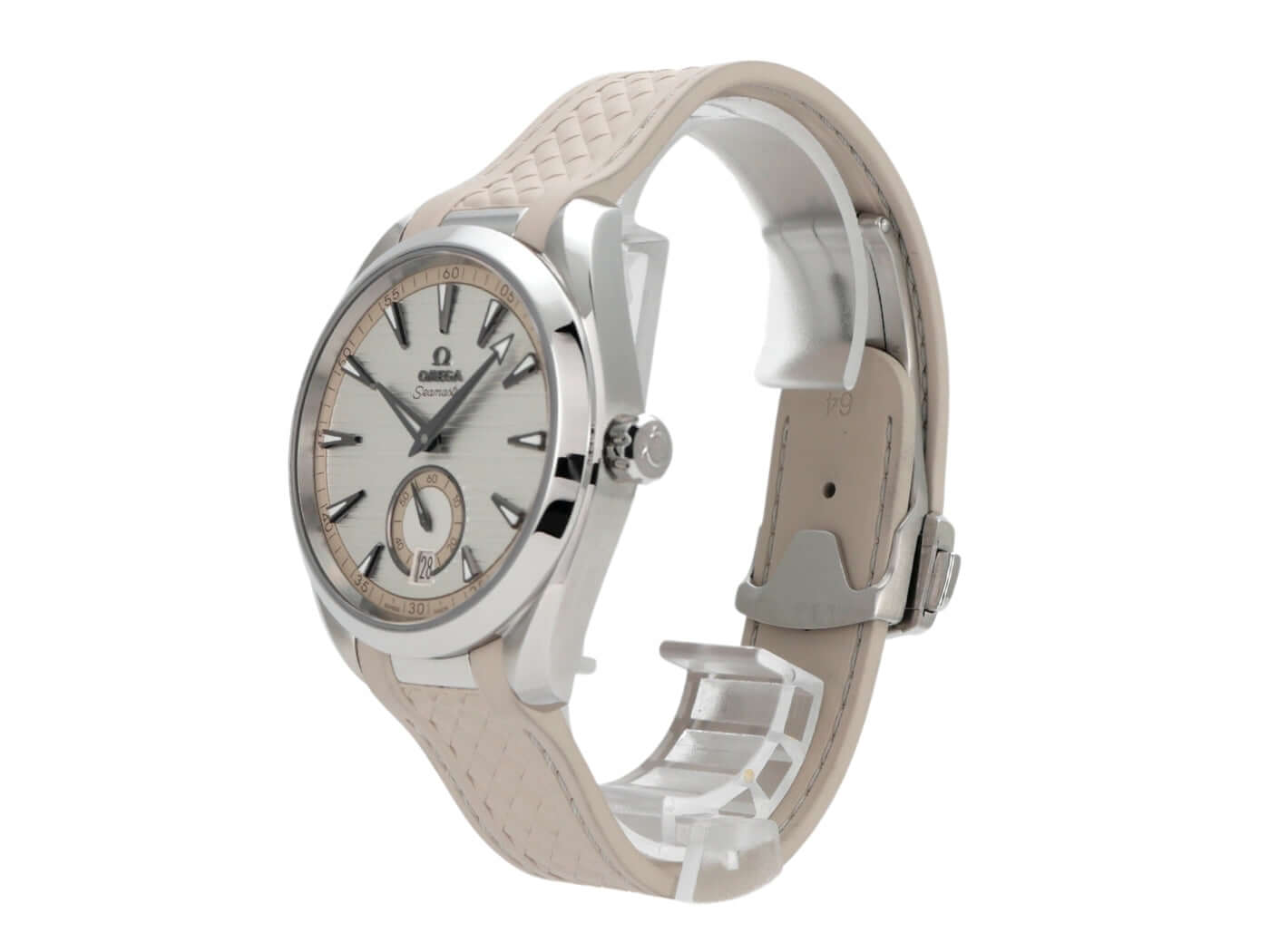 Gehäuse aus Edelstahl poliert und satiniert, Gehäusedurchmesser 41 mm, Edelstahl Lünette glatt und poliert, beigefarbenes Kautschukband mit Faltschließe, silberfarbenes Zifferblatt mit aufgesetzten Leuchtindizes, Leuchtzeiger, Automatik, Antimagnetisches Uhrwerk das einer Belastung von über 15.000 Gauß standhält, Kaliber Omega 8916, Co-Axial Hemmung, Gangreserve ca. 60 Stunden, Datumsanzeige, Master Chronometer, kleine Sekunde, Saphirglas, Krone verschraubt, Saphirglasboden, wasserdicht bis zu 15 bar.