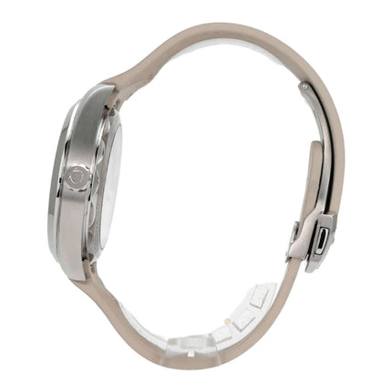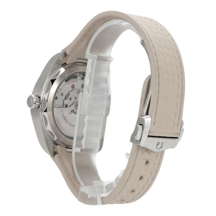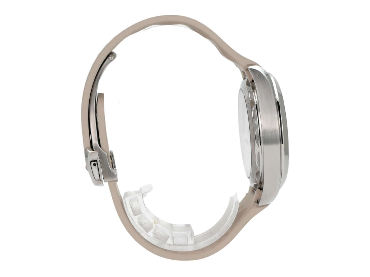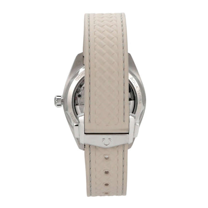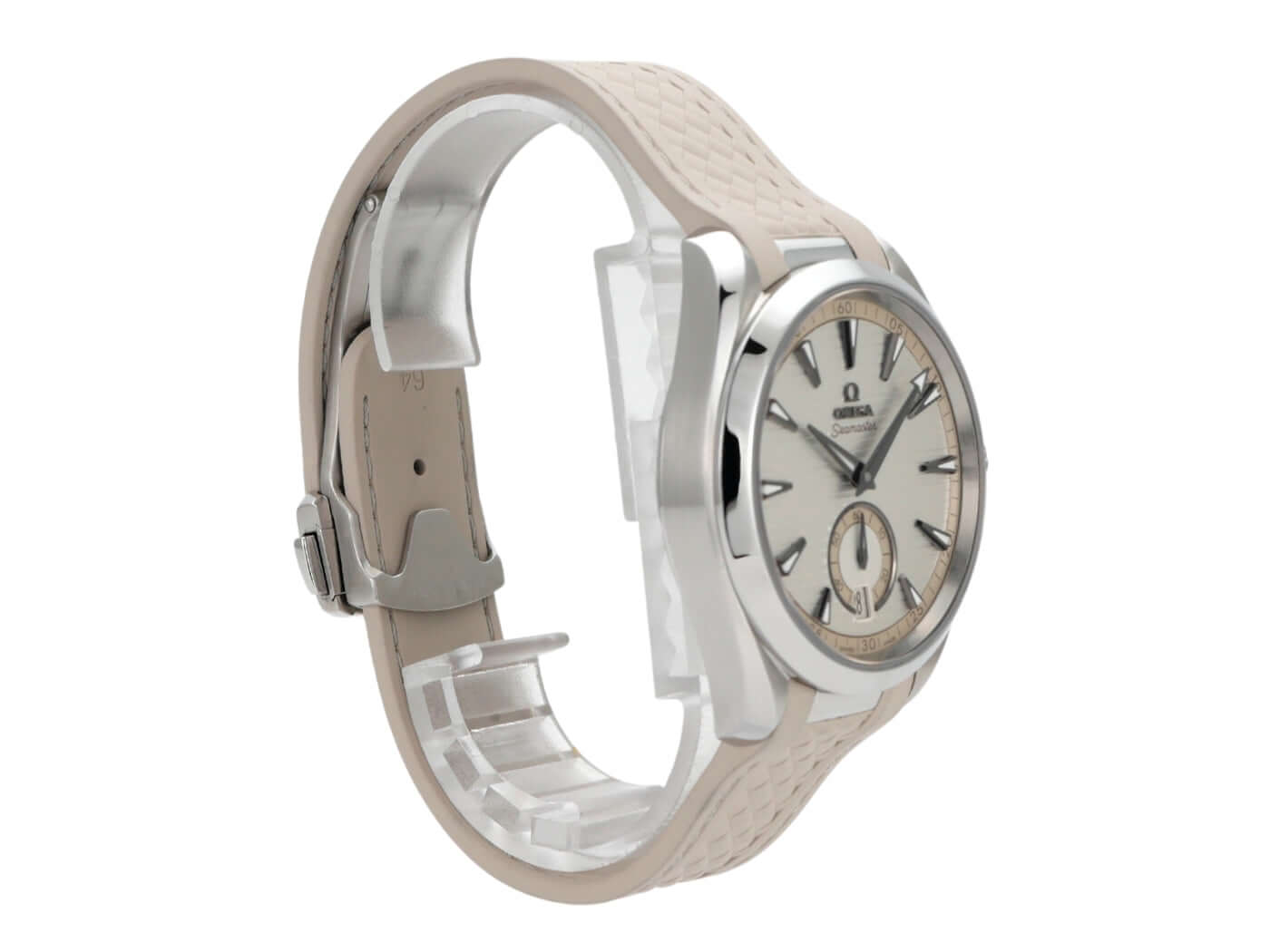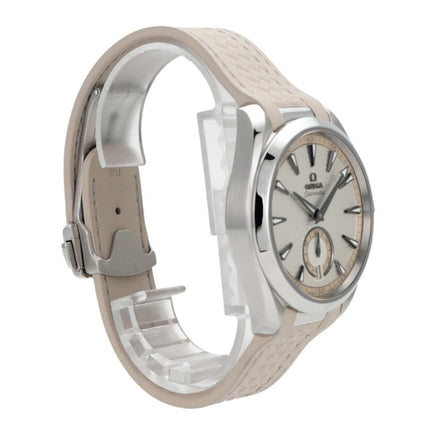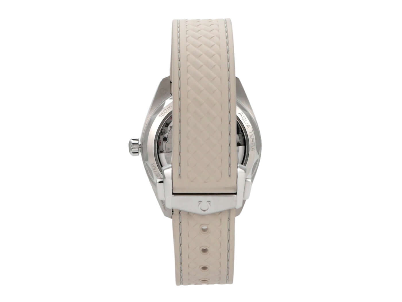 Gehäuse aus Edelstahl poliert und satiniert, Gehäusedurchmesser 41 mm, Edelstahl Lünette glatt und poliert, beigefarbenes Kautschukband mit Faltschließe, silberfarbenes Zifferblatt mit aufgesetzten Leuchtindizes, Leuchtzeiger, Automatik, Antimagnetisches Uhrwerk das einer Belastung von über 15.000 Gauß standhält, Kaliber Omega 8916, Co-Axial Hemmung, Gangreserve ca. 60 Stunden, Datumsanzeige, Master Chronometer, kleine Sekunde, Saphirglas, Krone verschraubt, Saphirglasboden, wasserdicht bis zu 15 bar.