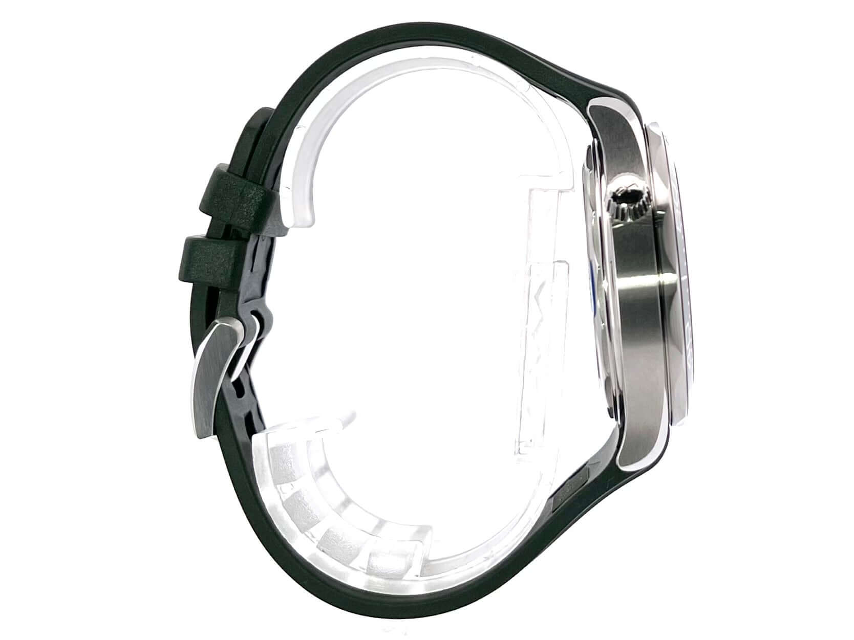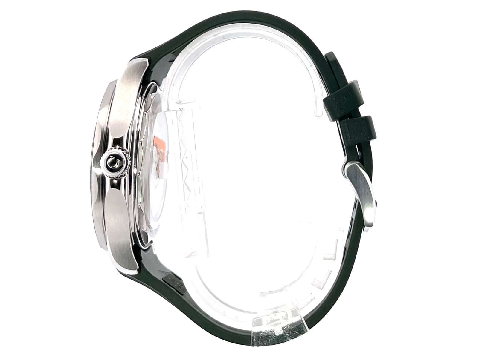 Gehäuse aus Edelstahl poliert und satiniert, Gehäusedurchmesser 42 mm, Edelstahl Lünette mit grüner Keramikeinlage, 60 Minuten Skala und Leuchtpunkt, einseitig drehbar, grünes Kauschukband mit Dornschließe, grünes Zifferblatt mit aufgesetzten Leuchtindizes, skelettierte Leuchtzeiger, Uhrwerk Automatik, Kaliber Omega 8800 mit Co-Axial Hemmung, 35 Steine, 25.200 A/h, Gangreserve ca. 55 Stunden, Datum, Chronometer, Heliumventil, Saphirglas gewölbt und kratzfest, doppelseitig entspiegelt, Krone verschraubbar mit Flankenschutz, Edelstahlboden verschraubt mit Sichtfenster, Wasserdicht bis zu 30 bar.