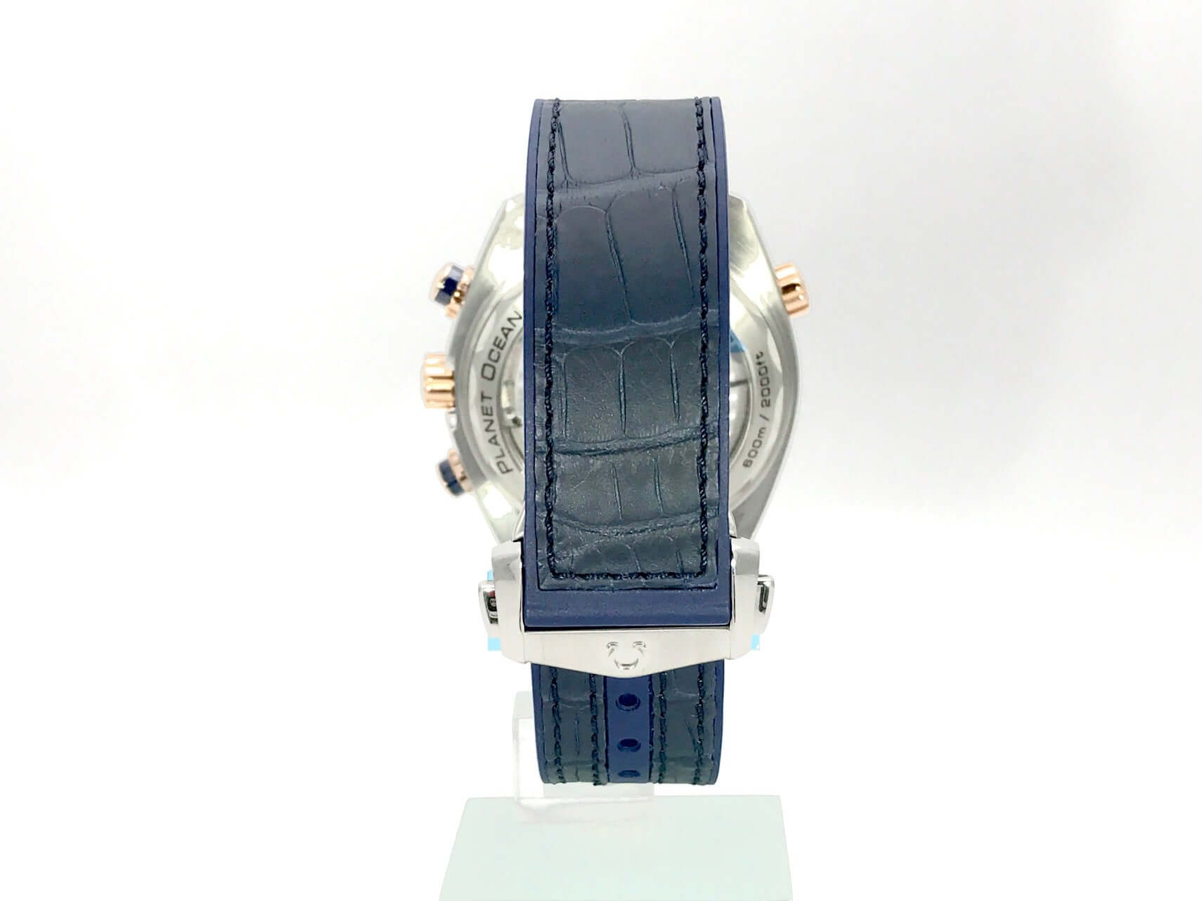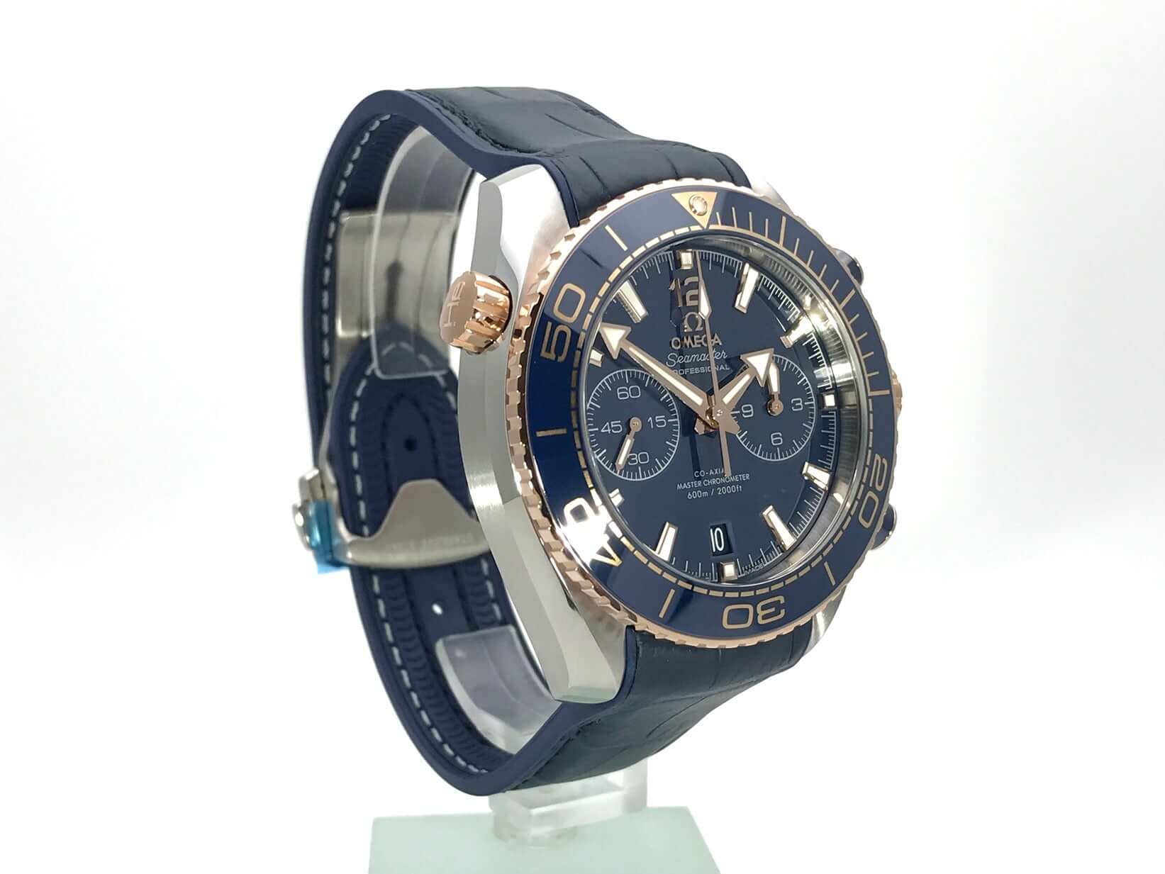 Gehäuse aus Edelstahl / Rotgold poliert und satiniert, Gehäusedurchmesser 45,5 mm, Gehäusehöhe 18,9 mm, Rotgold Lünette mit blauer Keramik Einlage, 60 Minuten Skala und Leuchtpunkt, einseitig drehbar, Heliumventil, blaues Leder / Kautschukband mit Sicherheitsfaltschließe, blaues Keramikzifferblatt mit aufgesetzten Rotgold Leuchtindexen, arabische Ziffer 12, Rotgold Leuchtzeiger, Automatikwerk, Chronometer, Chronograph, Kaliber Omega 9900 mit Co-Axial, 28.800 A/h, Gangreserve ca. 60 Stunden, kleine Sekunde, Datumsanzeige, Saphirglas, verschraubte Krone, Edelstahlboden mit Saphirglas verschraubt und graviert, Wasserdicht bis zu 60 bar.