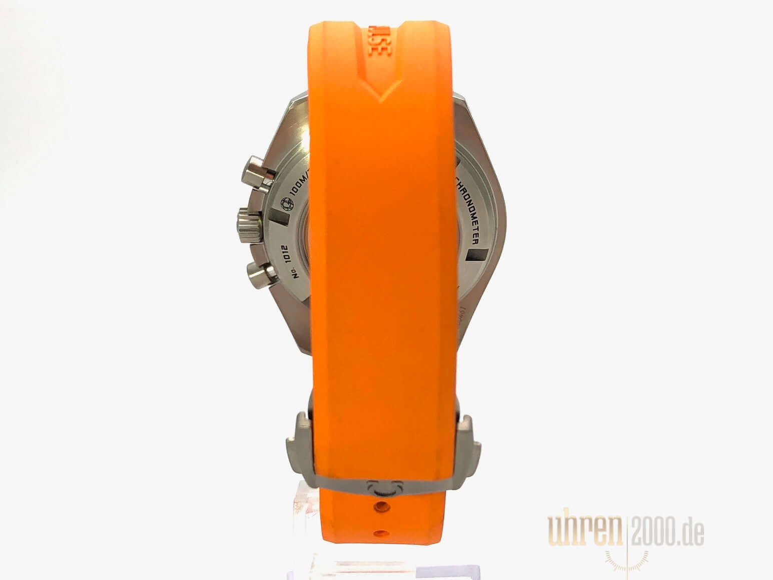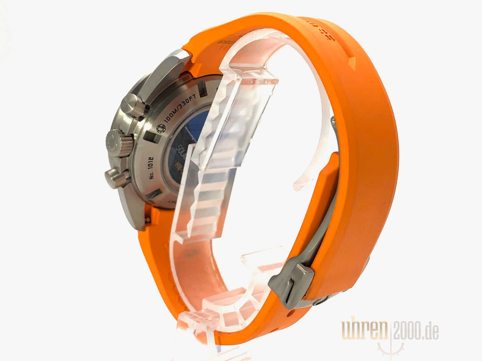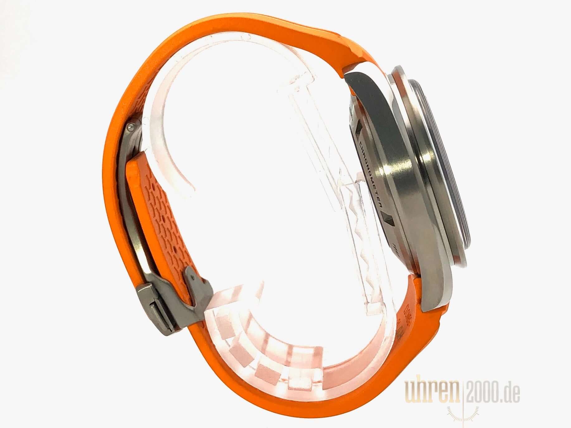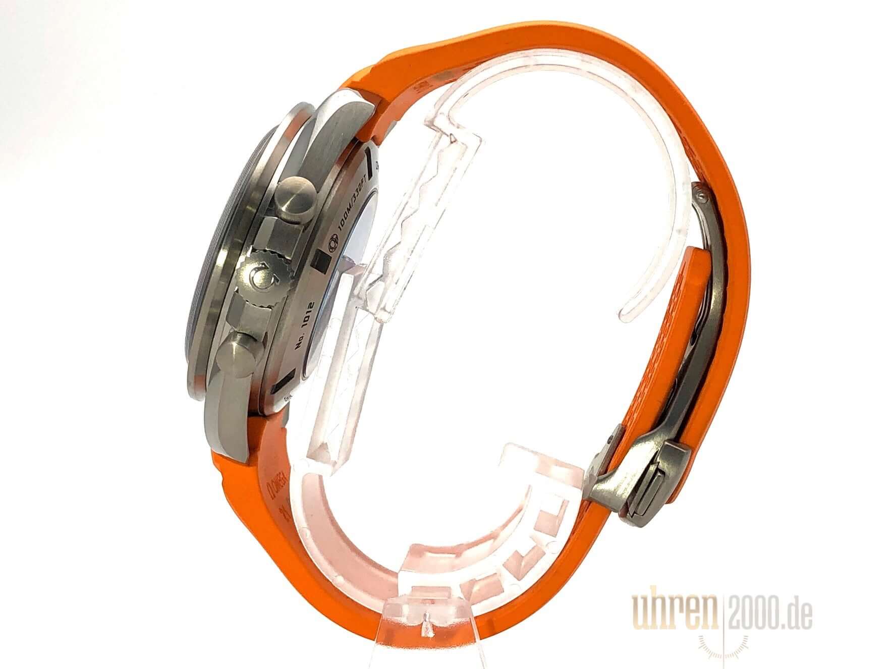 Gehäuse Titan poliert und satiniert, Gehäusedurchmesser 44,25 mm, Titan Lünette mit Tachymeterskala, Orangefarbenes Kautschukband mit Faltschließe, schwarzes Zifferblatt mit aufgesetzten Leuchtindizes, Leuchtzeiger, Automatikwerk, Kaliber Omega 3306, 28.800 A/h, Gangreserve ca. 52 Stunden, Chronometer, Datumsanzeige, GMT, Saphirglas kratzfest, doppelseitig entspiegelt, Titanboden verschraubt und graviert, Wasserdicht bis zu 10 bar.