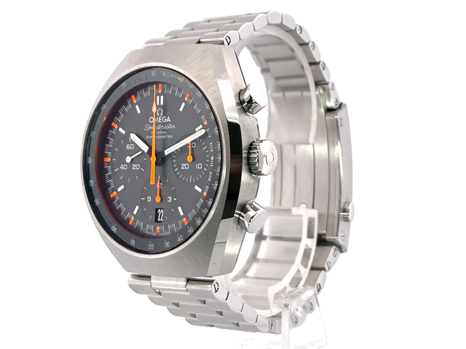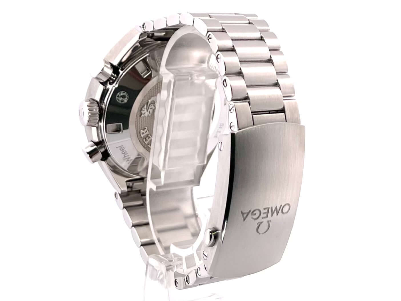 Gehäuse aus Edelstahl poliert und satiniert, Gehäusedruchmesser 42.4 x 46.2 mm, Edelstahl Lünette, Edelstahl Armband satiniert mit Faltschließe, graues Zifferblatt mit aufgesetzten Leuchtindizes, Leuchtzeiger, Automatik, Kaliber Omega 3330 mit 31 Steine, Schwingung 28.800 A/h, Gangreserve 52 Stunden, Datum, Chronograph, Chronometer, Saphirglas doppelseitig entspiegelt, Edelstahlboden verschraubt und graviert, Wasserdicht bis zu 10 bar.