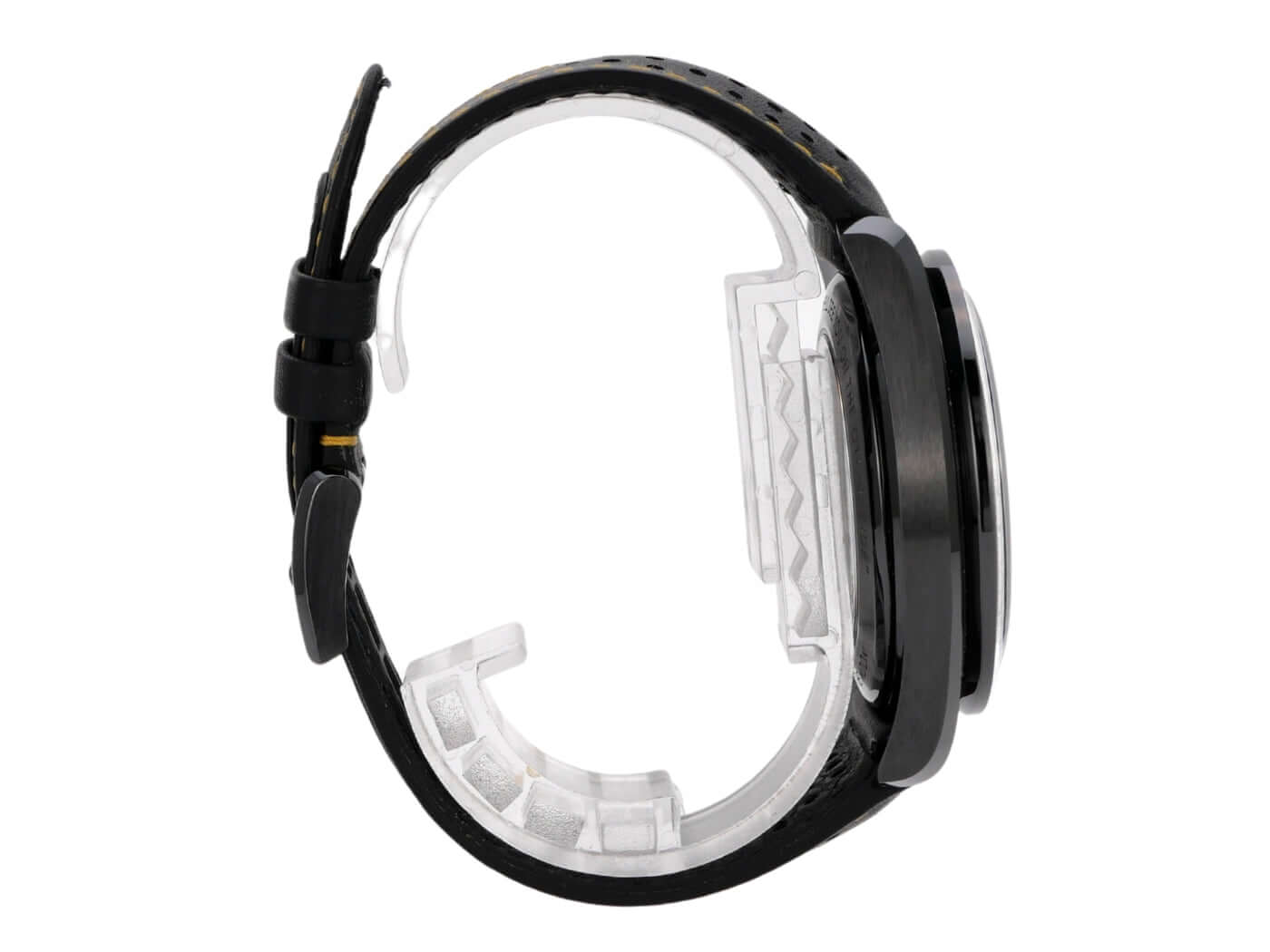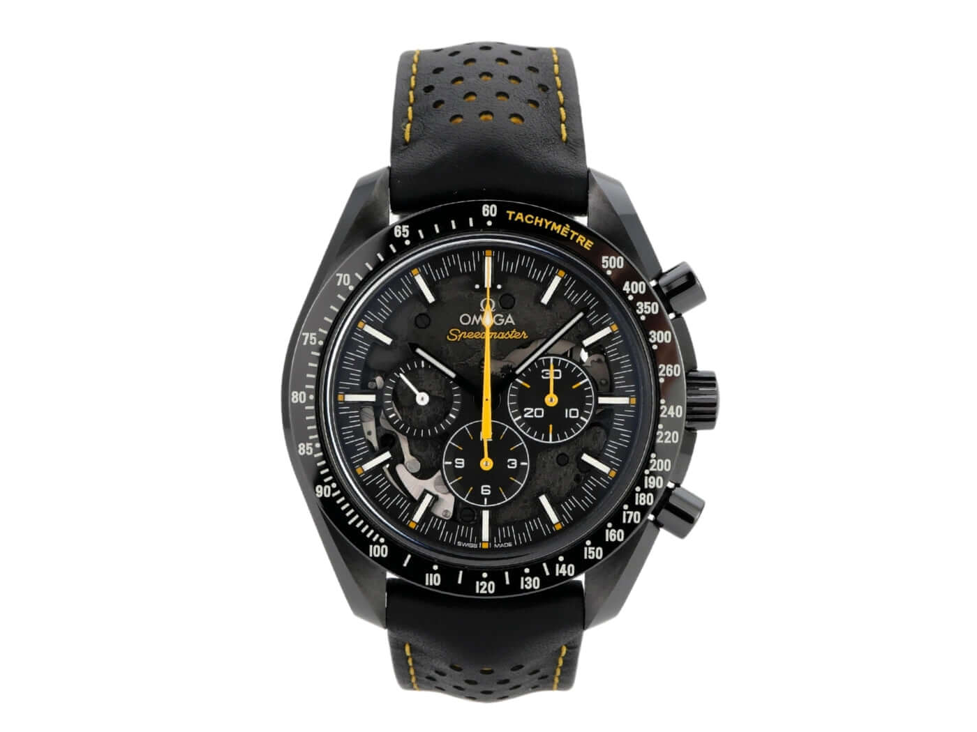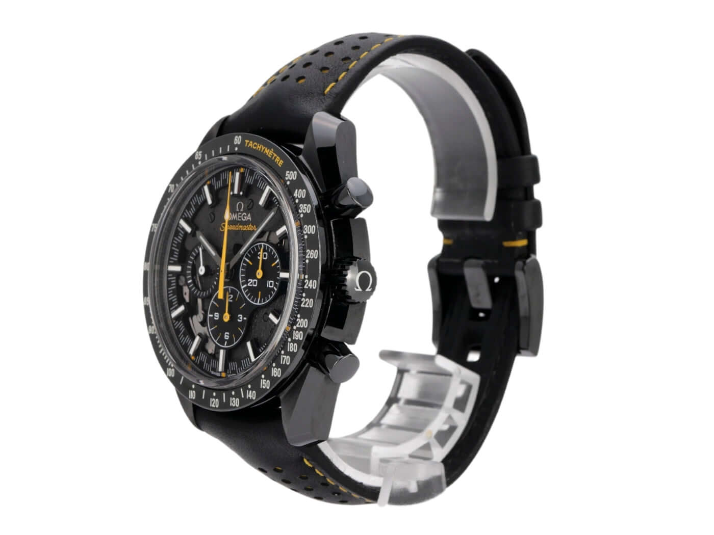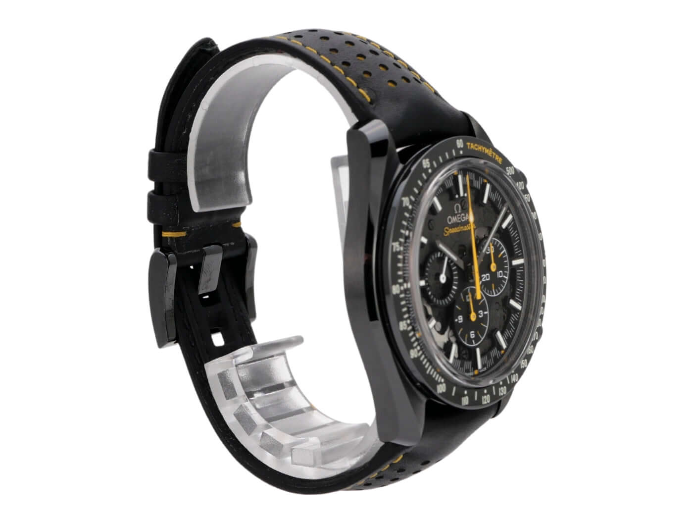 Gehäuse aus schwarzem Keramik, Gehäusedurchmesser 44,25 mm, Keramiklünette, skelettiertes Zifferblatt, schwarzes Lederarmband mit gelben Ziernähten und Faltschließe, Handaufzug, Omega Co-Axial-Kaliber 1869, Chronograph, Gangreserve ca. 48 Stunden, kleine Sekunde, Kratzresistentes Saphirglas, Gehäuseboden mit Saphirglasfenster, wasserdicht bis zu 5 bar.