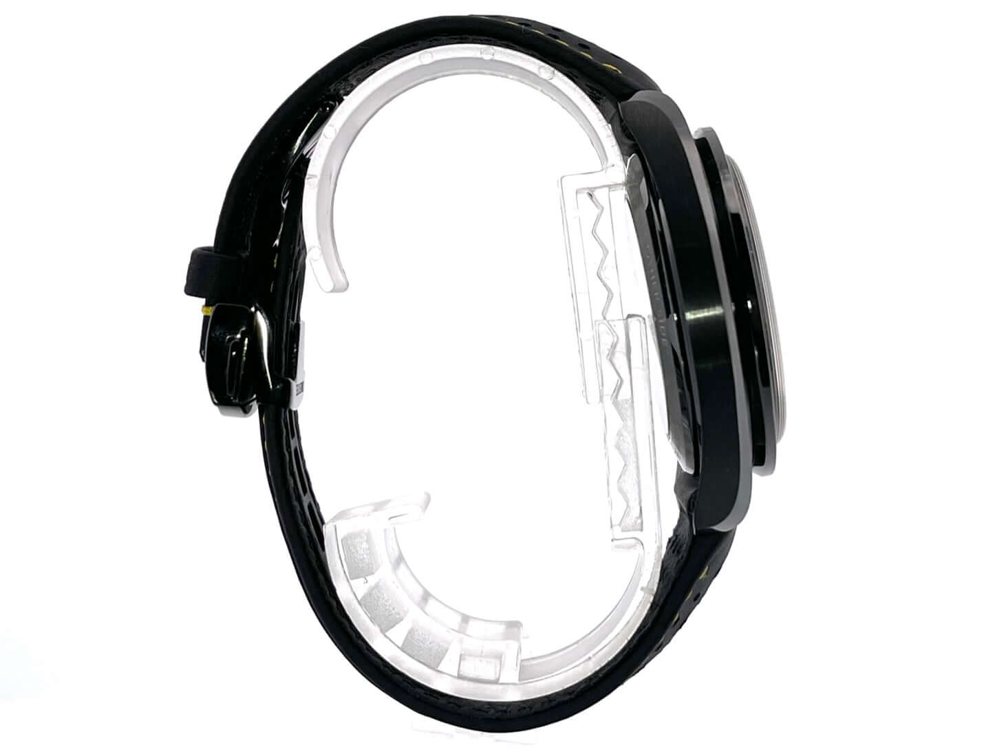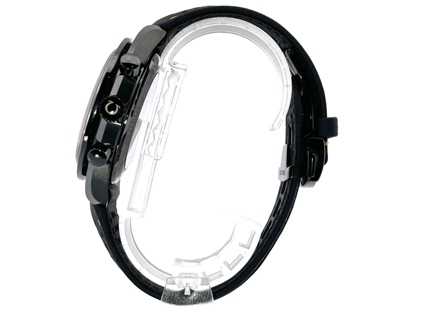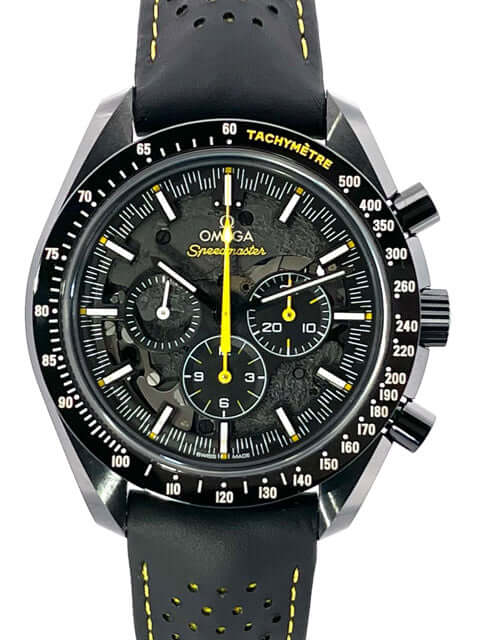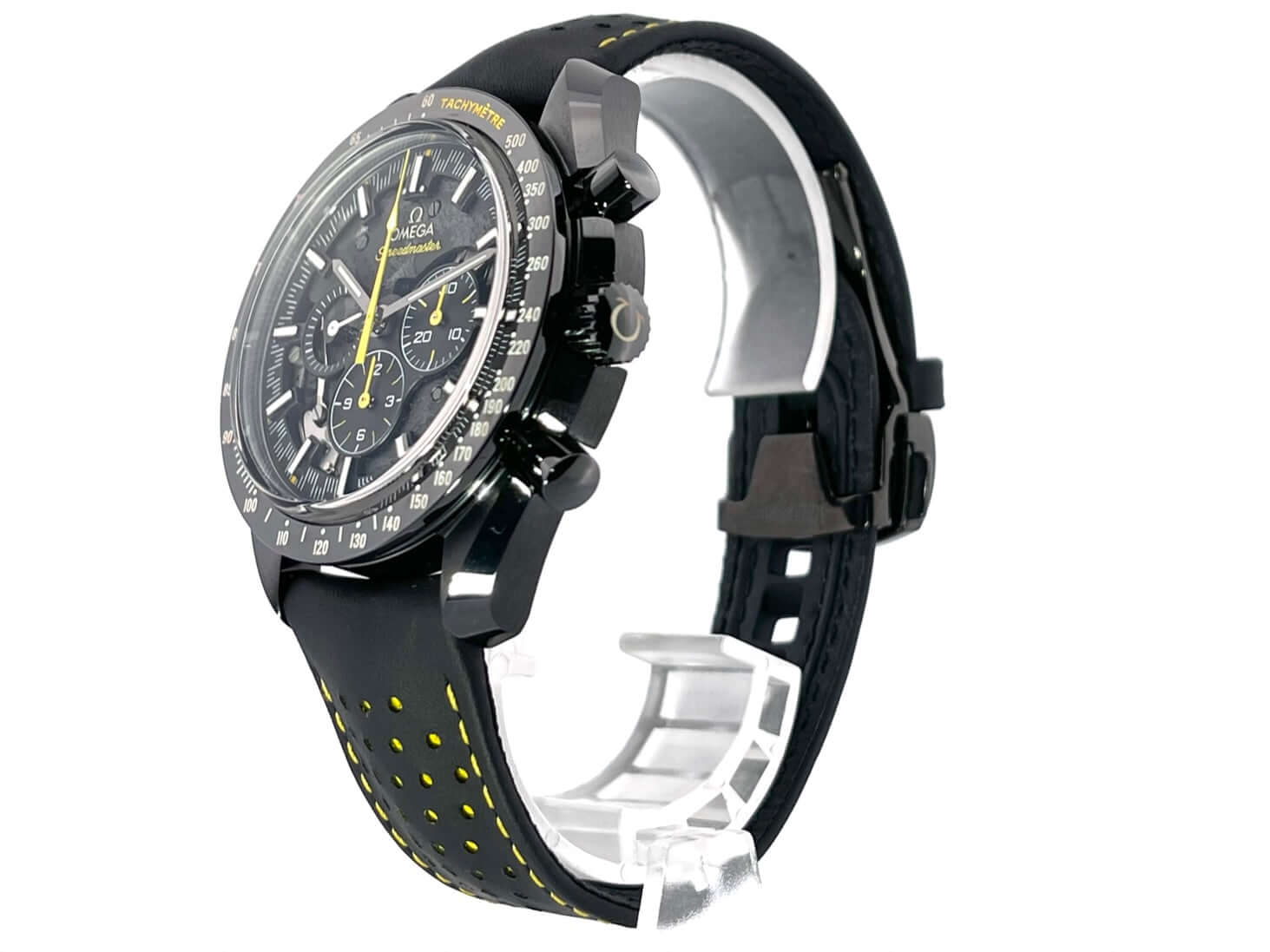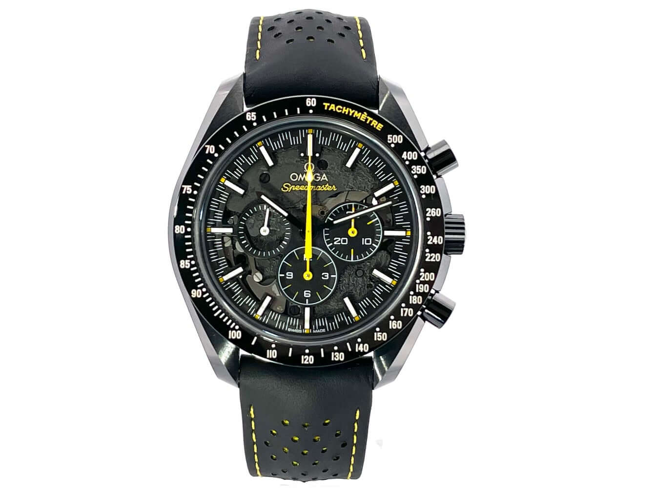 Gehäuse aus schwarzem Keramik, Gehäusedurchmesser 44.25 mm, Keramiklünette, skelettiertes Zifferblatt, schwarzes Lederarmband mit gelben Ziernähten und Faltschließe, Handaufzug, Omega Co-Axial-Kaliber 1869, Chronograph, Gangreserve ca. 48 Stunden, Kleine Sekunde, Kratzresistentes Saphirglas, Gehäuseboden mit Saphirglasfenster, Wasserdicht bis zu 5 bar.