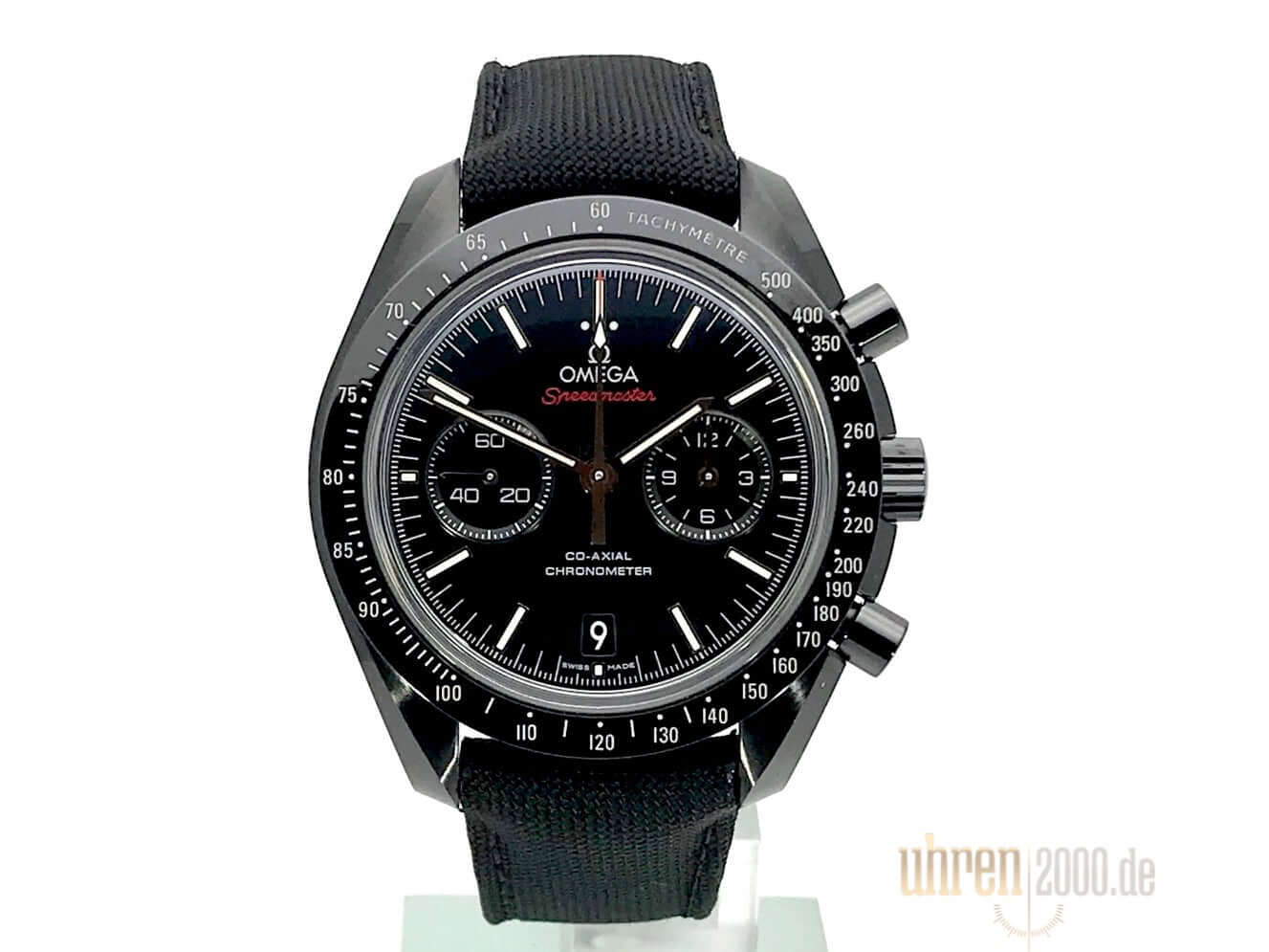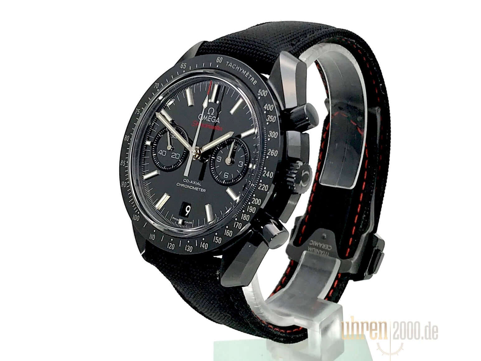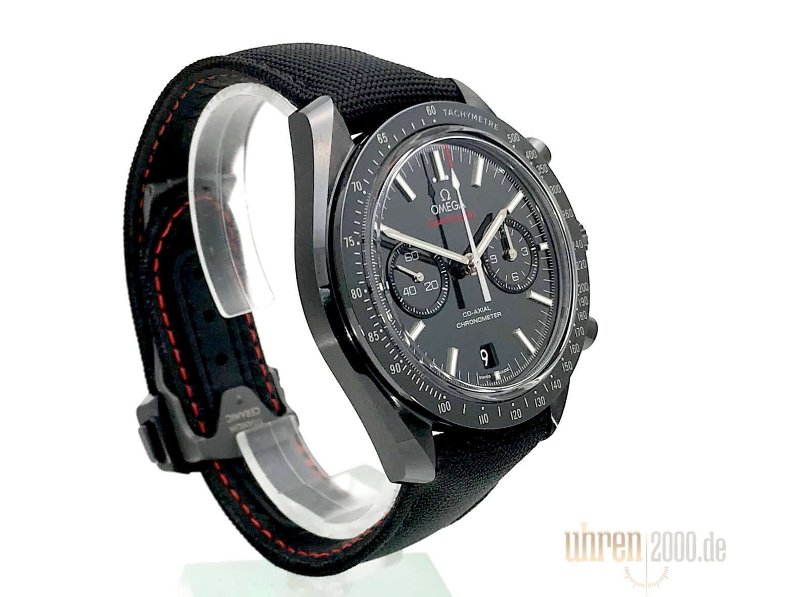 Gehäuse aus schwarzem Keramik, Gehäusedurchmesser 44,25 mm, schwarzes Keramik Zifferblatt aus Zirkoniumoxid, Nylonarmband mit roten Ziernähten und Titan Faltschließe, Automatikwerk, Omega Co-Axial-Kaliber 9300 mit Säulenradmechanismus, Gangreserve ca. 60 Stunden, kratzresistentes Saphirglas in Boxform, Chronometer, Chronograph, Datumsanzeige, Kleine Sekunde, Tachymeter, Transparenter Gehäuseboden aus Saphirglas, Wasserdicht bis zu 5 bar.