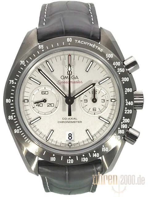 Gehäuse aus grauem Keramik, Durchmesser 44.25 mm, Zifferblatt aus sandgestrahltem Platin, Krokodilleder Armband mit Ziernähten und grauer Dornschließe, Automatikwerk, Omega Co-Axial-Kaliber 9300, Si14-Silizium-Unruh-Spiralfeder, Chronometer, Chronograph, Gangreserve ca. 60 Stunden, Kratzresistentes Saphirglas, Datumsanzeige, Kleine Sekunde, Tachymeter, Gehäuseboden mit Saphirglasfenster, Wasserdicht bis zu 5 bar.