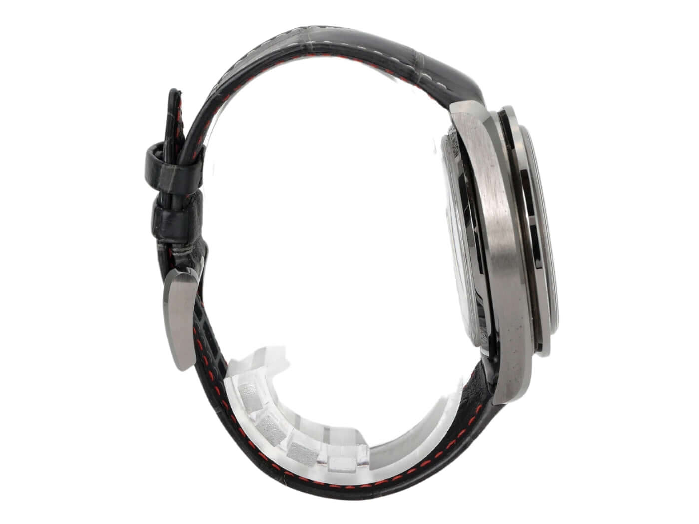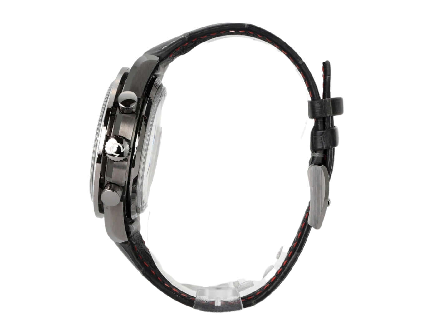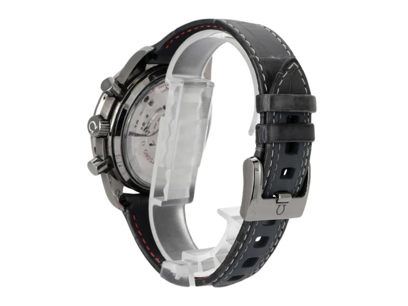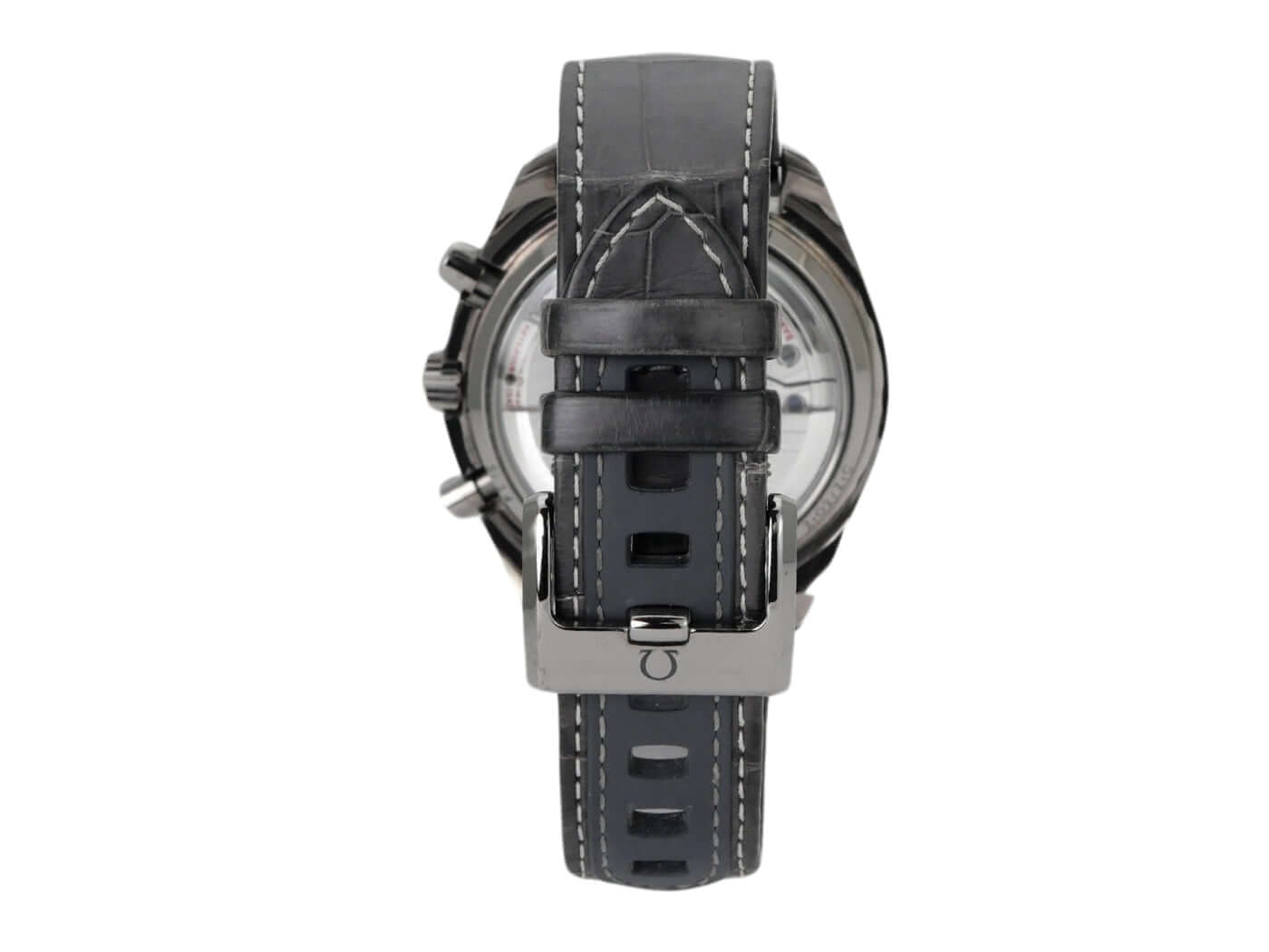 Gehäuse aus grauem Keramik, Durchmesser 44.25 mm, Zifferblatt aus sandgestrahltem Platin, Krokodilleder Armband mit Ziernähten und grauer Dornschließe, Automatikwerk, Omega Co-Axial-Kaliber 9300, Si14-Silizium-Unruh-Spiralfeder, Chronometer, Chronograph, Gangreserve ca. 60 Stunden, Kratzresistentes Saphirglas, Datumsanzeige, Kleine Sekunde, Tachymeter, Gehäuseboden mit Saphirglasfenster, Wasserdicht bis zu 5 bar.