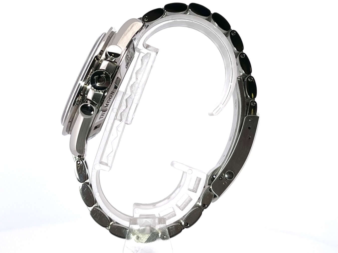 Gehäuse aus Edelstahl poliert und satiniert, Gehäusedurchmesser 42 mm, Gehäusehöhe 14,3 mm, Edelstahl Lünette mit schwarzer Einlage und Tachymeterskala, Edelstahlband poliert und satiniert mit Sicherheitsfaltschließe, schwarzes Zifferblatt mit aufgesetzten Leuchtindexen, Leuchtzeiger, Uhrwerk Handaufzug, Kaliber Omega 1866 mit 17 Steine, 21.600 A/h, Gangreserve ca. 48 Stunden, Chronograph, Moonphase, Saphirglas doppelseitig entspiegelt, Edelstahlboden verschraubt, graviert mit Saphirglasboden, Wasserdicht bis zu 5 bar.