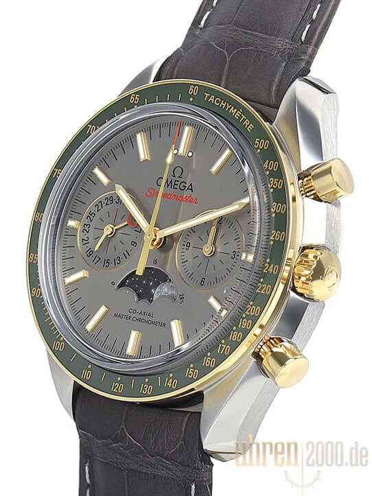Gehäuse aus Edelstahl / Gelbgold poliert und satiniert, Gehäusedurchmesser 44 mm, Gelbgold Lünette mit dunkelgrüner Keramik Einlage und Tachymeterskala, graues Krokolederband mit Sicherheitsfaltschließe, graues Zifferblatt mit Sonnenschliff und aufgesetzten Leuchtindizes, Leuchtzeiger, Automatikwerk, Kaliber Omega 9904, Gangreserve 60 Stunden, Datum, Master Chronometer, Mondphase, Chronograph, kratzfestes Saphirglas, doppelseitig entspiegelt, Saphirglasboden verschraubt, Wasserdicht bis zu 10 bar