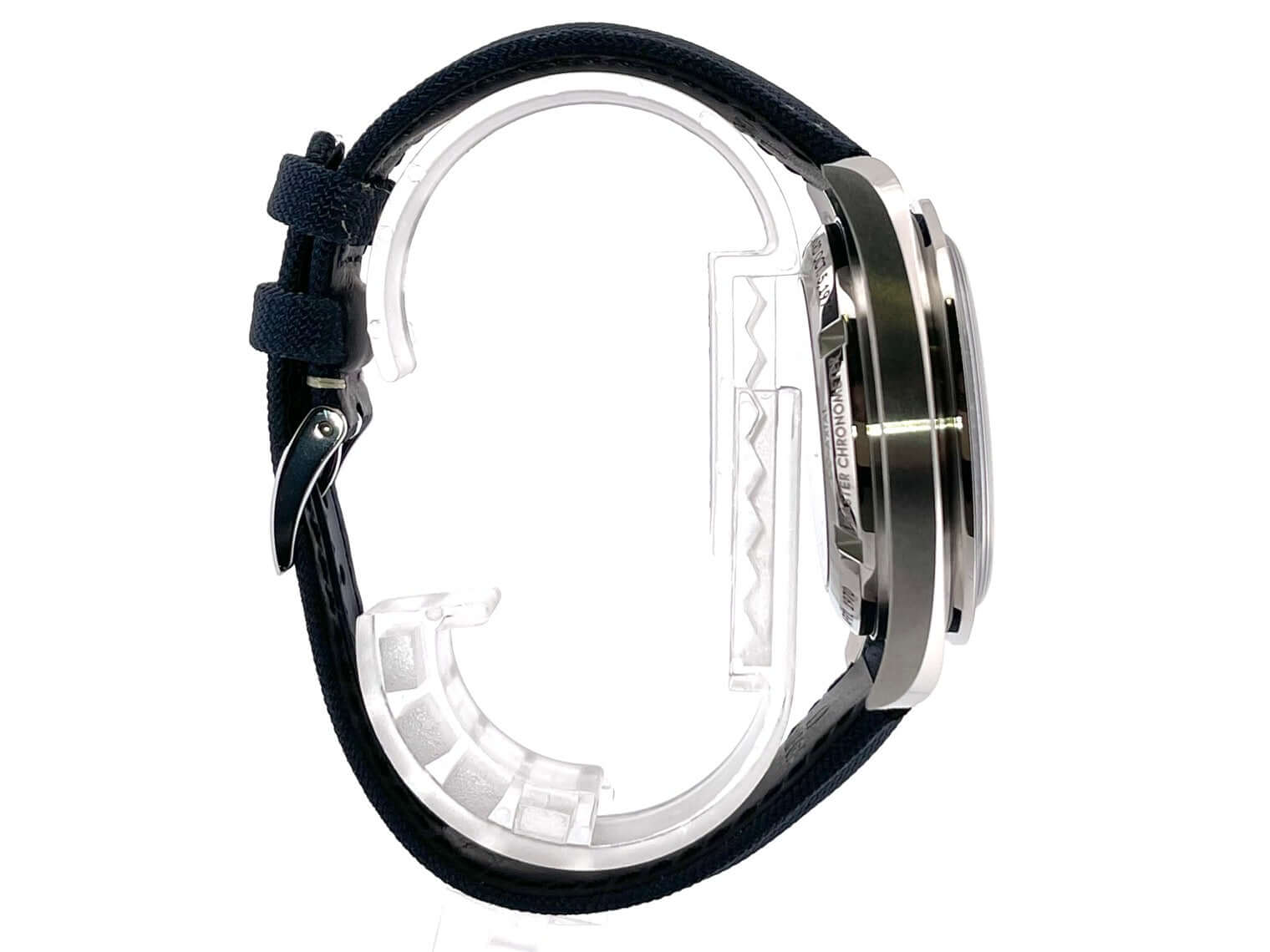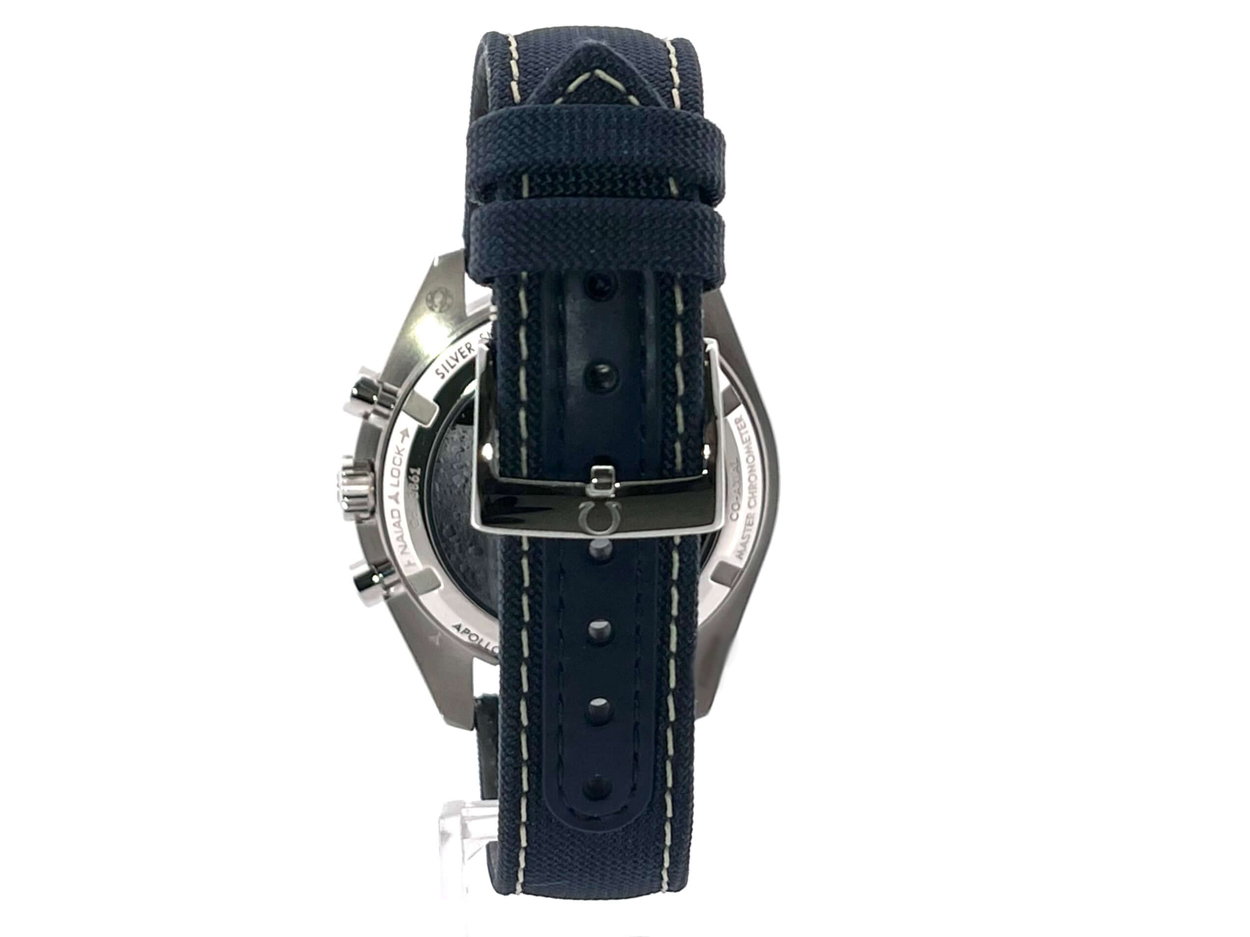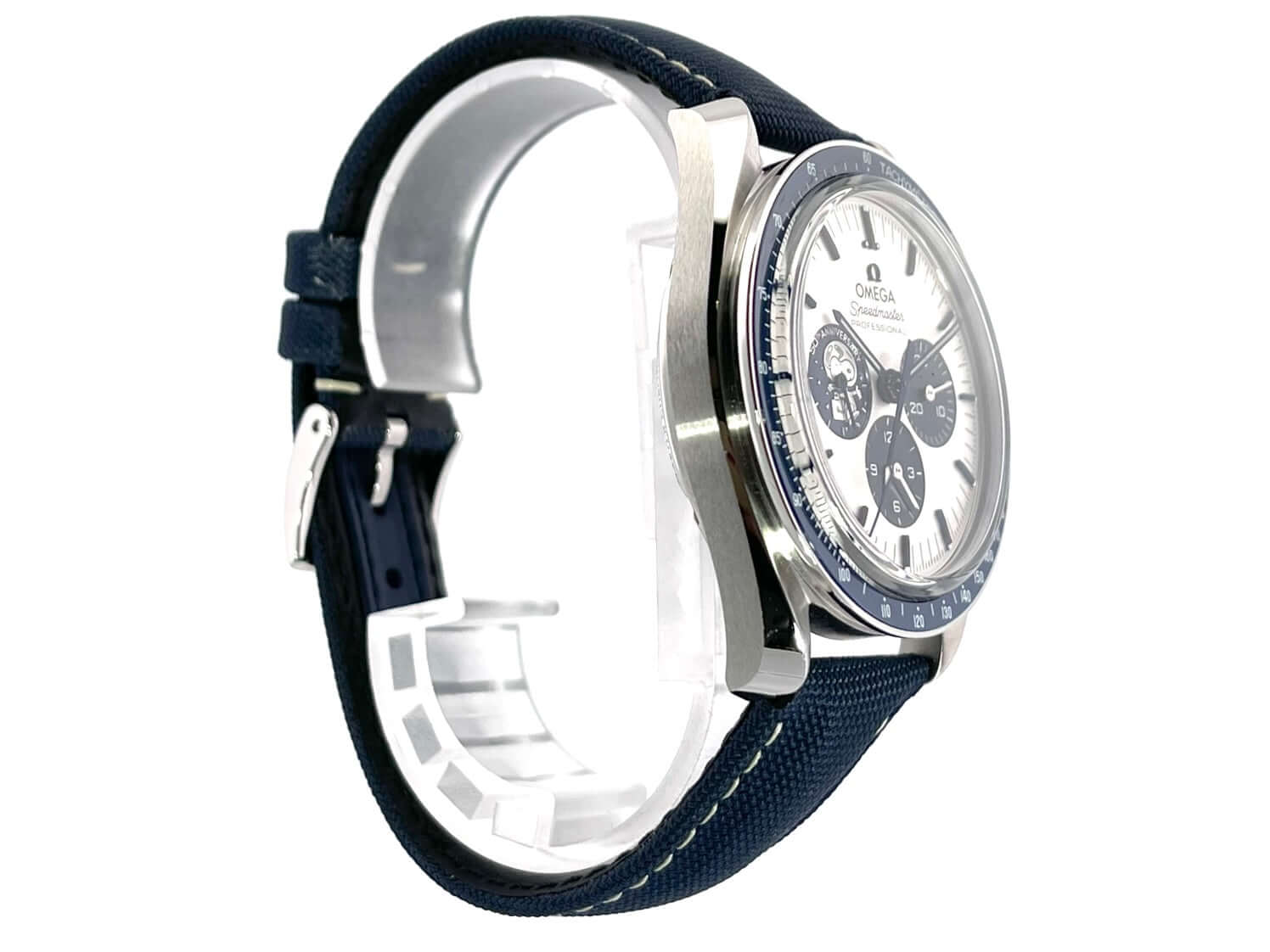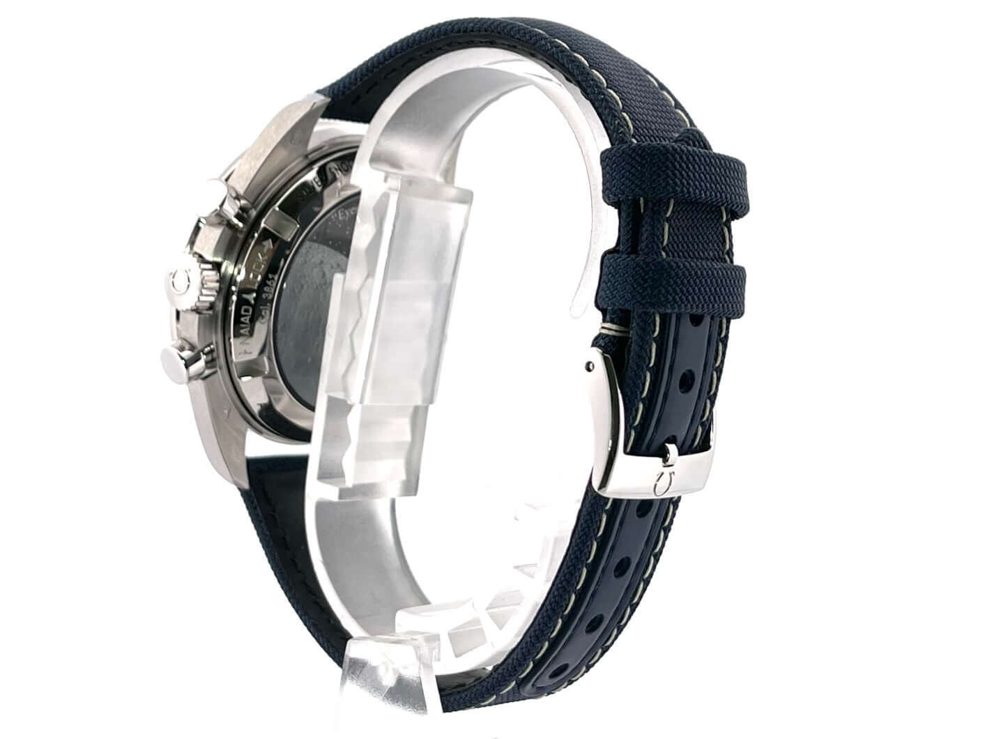 Gehäuse aus Edelstahl poliert und satiniert, Gehäusedurchmesser 42 mm, Gehäusehöhe 14,3 mm, Edelstahl Lünette mit blauer Einlage und Tachymeterskala, blaues Textilband mit Dornschließe, silberfarbenes Zifferblatt mit aufgesetzten Leuchtindizes, Leuchtzeiger, Uhrwerk Handaufzug, Kaliber Omega 3861 mit 26 Steine, 21.600 A/h, Gangreserve ca. 50 Stunden, Chronograph, Master Chronometer, Saphirglas, Edelstahlboden verschraubt und graviert, Wasserdicht bis zu 5 bar.