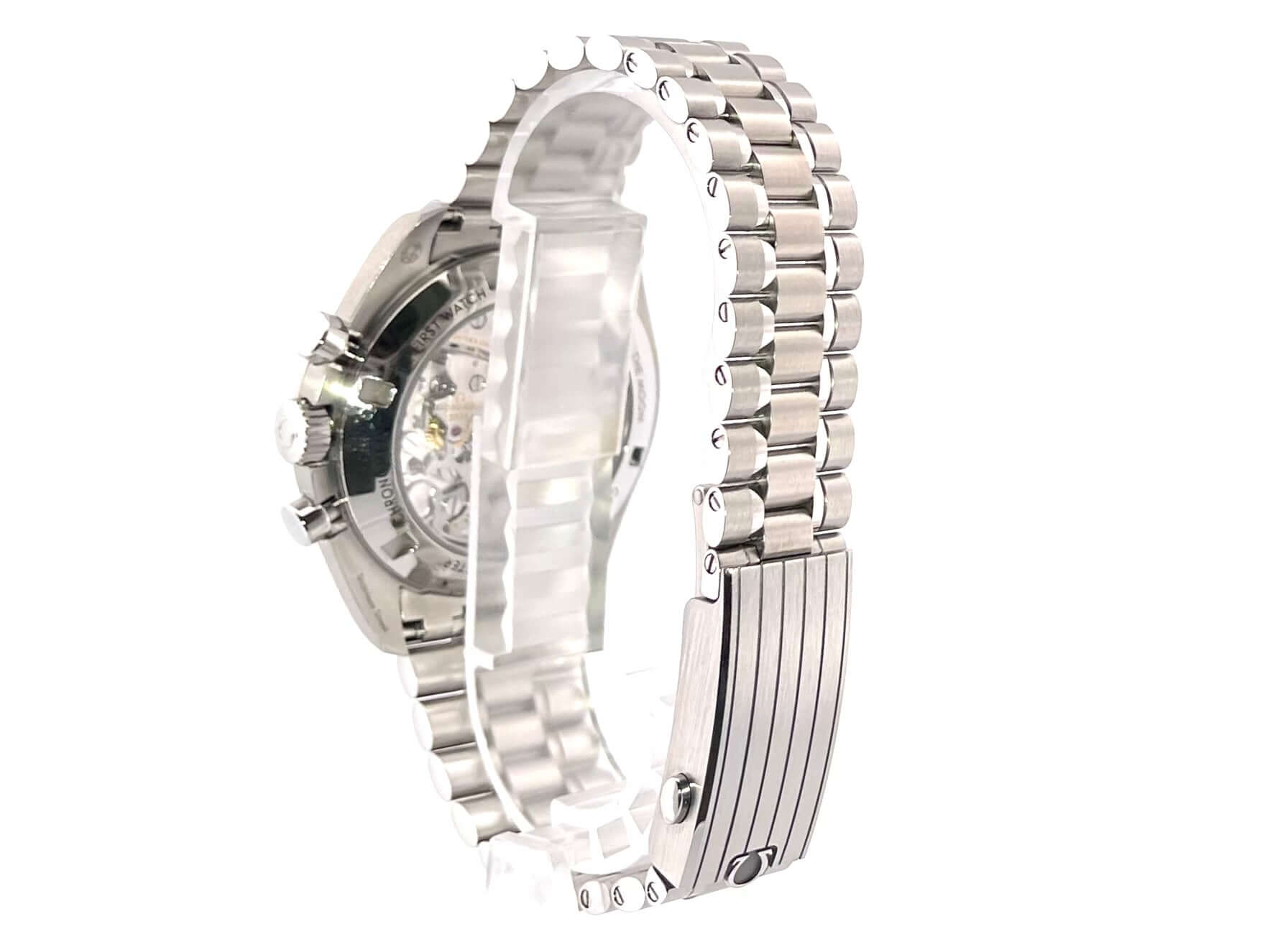 Gehäuse aus Edelstahl poliert und satiniert, Gehäusedurchmesser 42 mm, Gehäusehöhe 14,3 mm, Edelstahl Lünette mit schwarzer Einlage und Tachymeterskala, Edelstahl Armband poliert und satiniert mit Sicherheitsfaltschließe, schwarzes Zifferblatt mit aufgesetzten Leuchtindizes, Leuchtzeiger, Uhrwerk Handaufzug, Kaliber Omega 3861 mit 26 Steine, 21.600 A/h, Gangreserve ca. 50 Stunden, Chronograph, Master Chronometer, Saphirglas, doppelseitig entspiegelt, Edelstahlboden verschraubt, graviert mit Saphirglasboden, Wasserdicht bis zu 5 bar.