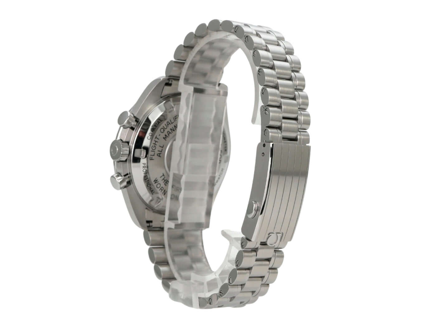 Gehäuse aus Edelstahl poliert und satiniert, Gehäusedurchmesser 42 mm, Gehäusehöhe 14,3 mm, Edelstahl Lünette mit schwarzer Einlage und Tachymeterskala, Edelstahl Armband poliert und satiniert mit Sicherheitsfaltschließe, schwarzes Zifferblatt mit aufgesetzten Leuchtindizes, Leuchtzeiger, Handaufzug, Kaliber Omega 3861 mit 26 Steine, 21.600 A/h, Gangreserve ca. 50 Stunden, Chronograph, Master Chronometer, Hesalitglas, Edelstahlboden verschraubt und graviert, wasserdicht bis zu 5 bar.