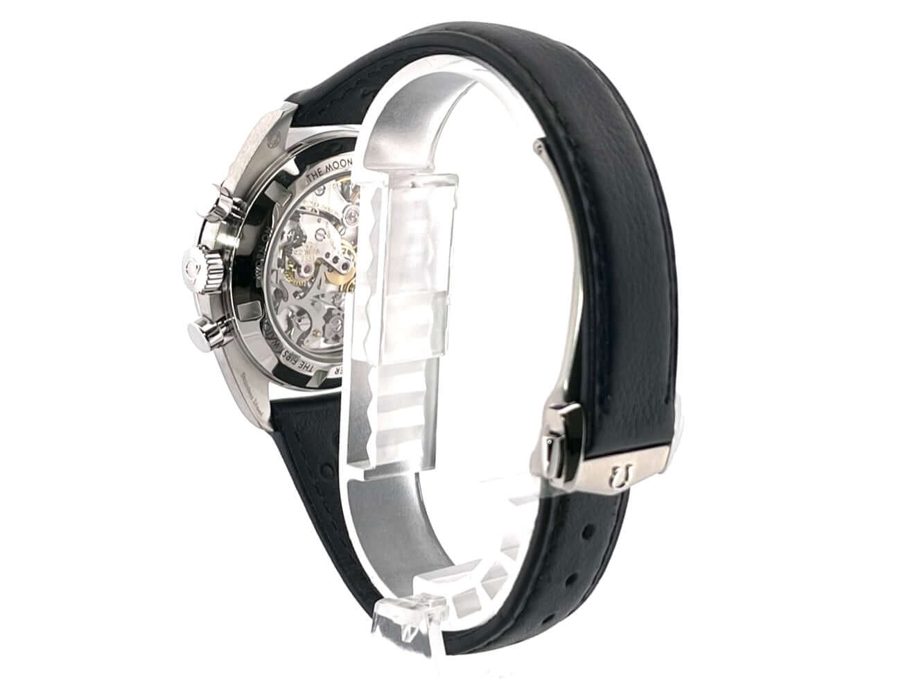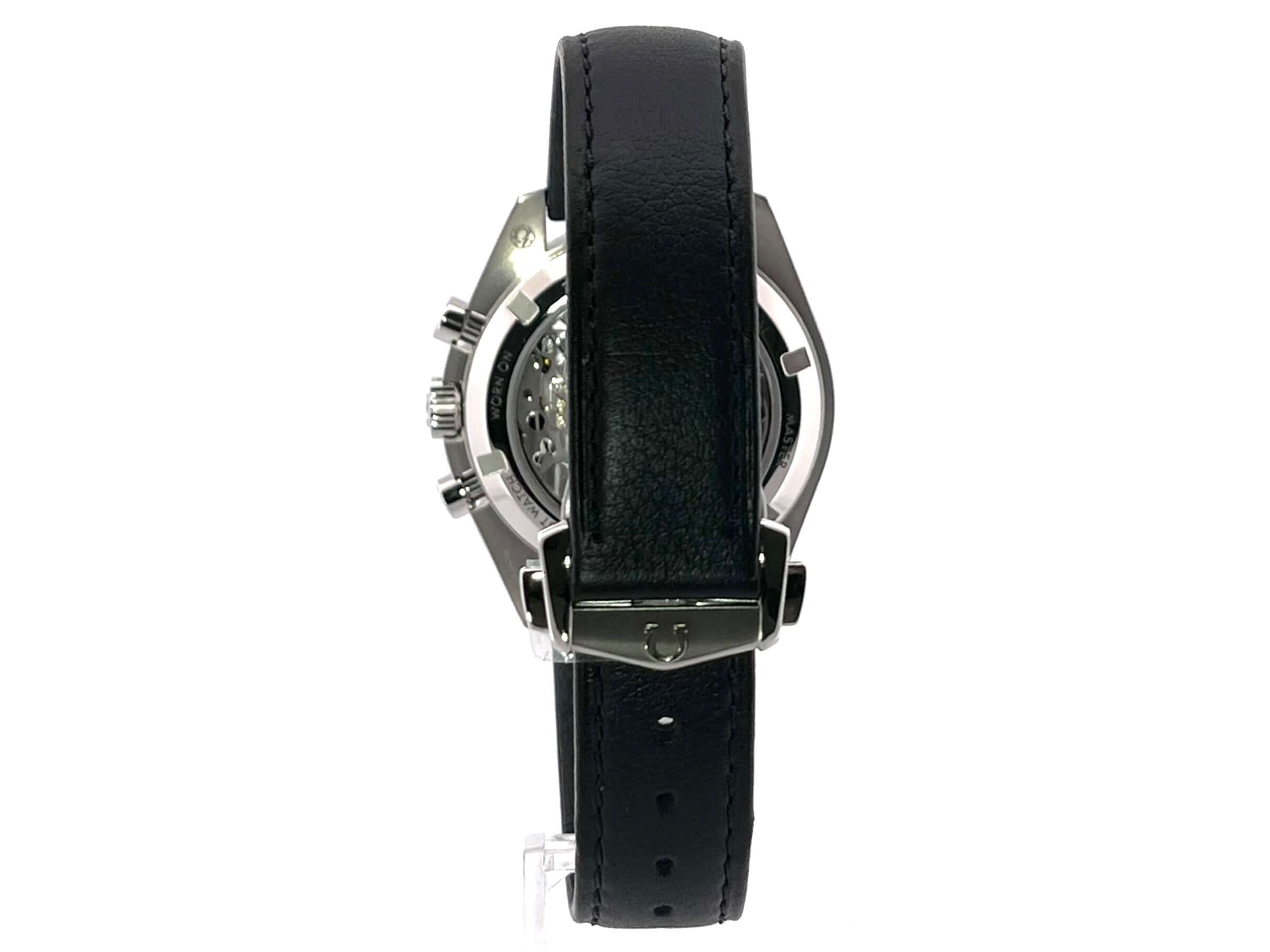 Gehäuse aus Edelstahl poliert und satiniert, Gehäusedurchmesser 42 mm, Gehäusehöhe 14,3 mm, Edelstahl Lünette mit schwarzer Einlage und Tachymeterskala, schwarzes Lederarmband mit Faltschließe, schwarzes Zifferblatt mit aufgesetzten Leuchtindizes, Leuchtzeiger, Uhrwerk Handaufzug, Kaliber Omega 3861 mit 26 Steine, 21.600 A/h, Gangreserve ca. 50 Stunden, Chronograph, Master Chronometer, Saphirglas, Edelstahlboden verschraubt und graviert mit Saphirglas, Wasserdicht bis zu 5 bar.