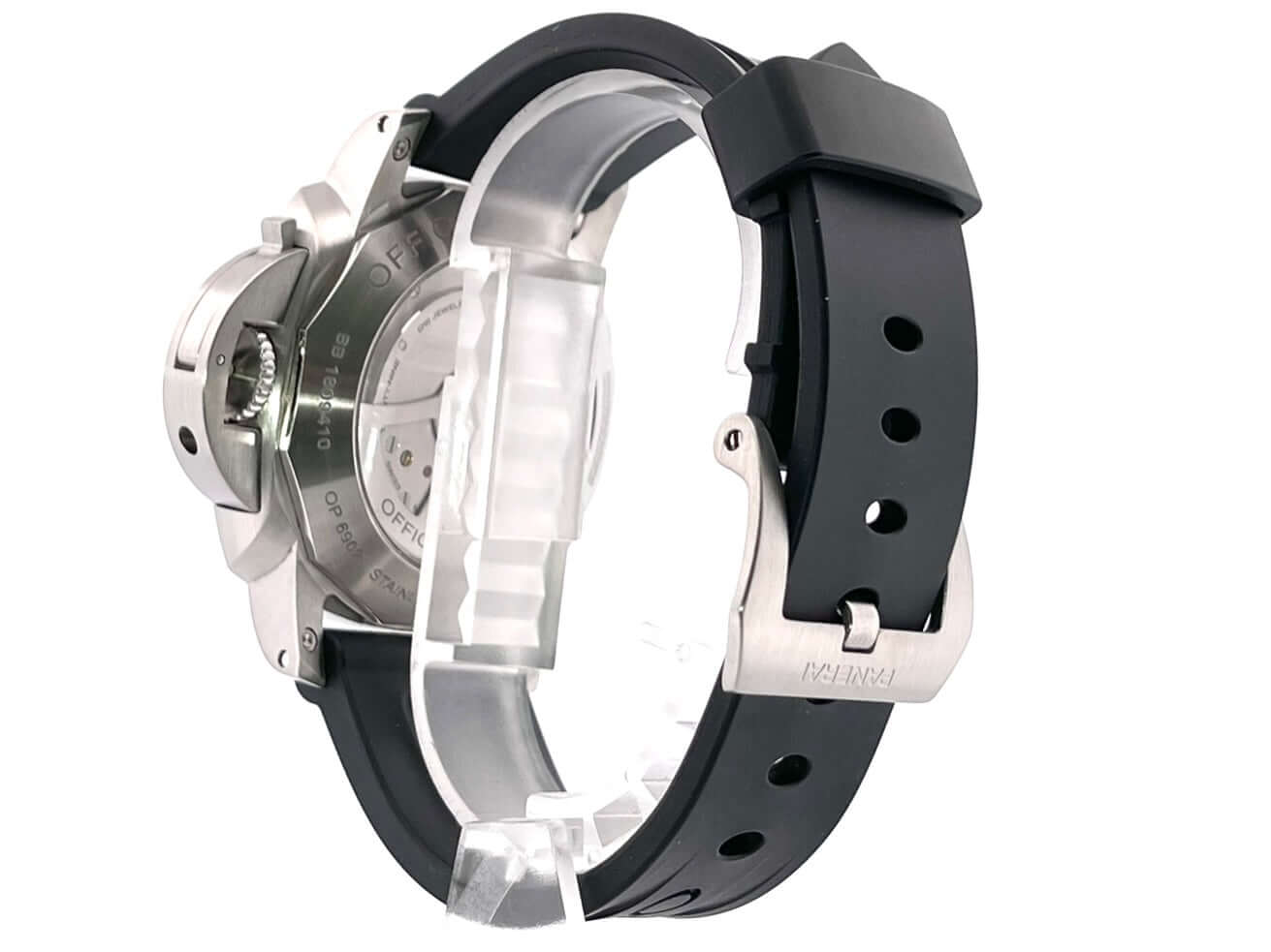 Gehäuse aus Edelstahl satiniert, Gehäusedurchmesser 44 mm, Edelstahl Lünette poliert, schwarzes Kautschukband mit Dornschließe aus satiniertem Edelstahl, zusätzlich schwarzes Lederarmband, schwarzes Zifferblatt mit arabischen Ziffern und Indizes, Datumsanzeige auf 3 Uhr, Sekundenanzeige auf 9 Uhr, Gangreserveanzeige auf 5 Uhr, Automatikwerk, Kaliber Panerai P.9002, Panerai Eigenfertigung, 29 Steine, Glucydur-Unruh, Schwingung 28.800 A/h., Gangreserve 72 Stunden, Incabloc-Stoßsicherung, kleine Sekunde, Datumsanzeige, GMT/Zweite Zeitzone, Gangreserveanzeige, Sekundenrückstellung, entspiegeltes Saphirglas aus Korund 2,6 mm stark, Gehäuseboden aus Edelstahl mit transparentem Saphirglas, Wasserdicht bis zu 30 bar.