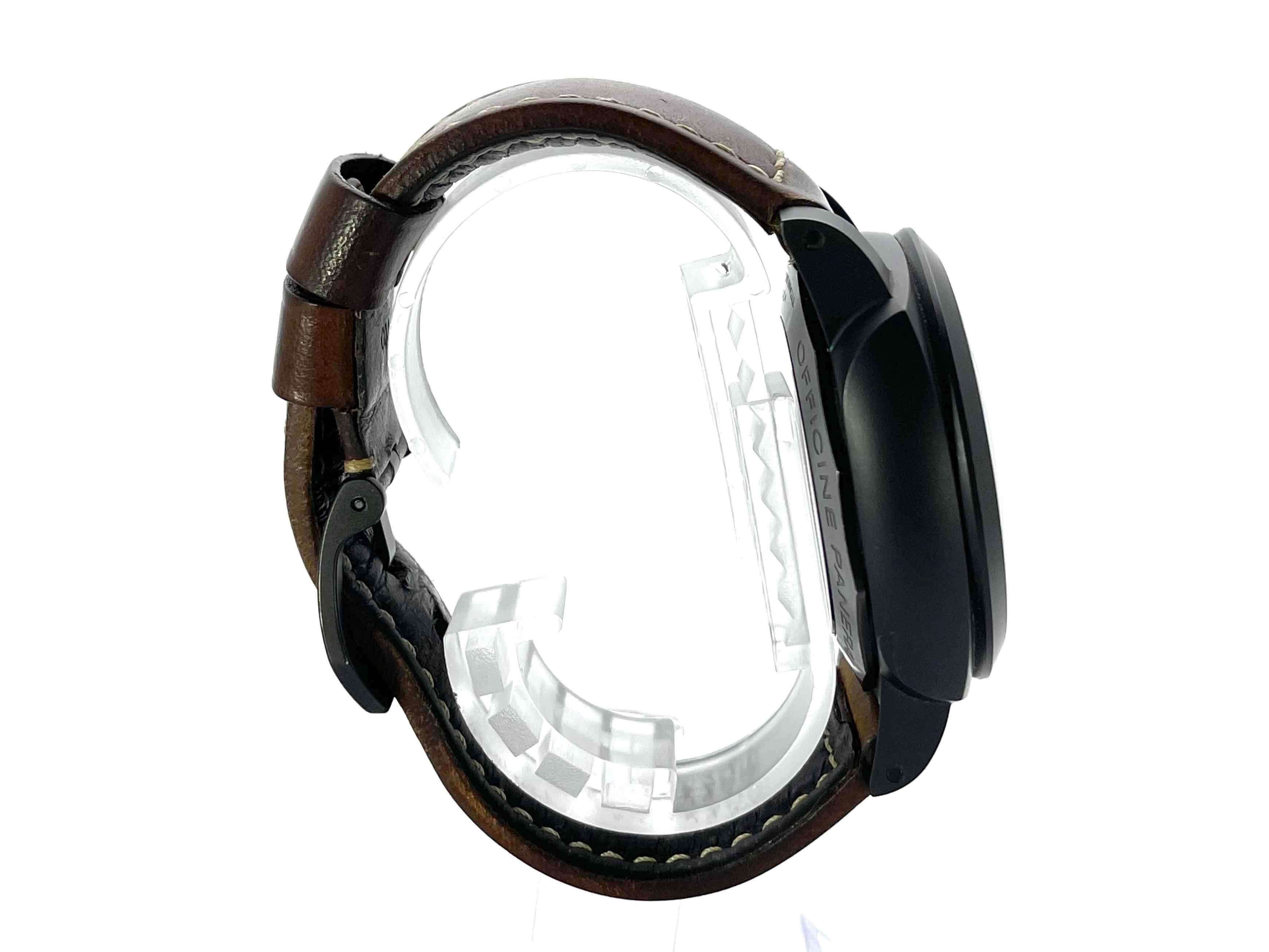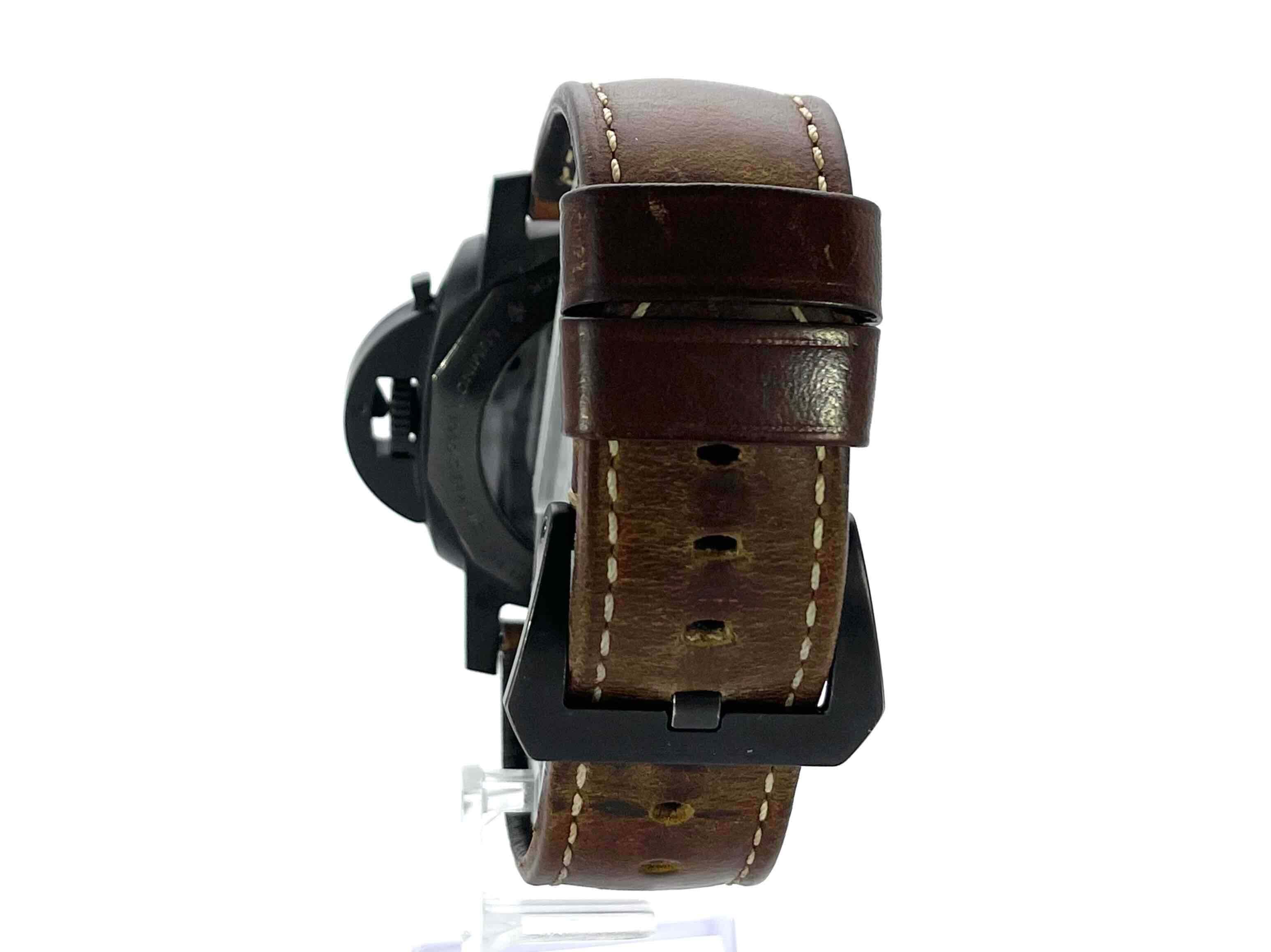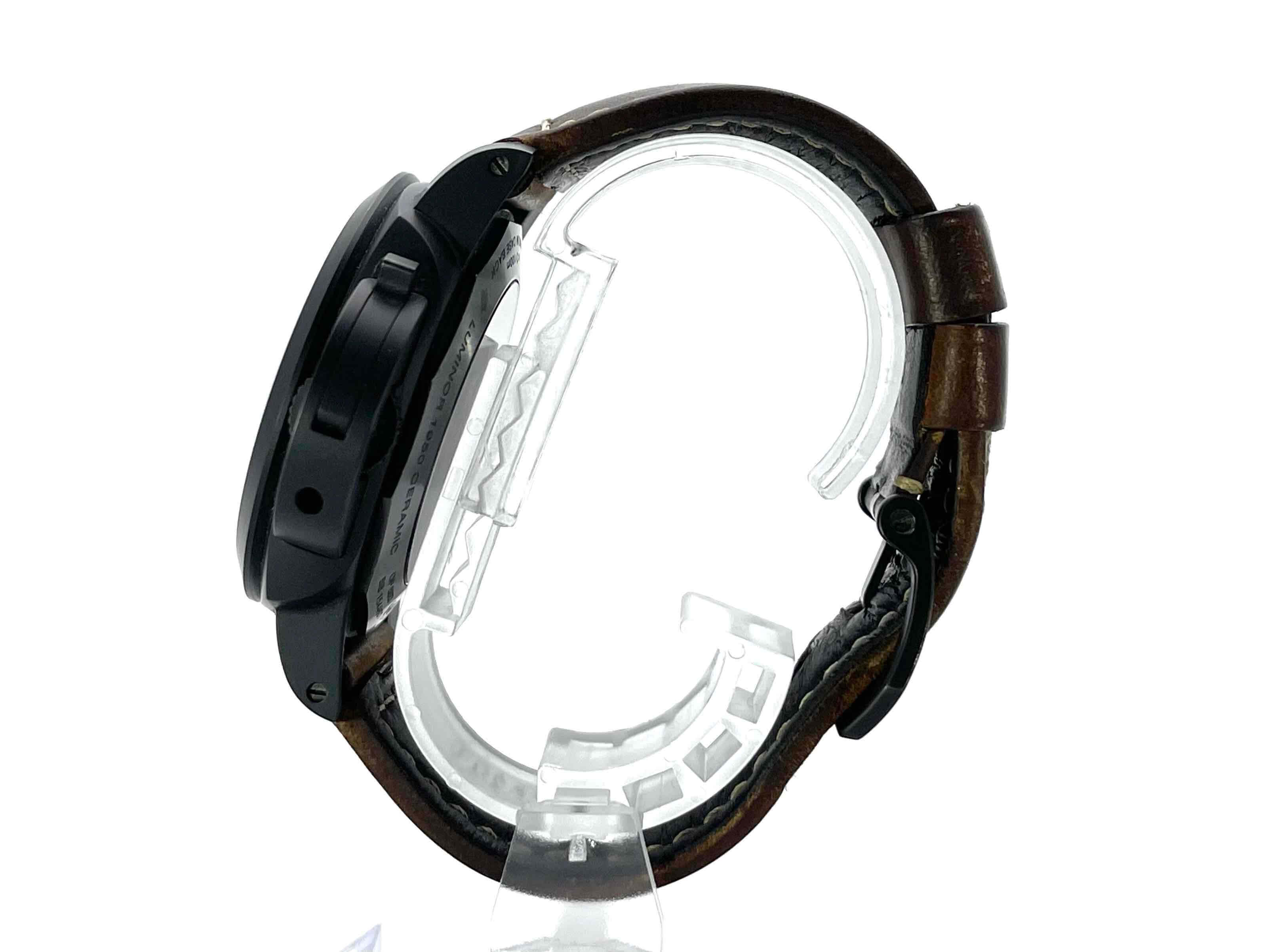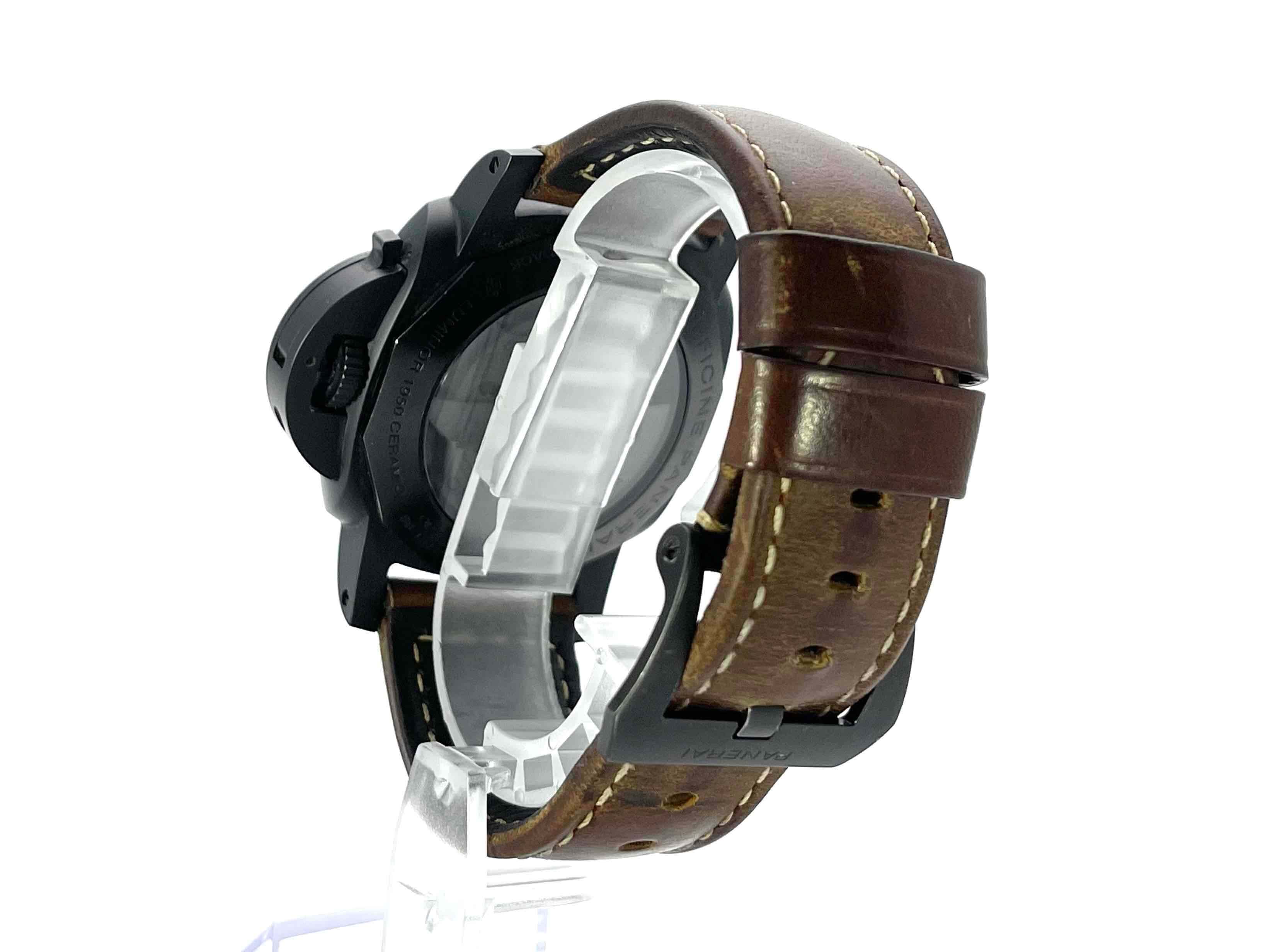 Gehäuse aus schwarzem Keramik, Gehäusedurchmesser 44 mm, Lünette Keramik schwarz, braunes Lederband mit Dornschließe aus mattem Titan, extra schwarzes Kautschukband, schwarzes Zifferblatt mit fluoreszierenden arabischen Ziffern, Automatikuhrwerk, Kaliber Panerai P.9001, vollständige Panerai Eigenfertigung, 29 Steine, 28.800 A/h., Gangreserve 72 Stunden, kleine Sekundenanzeige, Datumsanzeige, zweite Zeitzone, Gangreserveanzeige auf der Gehäuserückseite, Kronenschutzbrücke, entspiegeltes Saphirglas aus Korund 2,3 mm stark, Gehäuseboden mit geschwärztem Saphirglas, Wasserdicht bis zu 10 bar.