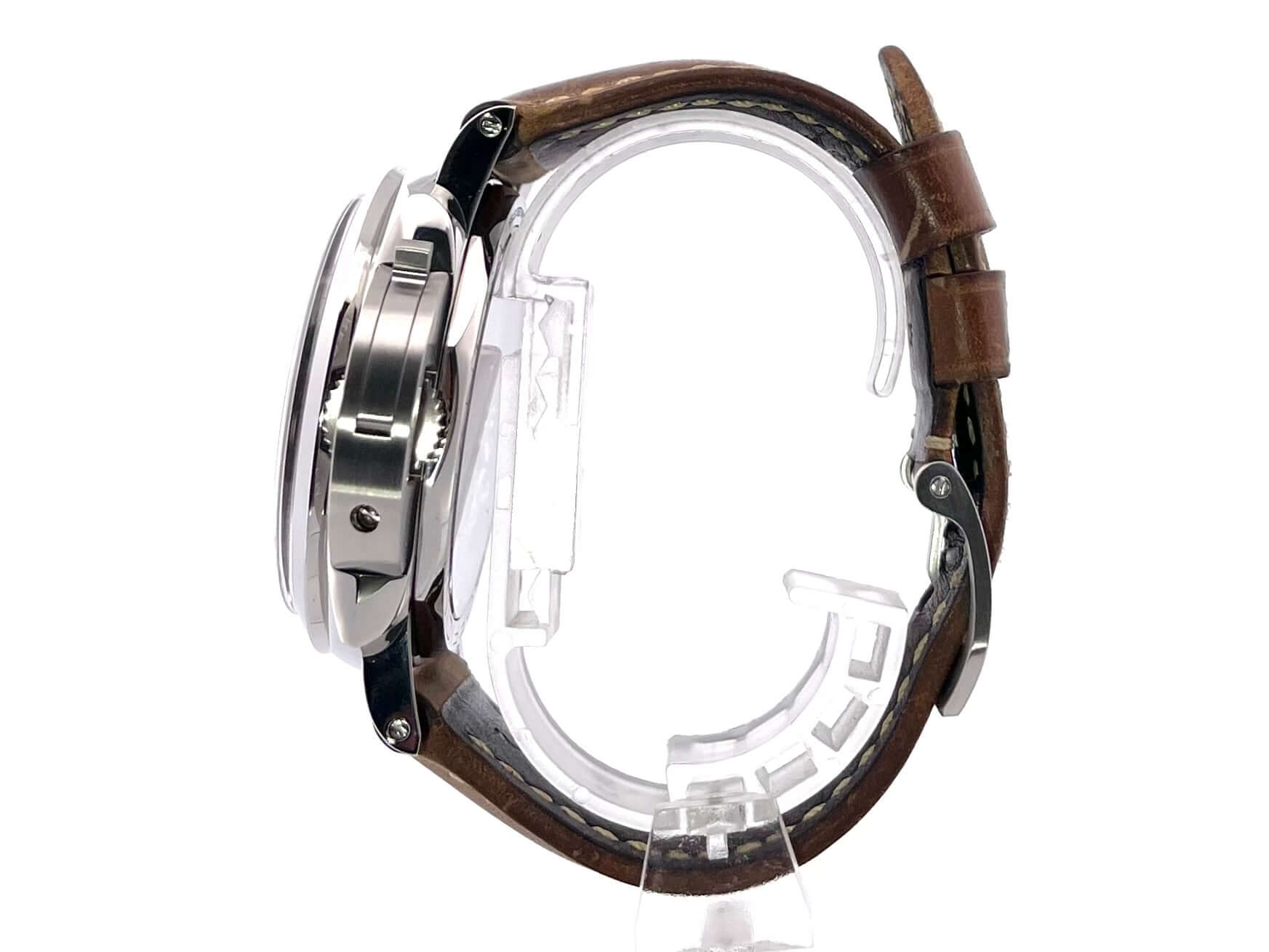 Gehäuse aus Edelstahl poliert, Gehäusedurchmesser 47 mm, Edelstahl Lünette poliert, hellbraunes Lederband mit großer satinierter Dornschließe, schwarzes Zifferblatt mit arabischen Ziffern und Indizes, Mechanisches Uhrwerk mit Handaufzug, Kaliber Panerai P.3002, Panerai Eigenfertigung, 21 Steine, Schwingung 21.600 A/h, Stoßsicherung, Gangreserve 72 Stunden, kleine Sekundenanzeige, Gangreserveanzeige, Sekundenrückstellung, entspiegeltes Saphirglas aus Korund 3 mm stark, Gehäuseboden aus Edelstahl mit Saphirglas, Kronenschutzbrücke aus Edelstahl satiniert, wasserdicht bis zu 10 bar.