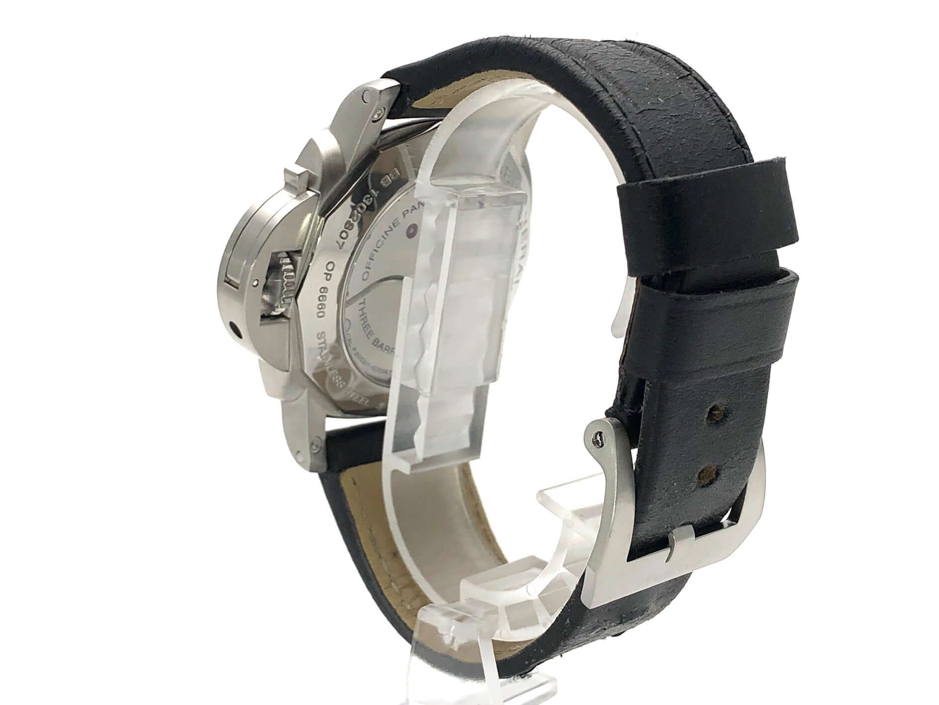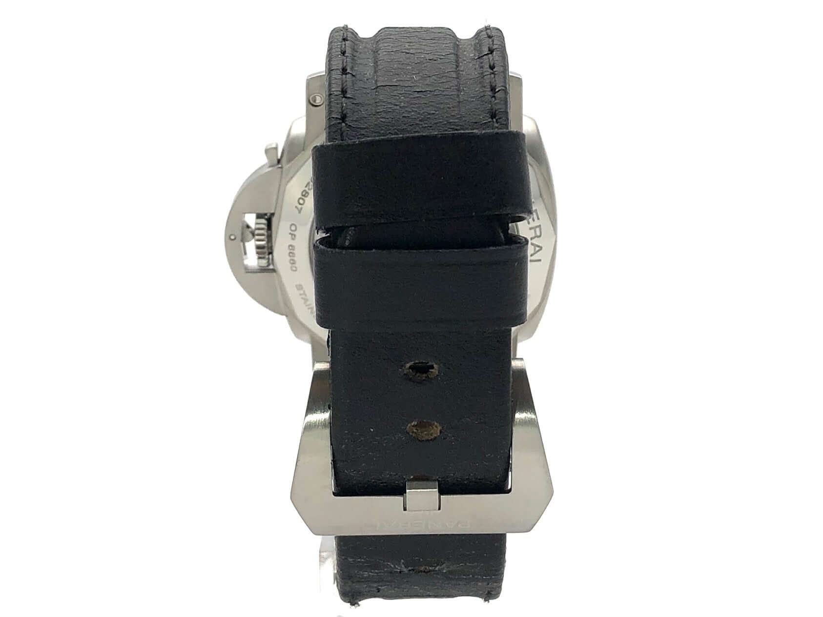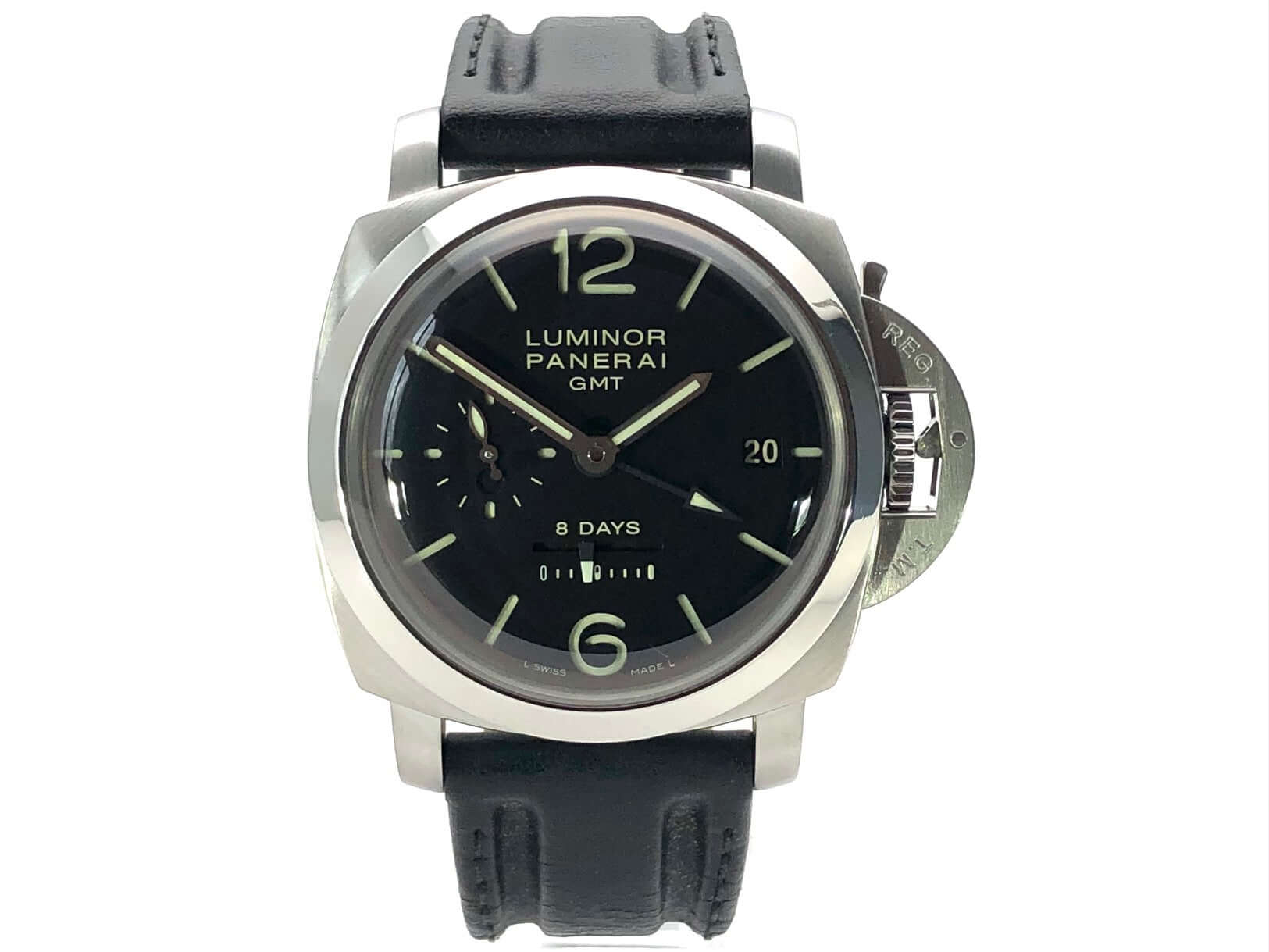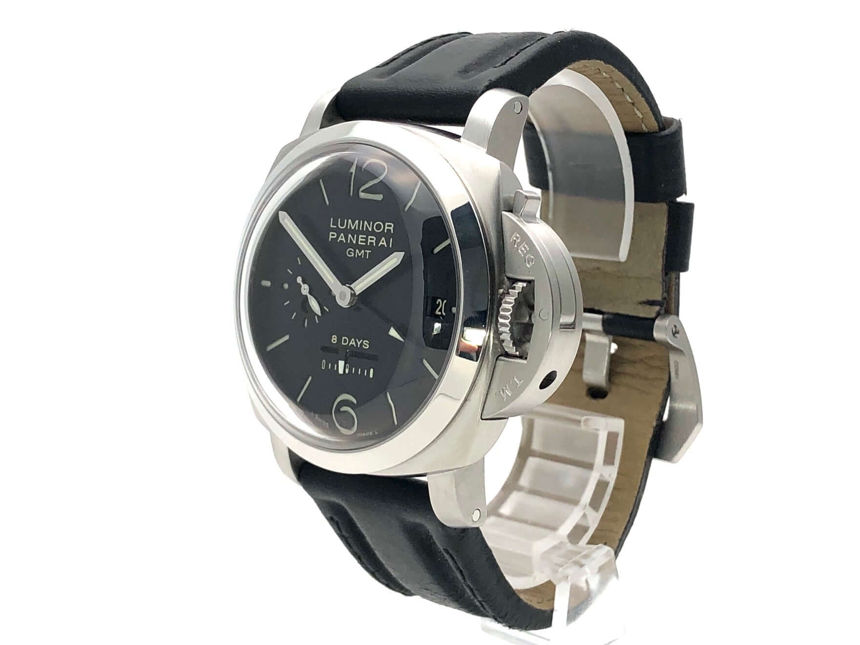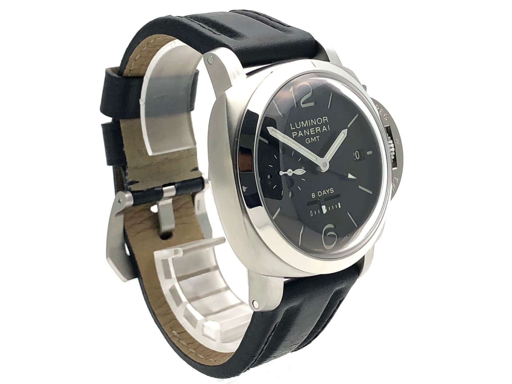Gehäuse aus Edelstahl satiniert, Gehäusedurchmesser 44 mm, Lünette aus Edelstahl poliert, schwarzes Lederband mit Dornschließe aus satiniertem Edelstahl, extra Kautschukband, schwarzes Zifferblatt mit fluoreszierenden arabischen Ziffern und Stundenmarkierungen, Mechanisches Uhrwerk mit Handaufzug, exklusives Kaliber Panerai P.2002 mit 21 Steine, Schwingung 28.800 A/h., Gangreserve für 192 Stunden, Datum, 2 Zeitzone, 24 Stunden Anzeige, lineare Gangreserveanzeige, kleine Sekundenanzeige, Gehäuseboden mit transparentem Saphirglas, entspiegeltes Saphirglas aus Korund 2 mm stark, Wasserdicht bis zu 10 bar.