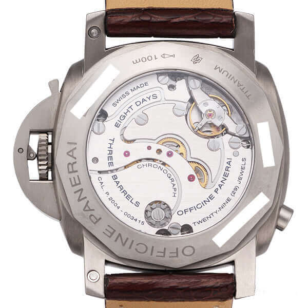Gehäuse aus Titan satiniert, Gehäusedurchmesser 44 mm, Lünette Titan poliert, braunes Alligatorlederarmband mit Dornschließe aus satiniertem Titan, Braunes Zifferblatt mit fluoreszierenden arabischen Ziffern und Stunden-Indexen, Gangreserveanzeige auf 6-Uhr, zentraler Chronographenzeiger, Uhrwerk Handaufzug, Kaliber Panerai P.2004, vollständige Panerai Eigenfertigung, 29 Steine, Schwingung 28.800 A/h., Gangreserve 8 Tage, Stunden, Minuten, kleine Sekundenanzeige, 24-Stunden-Anzeige, lineare Gangreserveanzeige, Sekundenrückstellung, Ein-Drücker-Chronograph mit zwei Zählwerke, Entspiegeltes Saphirglas aus Korund 2 mm stark, Titan Kronenschutzbrücke, Gehäuseboden aus Titan mit transparentem Saphirglas, Wasserdicht bis zu 10 bar.