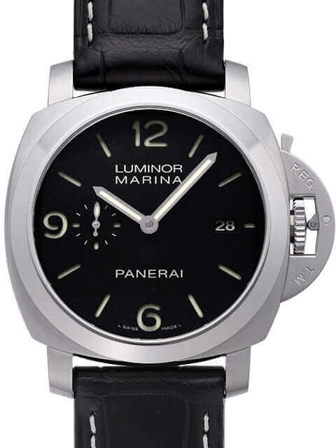 Gehäuse aus Edelstahl satiniert, Gehäusedurchmesser 44 mm, Lünette Edelstahl poliert, schwarzes Alligatorlederarmband mit Dornschließe in satiniertem Edelstahl, schwarzes Zifferblatt mit fluoreszierenden arabischen Zahlen und Stundenmarkierungen, Datum auf 3-Uhr-Position, kleine Sekunde auf 9-Uhr-Position, Automatikuhrwerk, Kaliber Panerai P.9000, exclusive Panerai Eigenanfertigung, 28 Steine, Glucydur-Unruh, 28.800 A/h, Incabloc-Stoßsicherung, 72 Stunden Gangreserve, entspiegeltes Saphirglas aus Korund 2,6 mm stark, Stunden, Minuten, kleine Sekundenanzeige, Datumsanzeige, Kronenschutzbrücke, Edelstahlboden mit transparentem Saphirglas, Wasserdicht bis zu 30 bar.