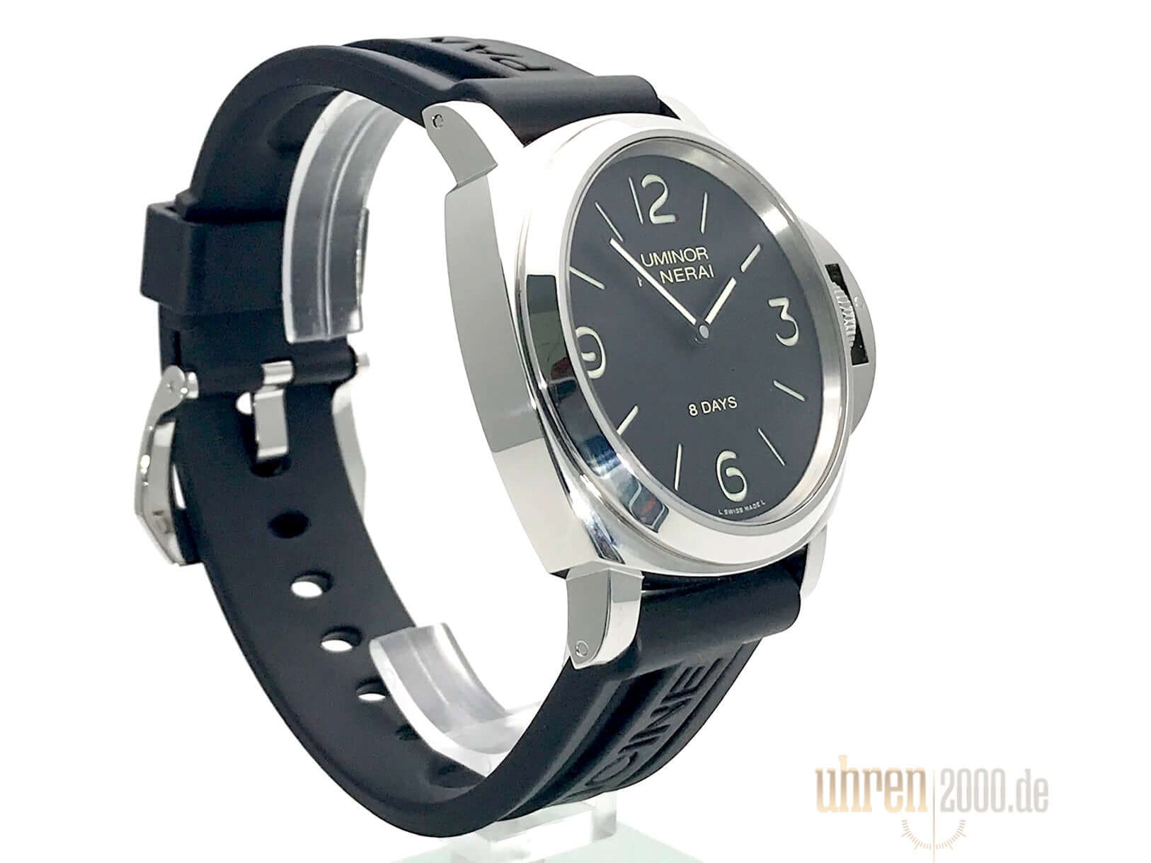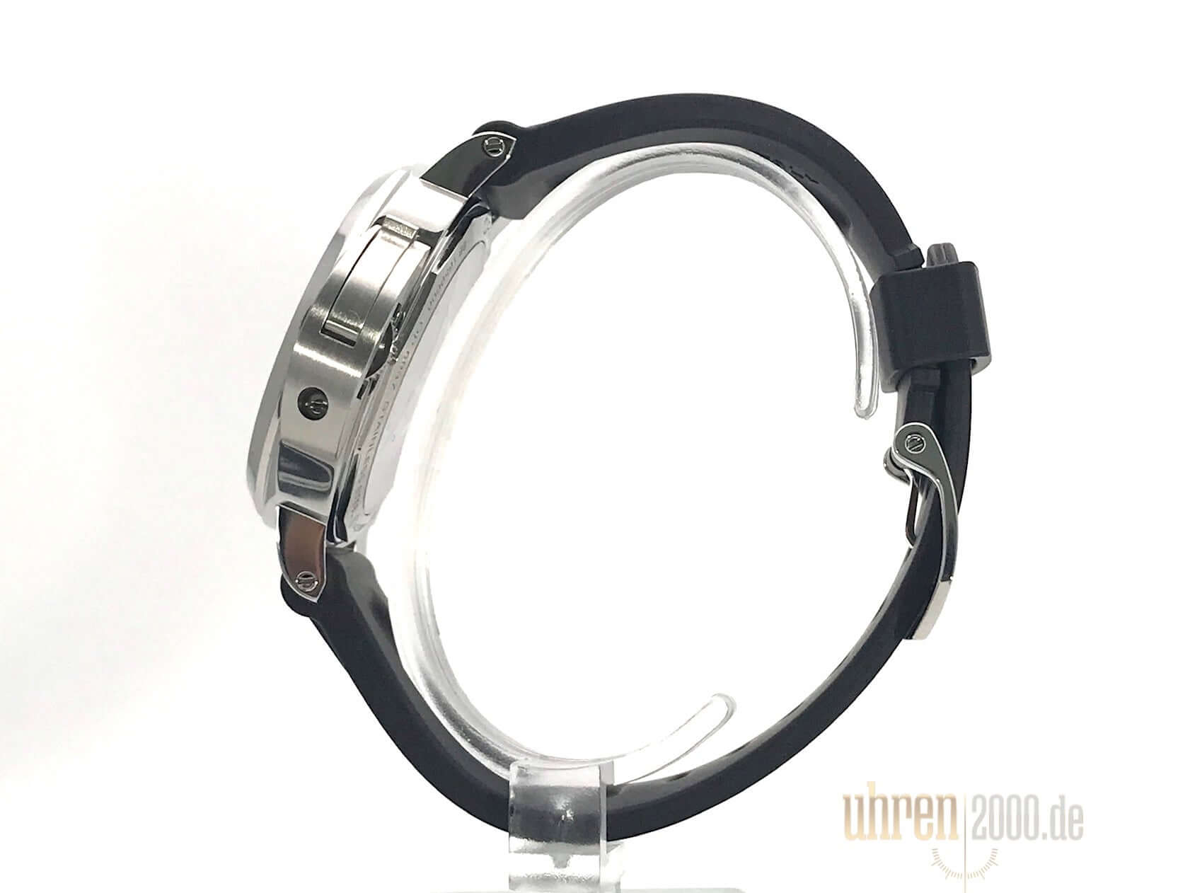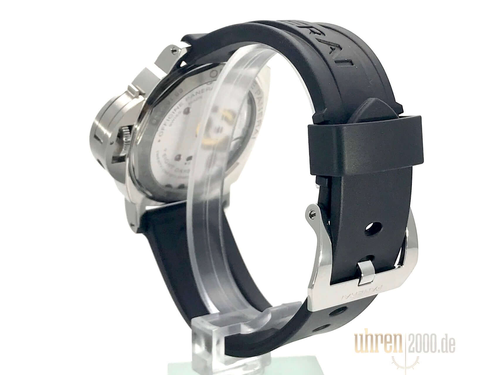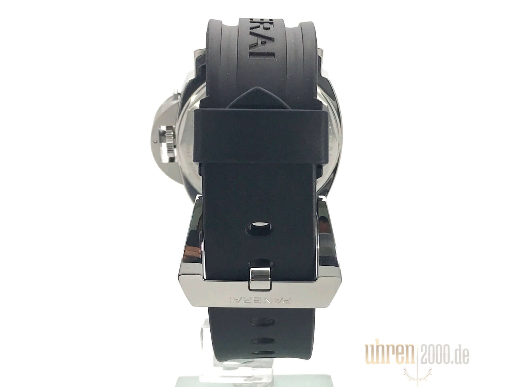 Gehäuse aus Edelstahl poliert, Gehäusedurchmesser 44 mm, Edelstahl Lünette poliert, schwarzes Kautschukband mit Dornschließe aus poliertem Stahl, Zifferblatt Schwarz mit fluoreszierenden arabischen Ziffern und Leuchtindex, Mechanisches Uhrwerk mit Handaufzug, Kaliber Panerai P.5000, vollständige Panerai Eigenfertigung, 21 Steine, 21.600 A/h., Gangreserve 192 Stunden, Kronenschutzbrücke, entspiegeltes Saphirglas aus Korund 2,5 mm stark, Gehäuseboden aus Edelstahl mit Saphirglas, Wasserdicht bis zu 30 bar.