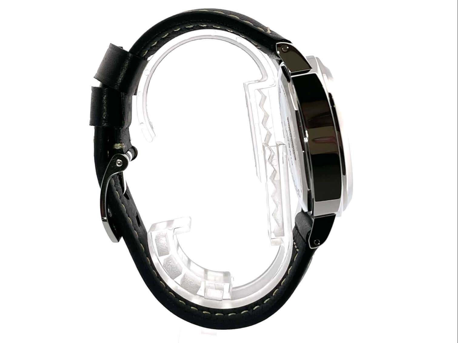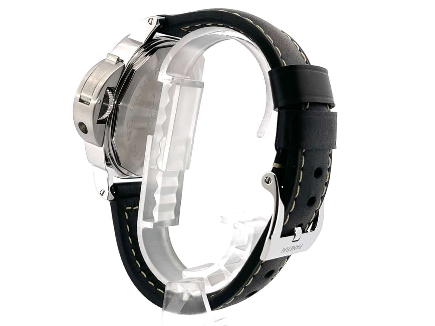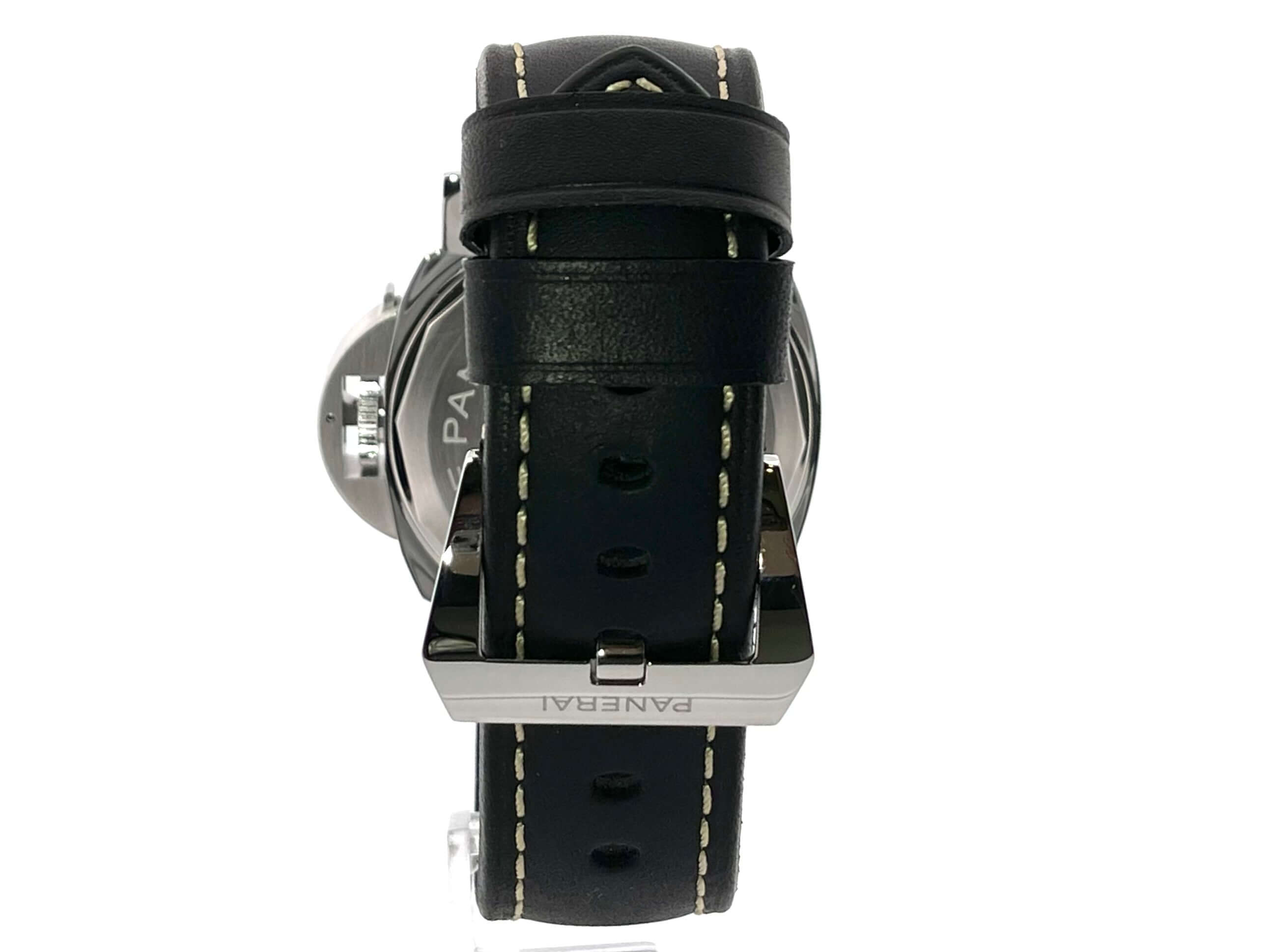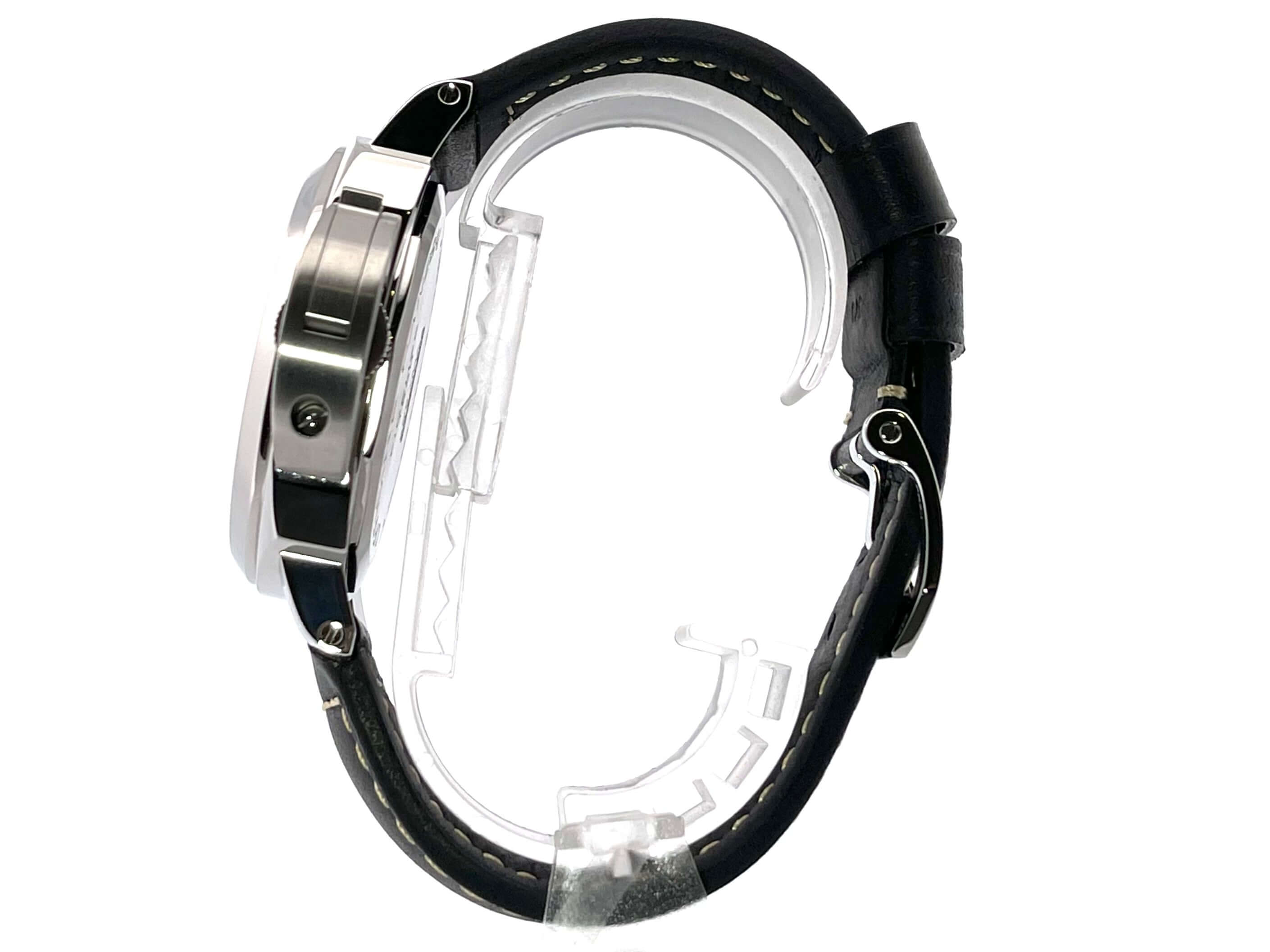 Gehäuse aus Edelstahl satiniert, Durchmesser 44 mm, Lünette aus Edelstahl poliert, schwarzes Lederarmband mit Dornschließe aus satiniertem Edelstahl, schwarzes Zifferblatt mit fluoreszierenden arabischen Ziffern und Indizes, Sekundenanzeige auf 9 Uhr, Mechanisches Uhrwerk mit Handaufzug, Kaliber Panerai P.5000, vollständige Panerai Eigenfertigung, 21 Steine, Schwingung 21.600 A/h., Gangreserve 192 Stunden, Kronenschutzbrücke, Entspiegeltes Saphirglas aus Korund 2,5 mm stark, Edelstahlboden, Wasserdicht bis zu 30 bar.