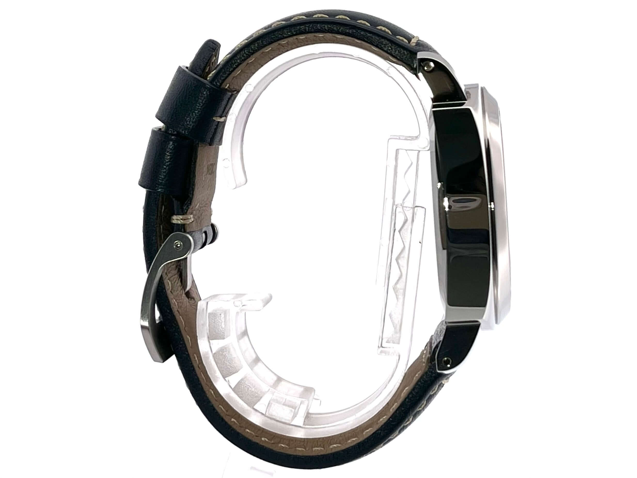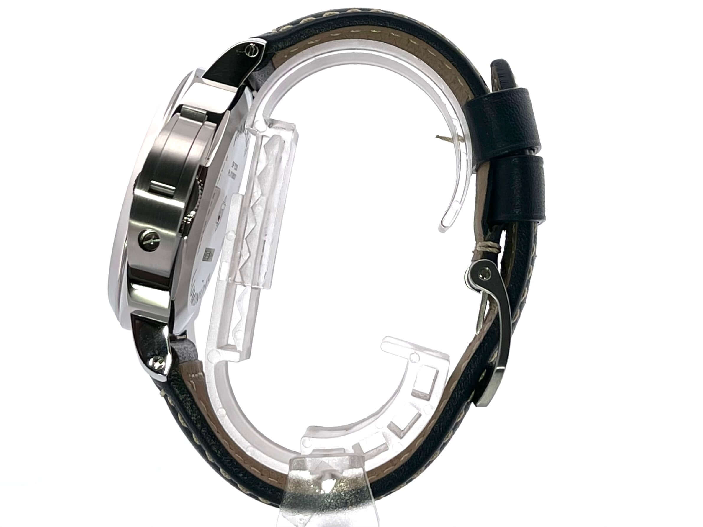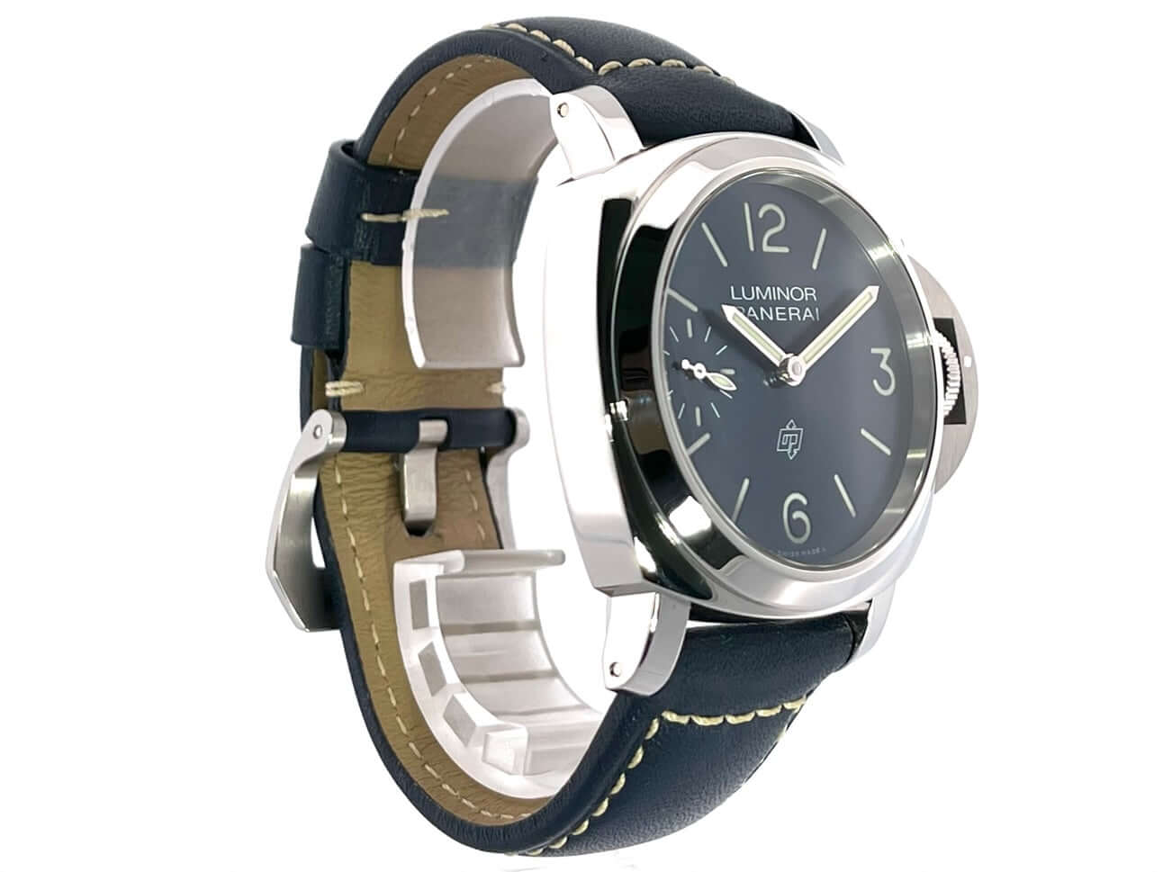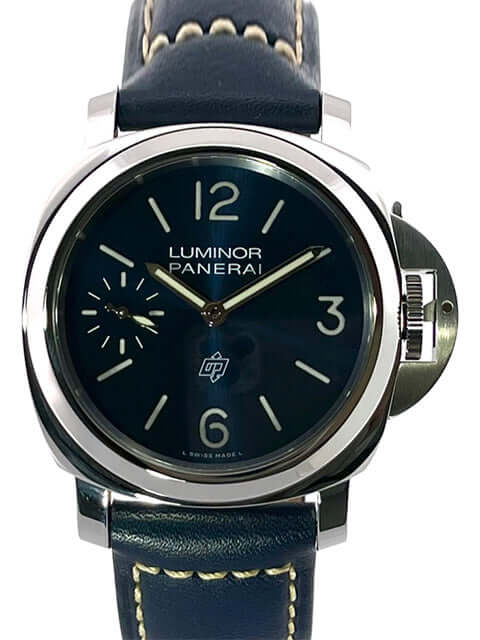 Gehäuse aus Edelstahl poliert, Gehäusedurchmesser 44 mm, Lünette aus Edelstahl poliert, blaues Lederarmband mit Dornschließe aus poliertem Edelstahl, zusätzlich Kautschukband, blaues Zifferblatt mit arabischen Leuchtziffern und Stundenmarkierungen, Mechanisches Uhrwerk mit Handaufzug, Kaliber Panerai P.6000 mit 19 Steine, Schwingung 21.600 A/h., Gangreserve 72 Stunden, kleine Sekunde, entspiegeltes Saphirglas, Edelstahlboden, Wasserdicht bis zu 10 bar.