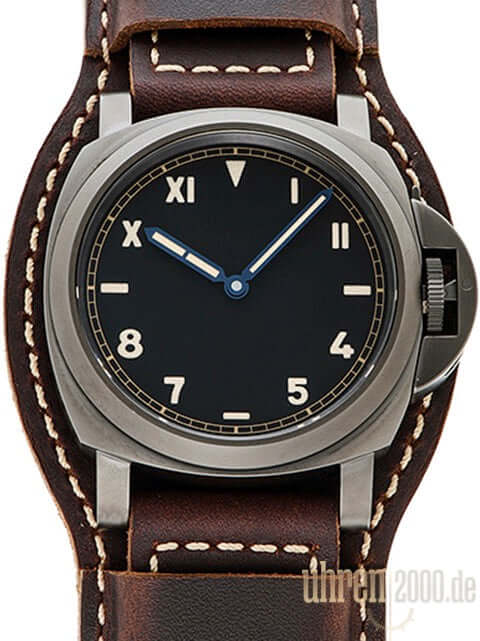 Gehäuse aus Titan mit DLC-Beschichtung, Gehäusedurchmesser 44 mm, Lünette aus Titan mit DLC-Beschichtung, braunes Lederband mit Dornschließe aus Titan mit DLC-Beschichtung, schwarzes Zifferblatt mit fluoreszierenden arabischen Ziffern und Leuchtindex, Handaufzug, Kaliber Panerai P.5000, vollständige Panerai Eigenfertigung, 21 Steine, 21.600 A/h, Gangreserve 192 Stunden, Entspiegeltes Saphirglas aus Korund, kleine Sekundenanzeige, Gehäuseboden aus Titan, Kronenschutzbrücke aus Titan mit DLC-Beschichtung, Wasserdicht bis zu 30 bar.