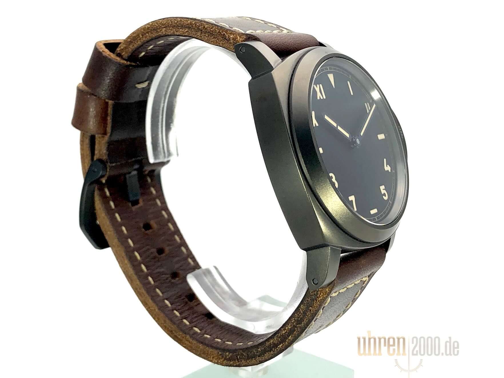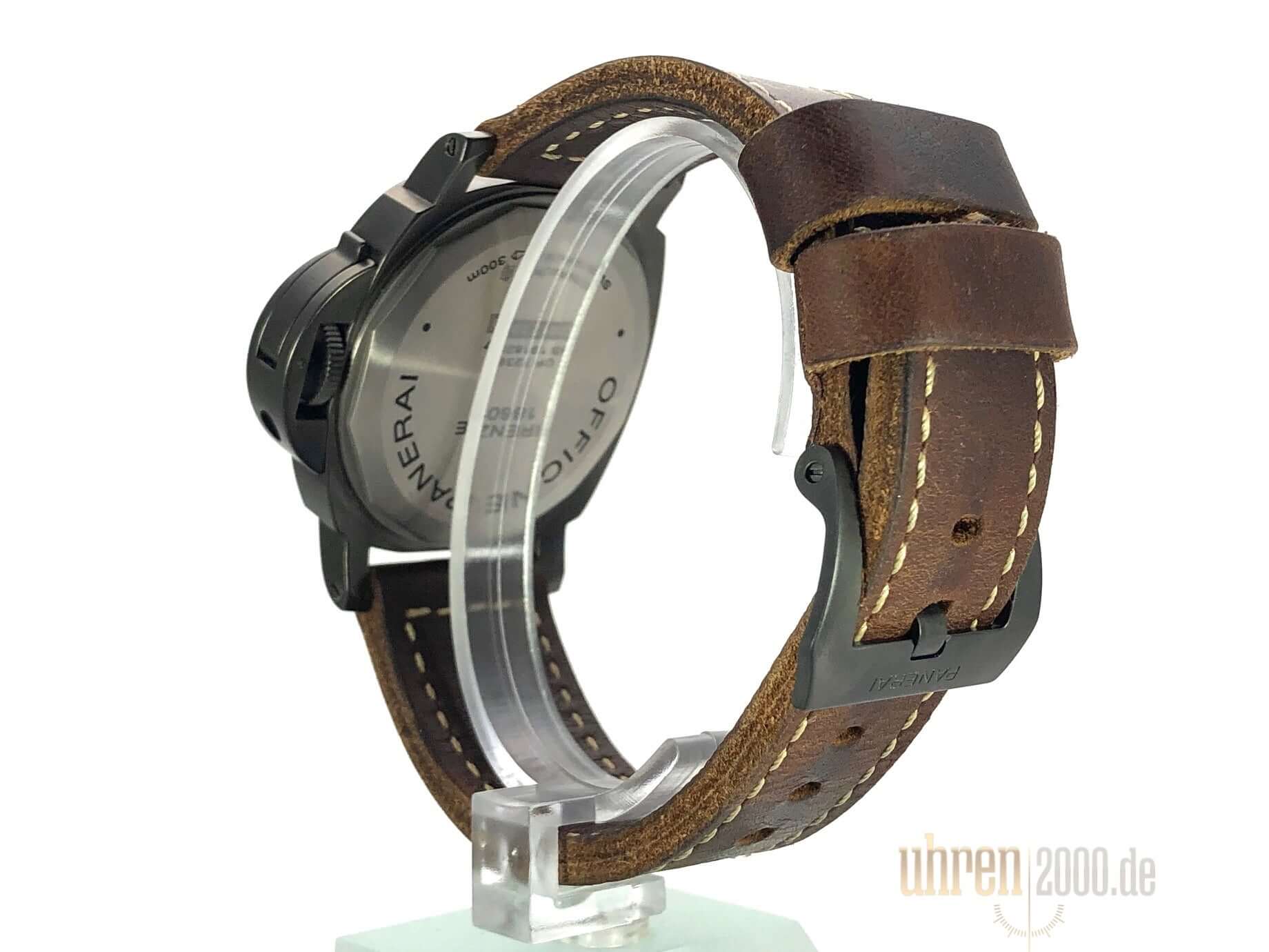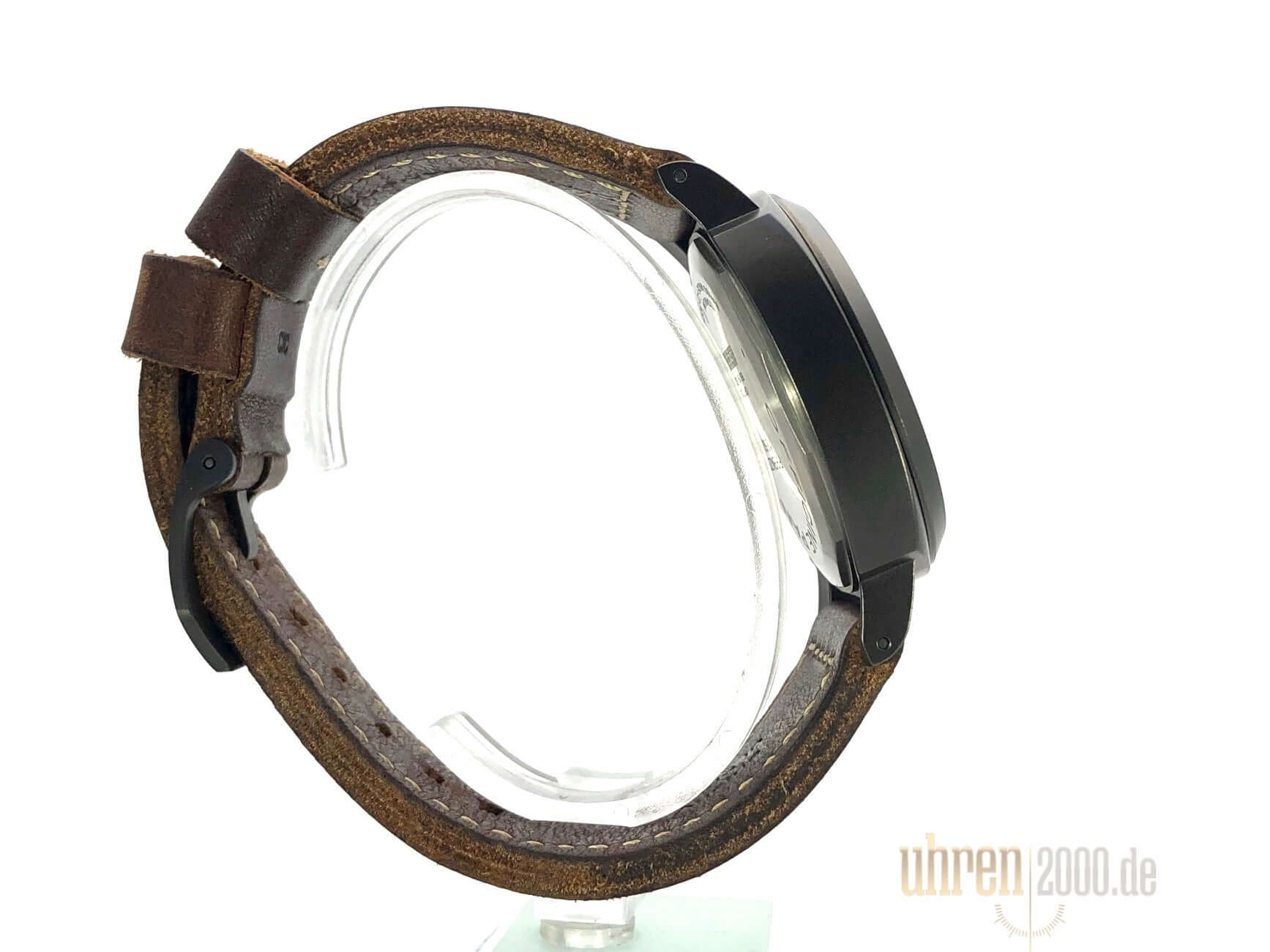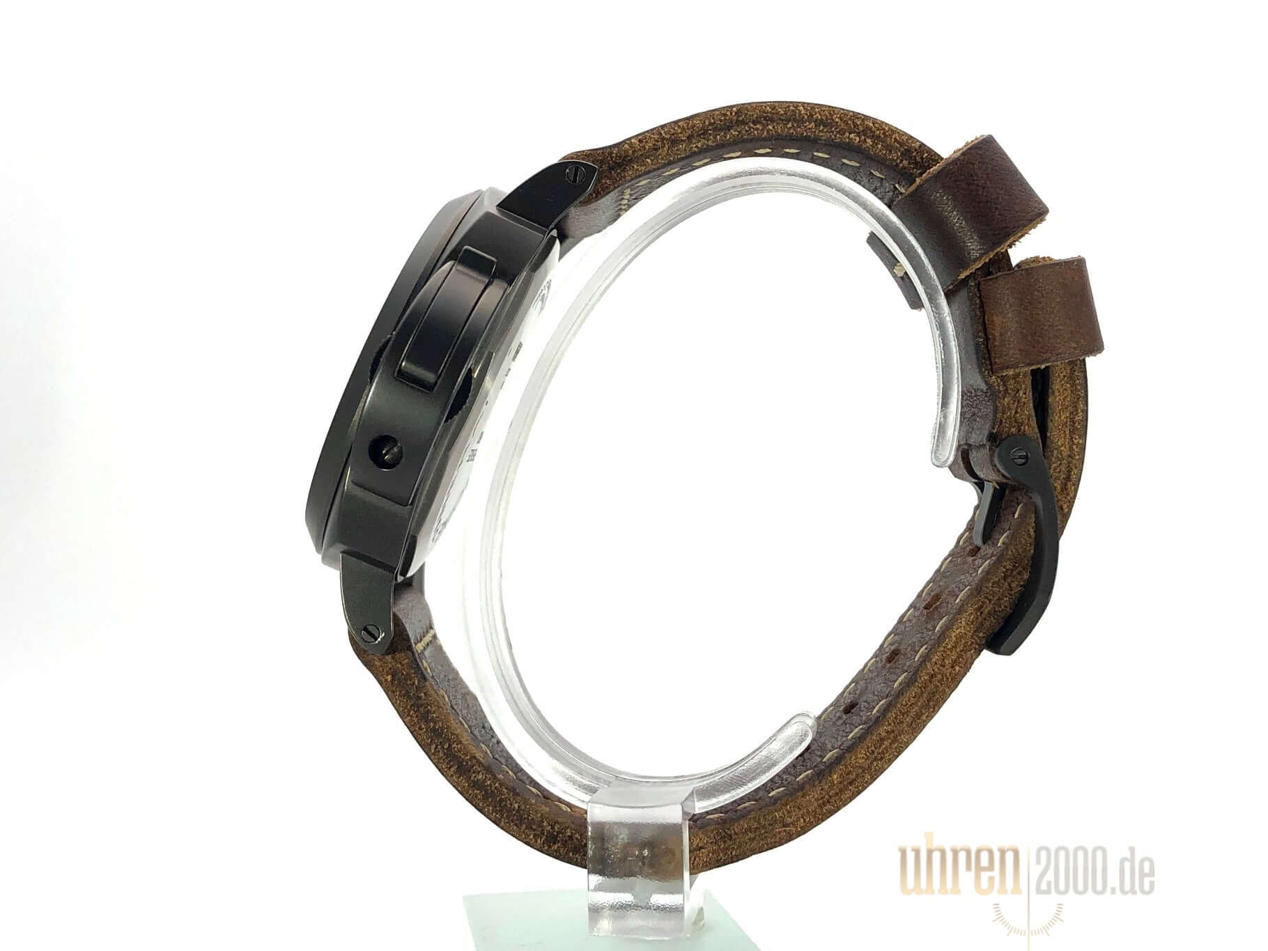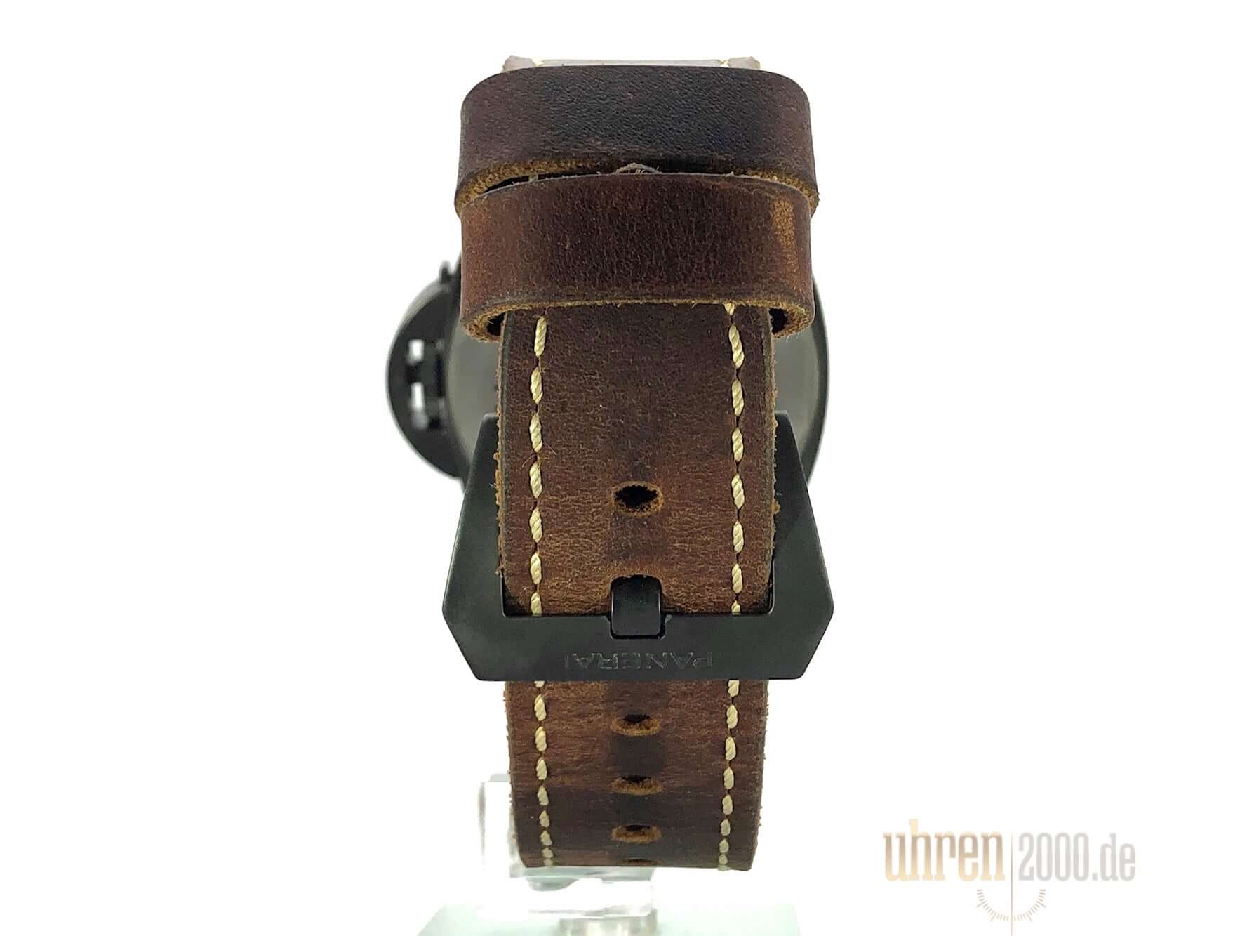 Gehäuse aus Titan mit DLC-Beschichtung, Gehäusedurchmesser 44 mm, Lünette aus Titan mit DLC-Beschichtung, braunes Lederband mit Dornschließe aus Titan mit DLC-Beschichtung, schwarzes Zifferblatt mit fluoreszierenden arabischen Ziffern und Leuchtindex, Handaufzug, Kaliber Panerai P.5000, vollständige Panerai Eigenfertigung, 21 Steine, 21.600 A/h, Gangreserve 192 Stunden, Entspiegeltes Saphirglas aus Korund, kleine Sekundenanzeige, Gehäuseboden aus Titan, Kronenschutzbrücke aus Titan mit DLC-Beschichtung, Wasserdicht bis zu 30 bar.