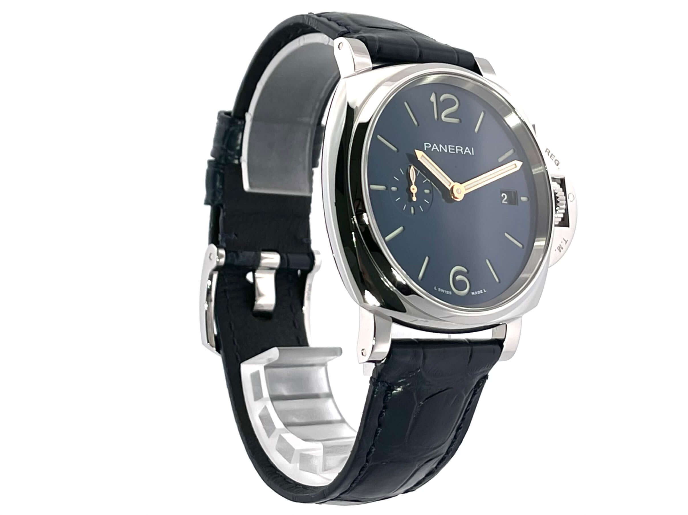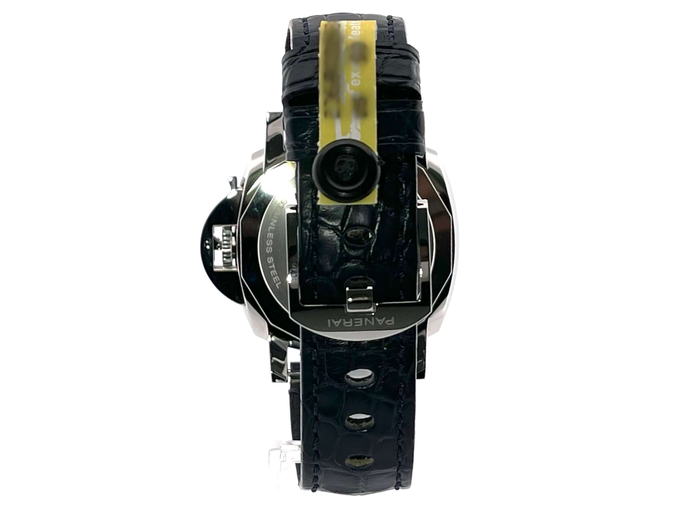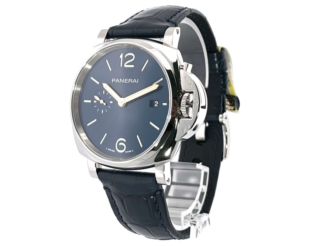 Gehäuse aus Edelstahl poliert, Gehäusedurchmesser 42 mm, Lünette aus Edelstahl poliert, blaues Lederarmband mit Dornschließe, blaues Zifferblatt mit Sonnenschliff, arabischen Ziffern und fluoreszierenden Indizes, Automatikuhrwerk, Kaliber Panerai P.900 mit 23 Steine, Schwingung 28.800 A/h., Gangreserve 72 Stunden, Datum, kleine Sekunde, entspiegeltes Saphirglas, Edelstahlboden, Wasserdicht bis zu 3 bar.