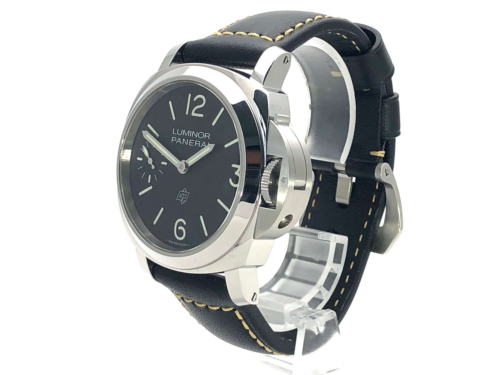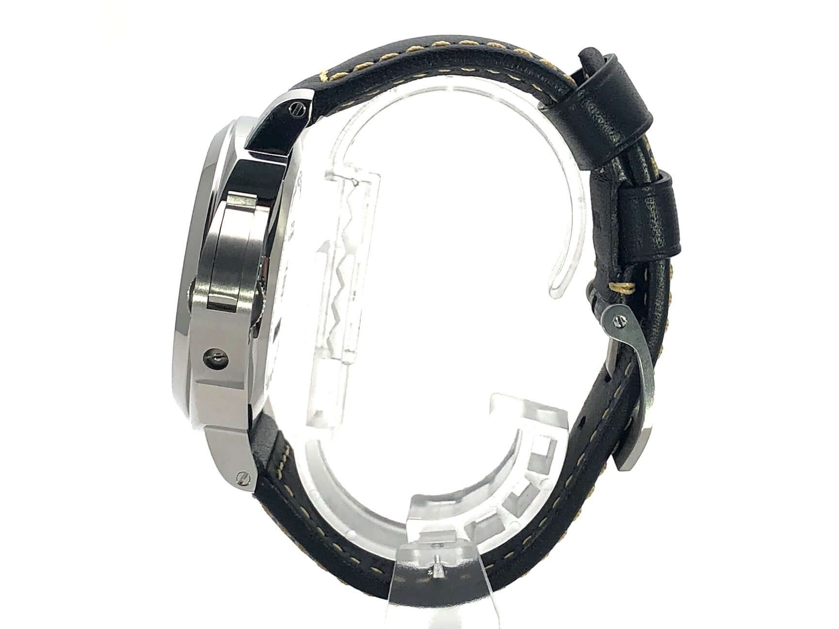 Gehäuse aus Edelstahl poliert, Gehäusedurchmesser 44 mm, Lünette aus Edelstahl poliert, schwarzes Lederarmband mit Dornschließe aus poliertem Edelstahl, schwarzes Zifferblatt mit arabischen Leuchtziffern und Stundenmarkierungen, Mechanisches Uhrwerk mit Handaufzug, Kaliber Panerai P.6000 mit 19 Steine, Schwingung 21.600 A/h., Gangreserve 72 Stunden, kleine Sekunde, entspiegeltes Saphirglas, Edelstahlboden, Wasserdicht bis zu 10 bar.