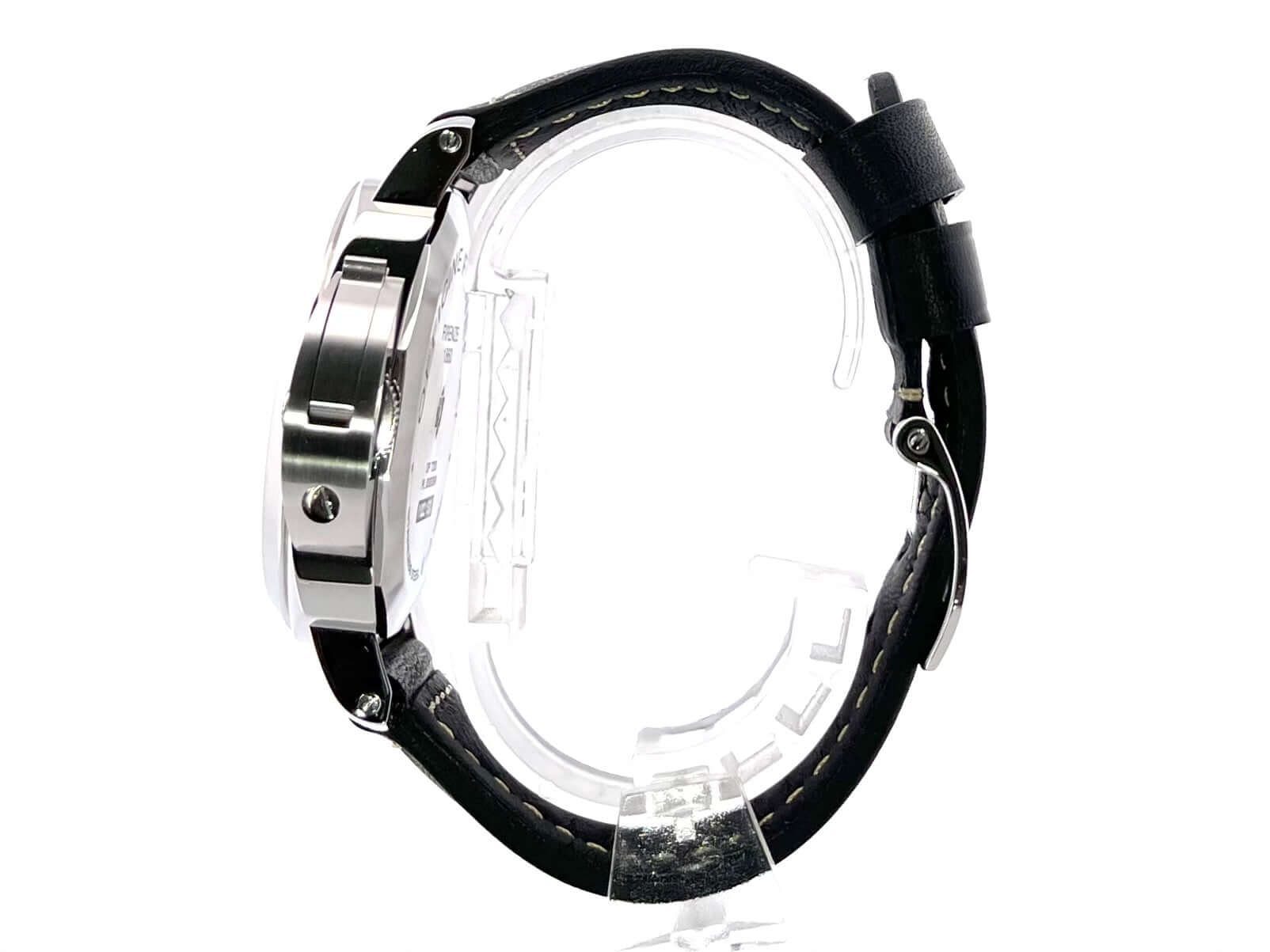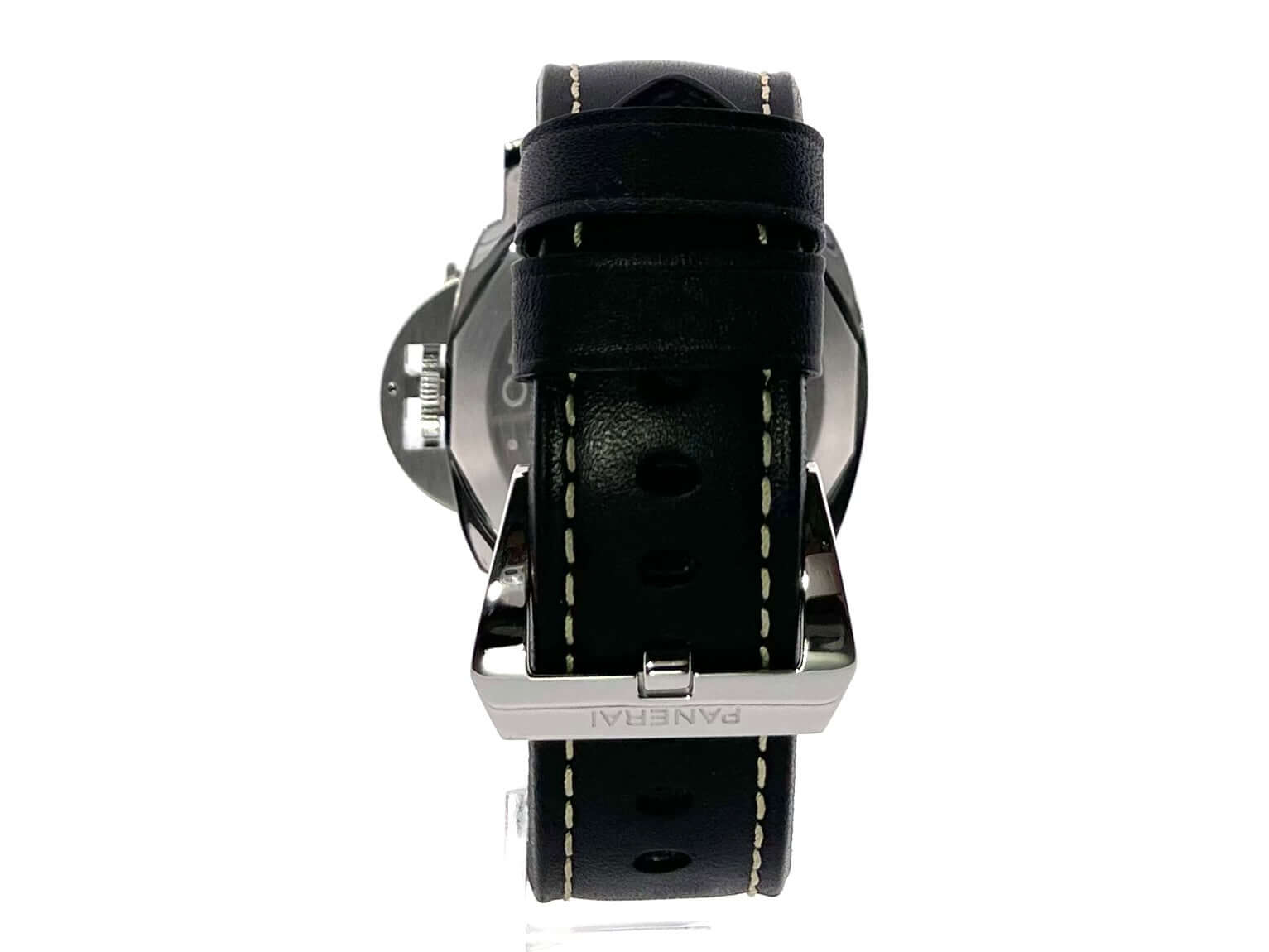 Gehäuse aus Edelstahl poliert, Gehäusedurchmesser 44 mm, Lünette aus Edelstahl poliert, schwarzes Lederband mit Ziernaht und Dornschließe, extra Kautschukband im Lieferumfang, schwarzes Zifferblatt mit arabischen Leuchtziffern und Stundenmarkierungen, Mechanisches Uhrwerk mit Handaufzug, Kaliber Panerai P.6000 mit 19 Steine, Schwingung 21.600 A/h., Gangreserve 72 Stunden, kleine Sekunde, entspiegeltes Saphirglas, Edelstahlboden, Wasserdicht bis zu 10 bar,