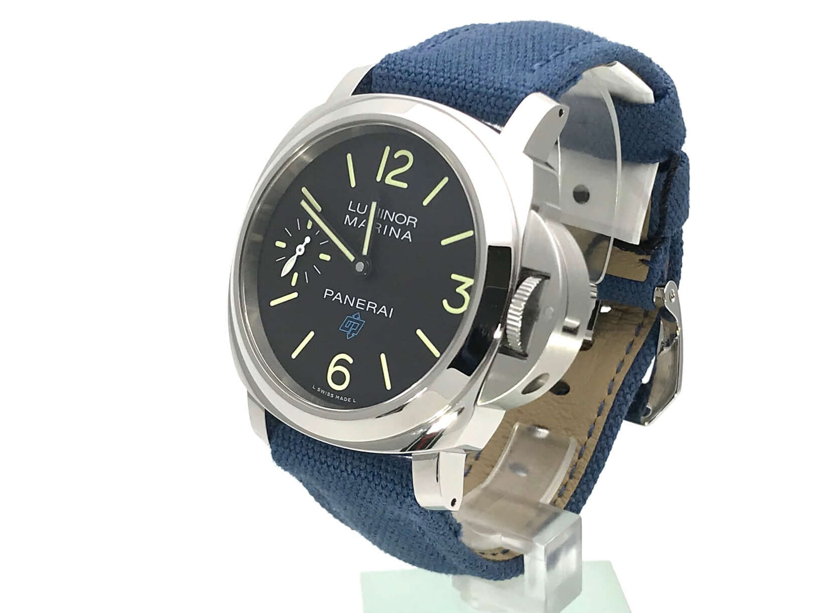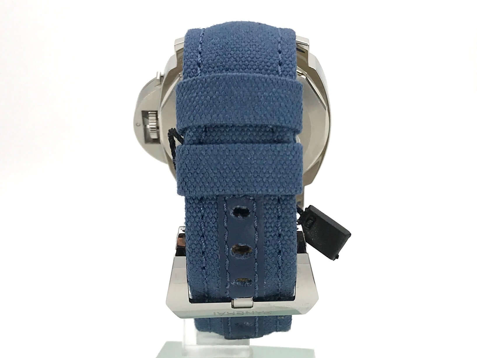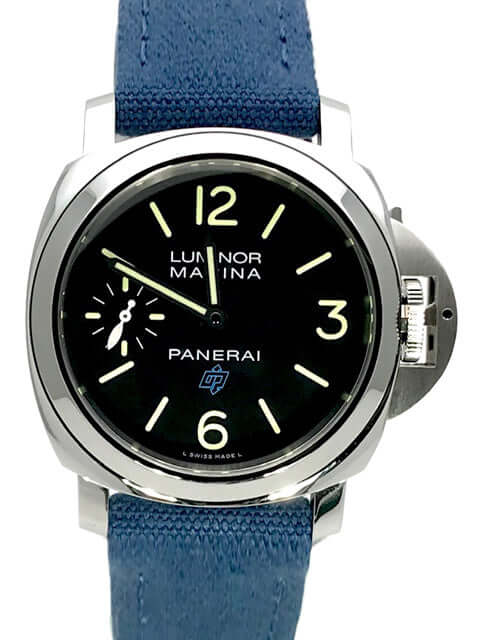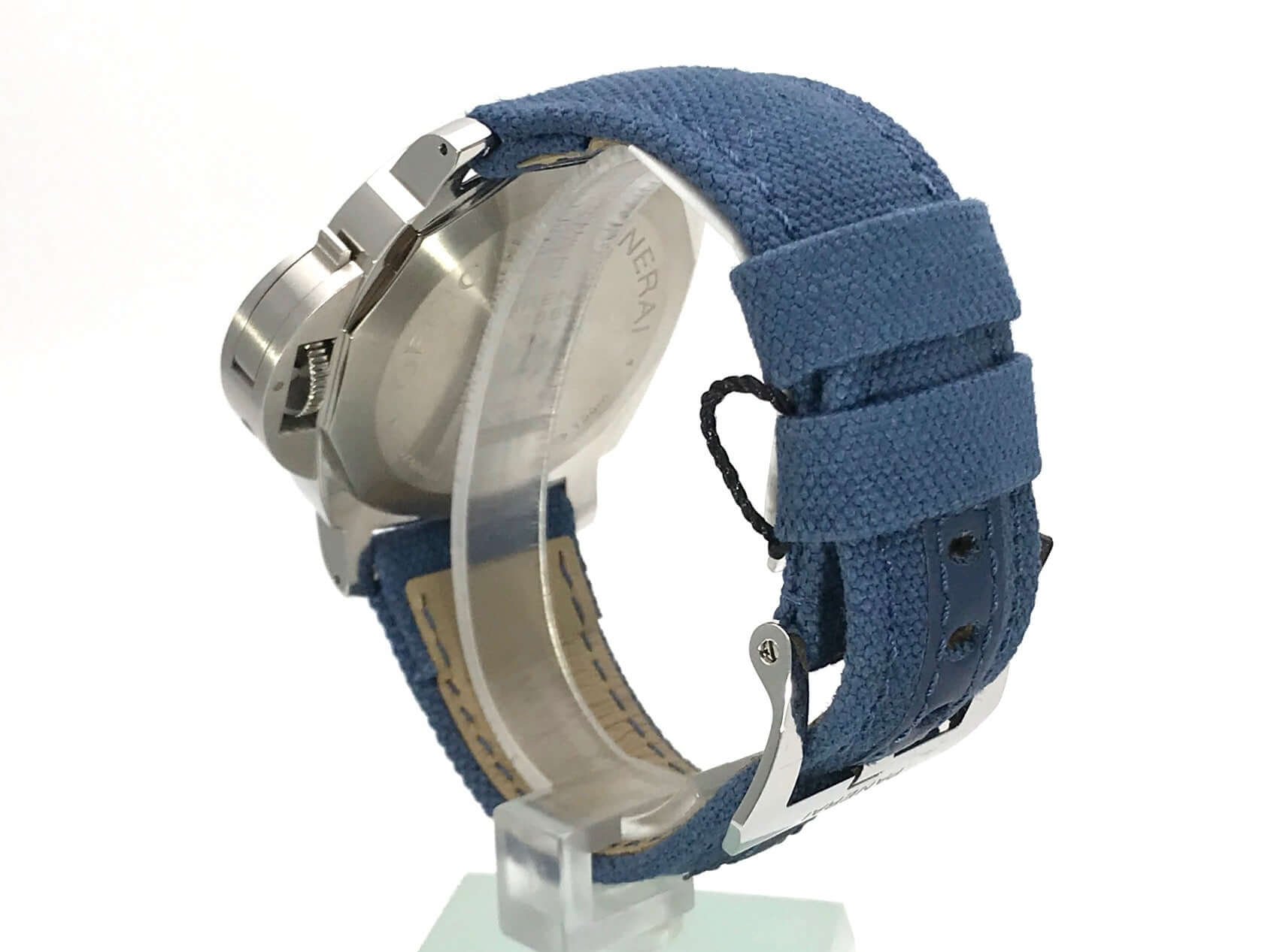 Gehäuse aus Edelstahl poliert, Gehäusedurchmesser 44 mm, Lünette aus Edelstahl poliert, blaues Textilarmband mit Ziernaht und Dornschließe, schwarzes Zifferblatt mit arabischen Leuchtziffern und Stundenmarkierungen, Mechanisches Uhrwerk mit Handaufzug, Kaliber Panerai P.6000 mit 19 Steine, Schwingung 21.600 A/h., Gangreserve 72 Stunden, kleine Sekunde, entspiegeltes Saphirglas, Edelstahlboden, Wasserdicht bis zu 10 bar.