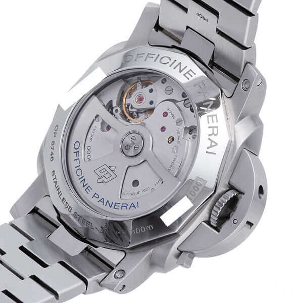 Gehäuse aus Edelstahl satiniert, Gehäusedurchmesser 44 mm, Edelstahl Lünette poliert, Edelstahlarmband poliert und satiniert, schwarzes Zifferblatt mit fluoreszierenden arabischen Zahlen und Stundenmarkierungen, Datumsanzeige auf 3 Uhr, kleine Sekundenanzeige auf 9 Uhr, Automatikwerk, Kaliber Panerai P.9000, vollständige Panerai Eigenfertigung, 28 Steine, Glucydur-Unruh, Schwingung 28.800 A/h, Incabloc-Stoßsicherung, Gangreserve 72 Stunden, Entspiegeltes Saphirglas aus Korund 2,6 mm stark, Stunden, Minuten, kleine Sekundenanzeige, Edelstahlboden mit transparentem Saphirglas, Kronenschutzbrücke aus satiniertem Edelstahl, Wasserdicht bis zu 30 bar.