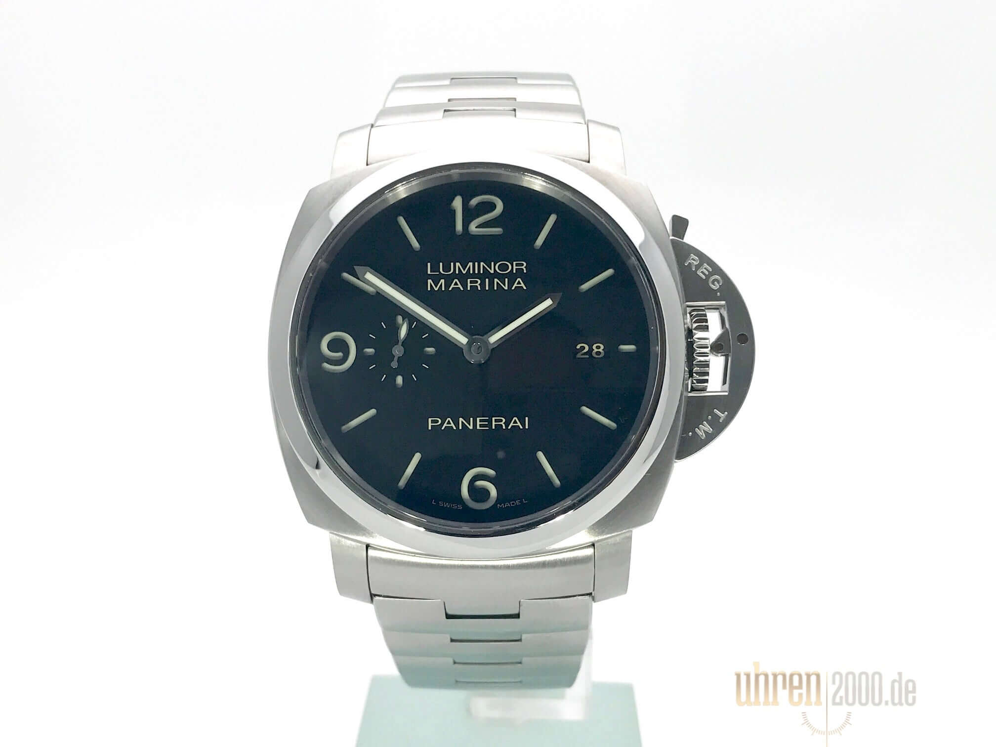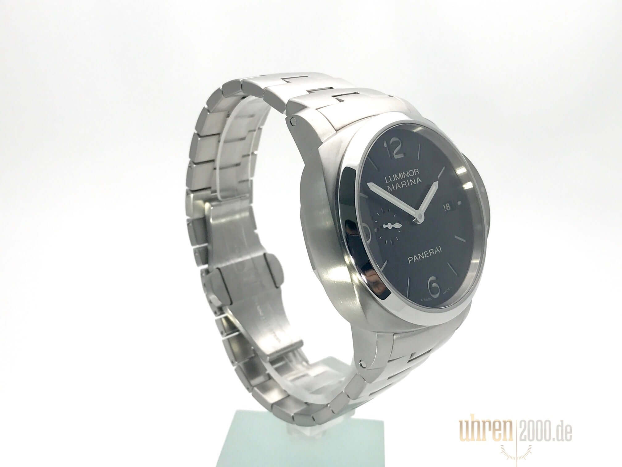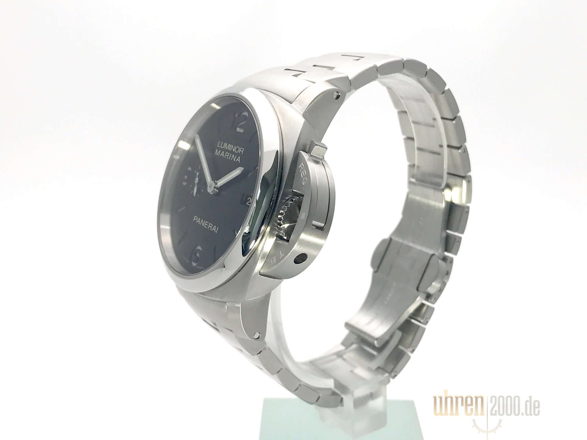 Gehäuse aus Edelstahl satiniert, Gehäusedurchmesser 44 mm, Edelstahl Lünette poliert, Edelstahlarmband poliert und satiniert, schwarzes Zifferblatt mit fluoreszierenden arabischen Zahlen und Stundenmarkierungen, Datumsanzeige auf 3 Uhr, kleine Sekundenanzeige auf 9 Uhr, Automatikwerk, Kaliber Panerai P.9000, vollständige Panerai Eigenfertigung, 28 Steine, Glucydur-Unruh, Schwingung 28.800 A/h, Incabloc-Stoßsicherung, Gangreserve 72 Stunden, Entspiegeltes Saphirglas aus Korund 2,6 mm stark, Stunden, Minuten, kleine Sekundenanzeige, Edelstahlboden mit transparentem Saphirglas, Kronenschutzbrücke aus satiniertem Edelstahl, Wasserdicht bis zu 30 bar.