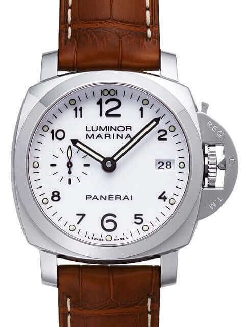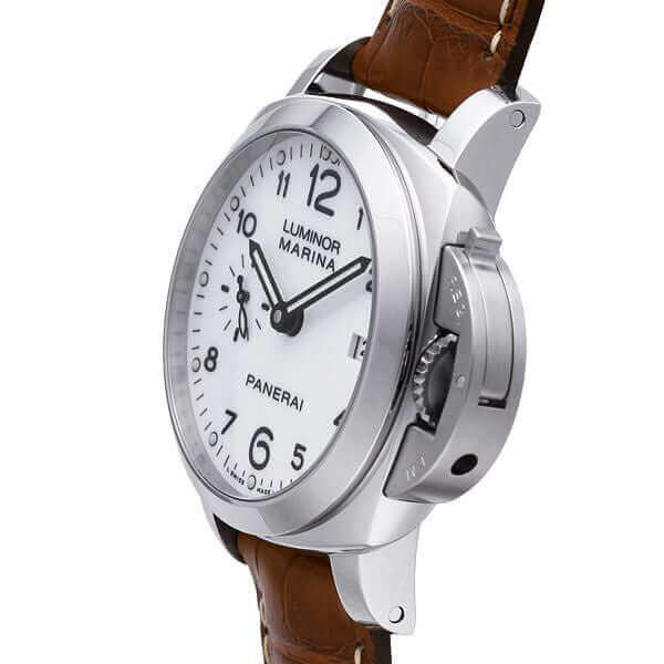 Gehäuse Edelstahl poliert und satiniert, Gehäusedurchmesser 42 mm, Edelstahl Lünette poliert, Lederarmband braun mit Ziernaht, Stiftschließe mit Hersteller-Schriftzug, weißes Zifferblatt mit arabischen Ziffern und Leuchtindexen, Leuchtzeiger, Automatikuhrwerk, Kaliber Panerai P.9000, exclusive Panerai Eigenfertigung, 28 Steine, Glucydur-Unruh, 28.800 A/h, Incabloc-Stoßsicherung, 72 Stunden Gangreserve, Datumsanzeige mit Schnellverstellung, Saphirglas aus Korund 1,8 mm stark entspiegelt, Krone mit Panerai-Sicherheitsverschluß und Schutzbügel, Edelstahlboden verschraubt mit Sichtglas, Wasserdicht bis zu 10 bar.