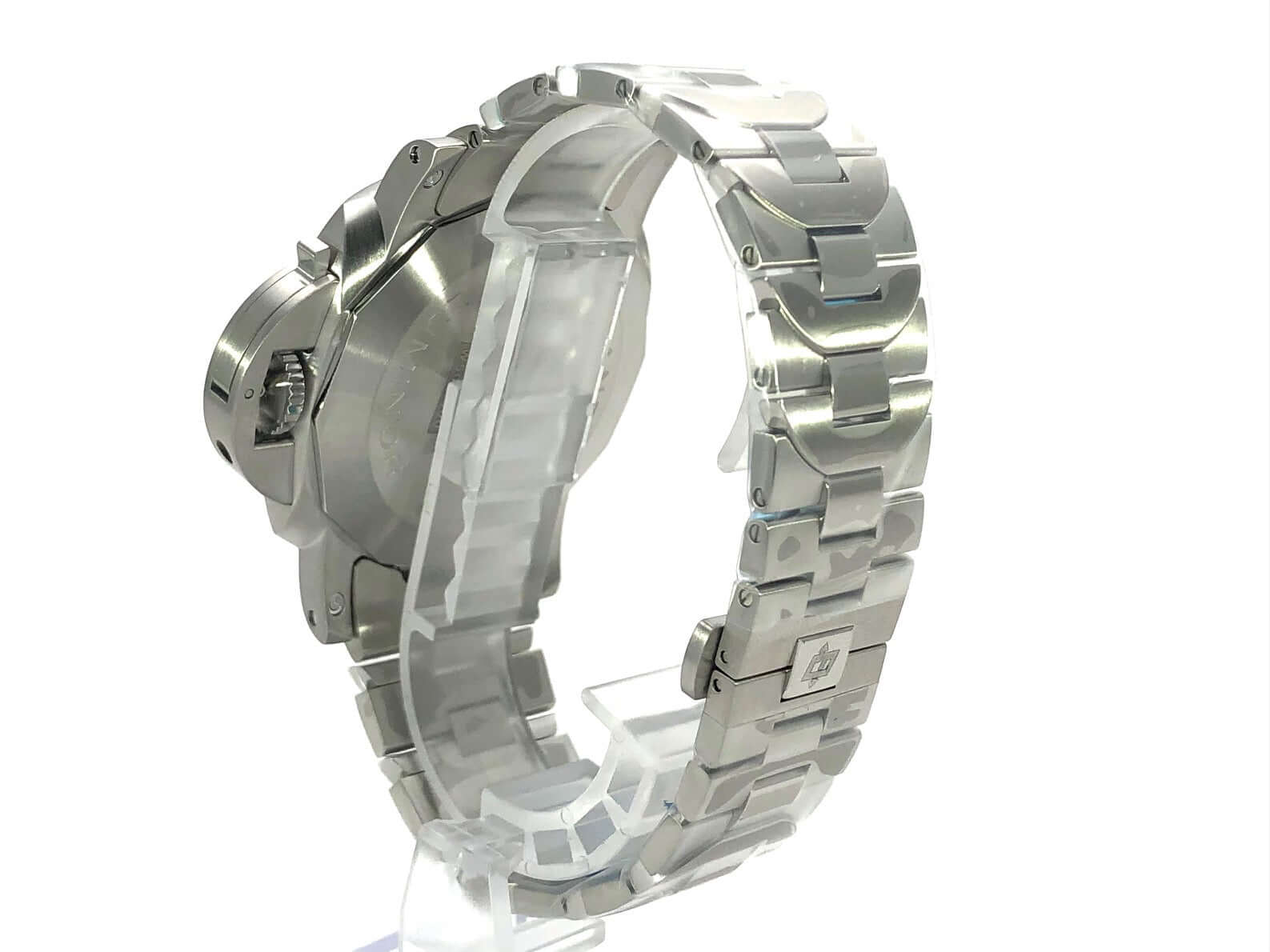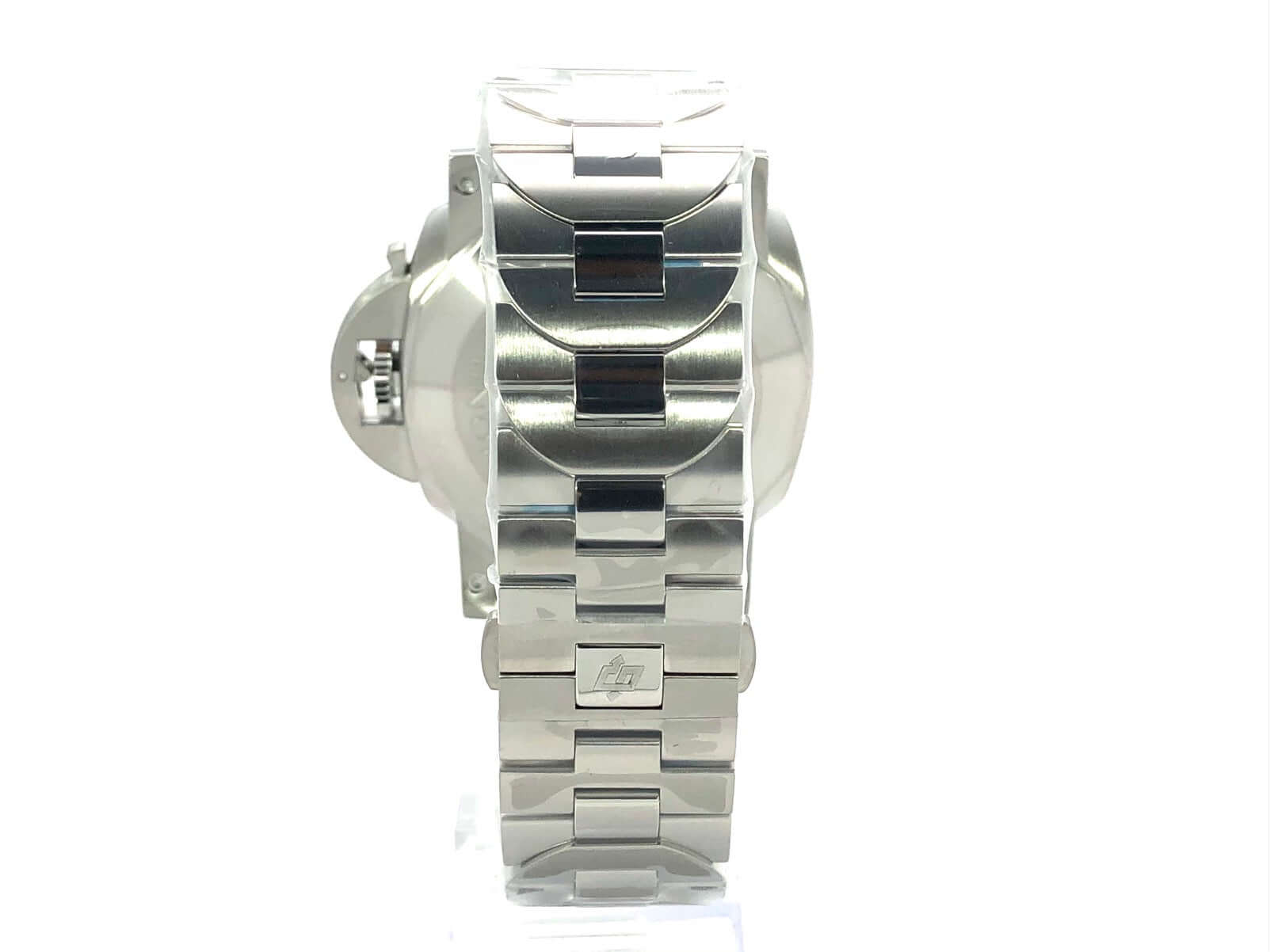 Gehäuse aus Edelstahl satiniert, Gehäusedurchmesser 44 mm, polierte Edelstahl Lünette, Edelstahlband mit Faltschließe, blaues Zifferblatt mit Sonnenschliff, fluoreszierende arabische Zahlen und Stundenmarkierungen, Automatik, Kaliber Panerai P.9010, vollständige Panerai Eigenanfertigung, 31 Steine, 28.800 A/h, 72 Stunden Gangreserve, Datum, kleine Sekunde, entspiegeltes Saphirglas aus Korund, Kronenschutzbrücke, Edelstahlboden, Wasserdicht bis zu 30 bar.