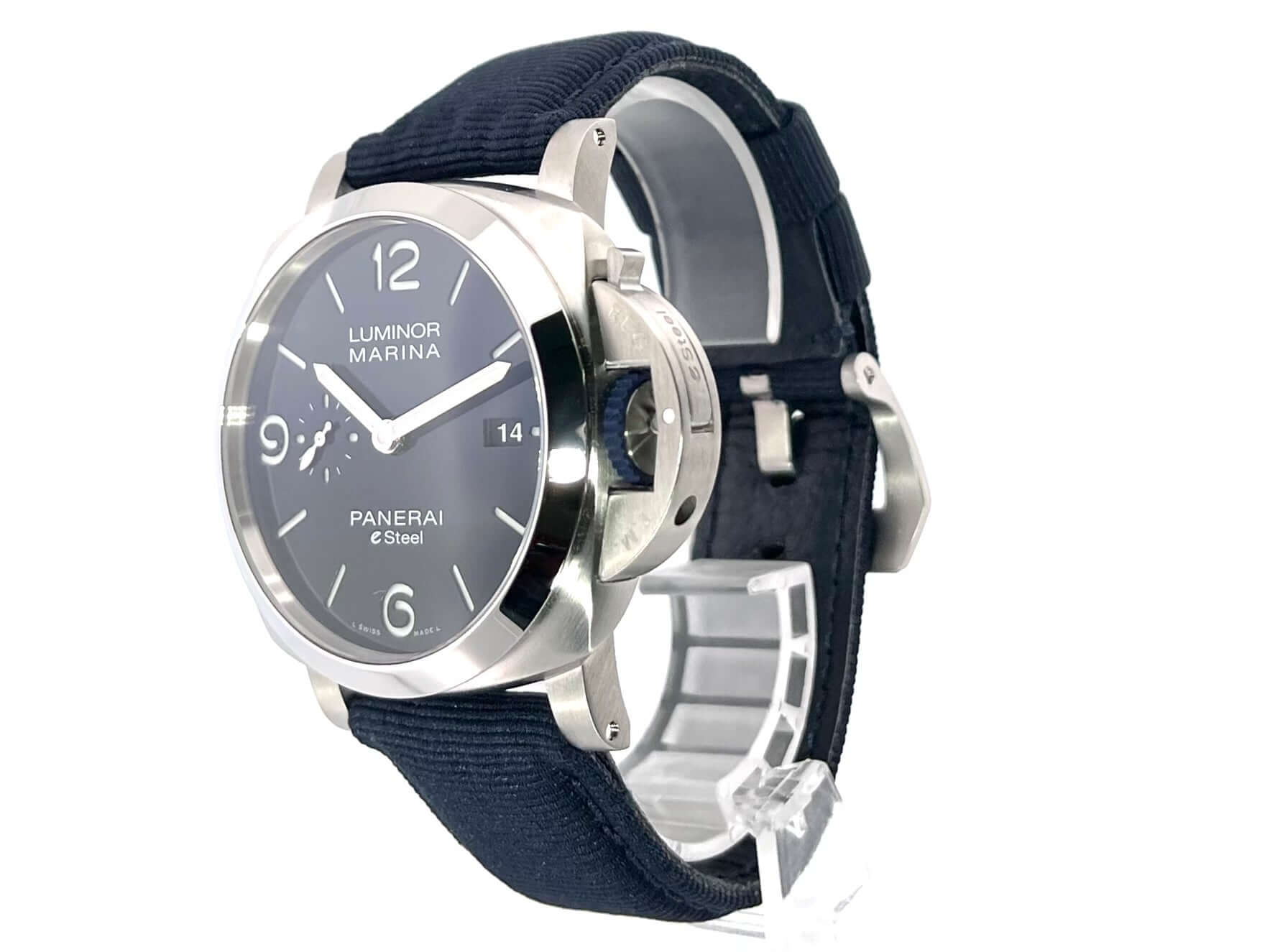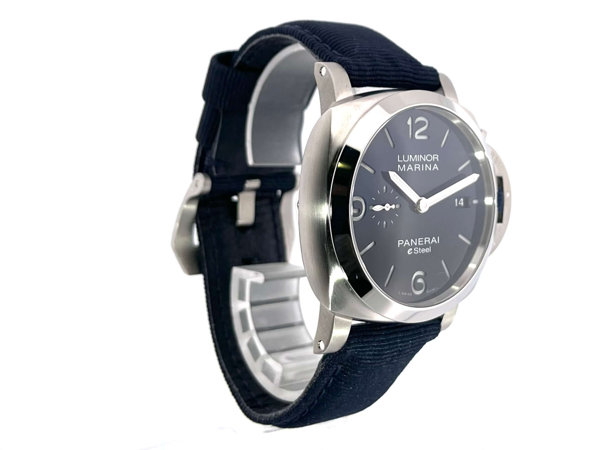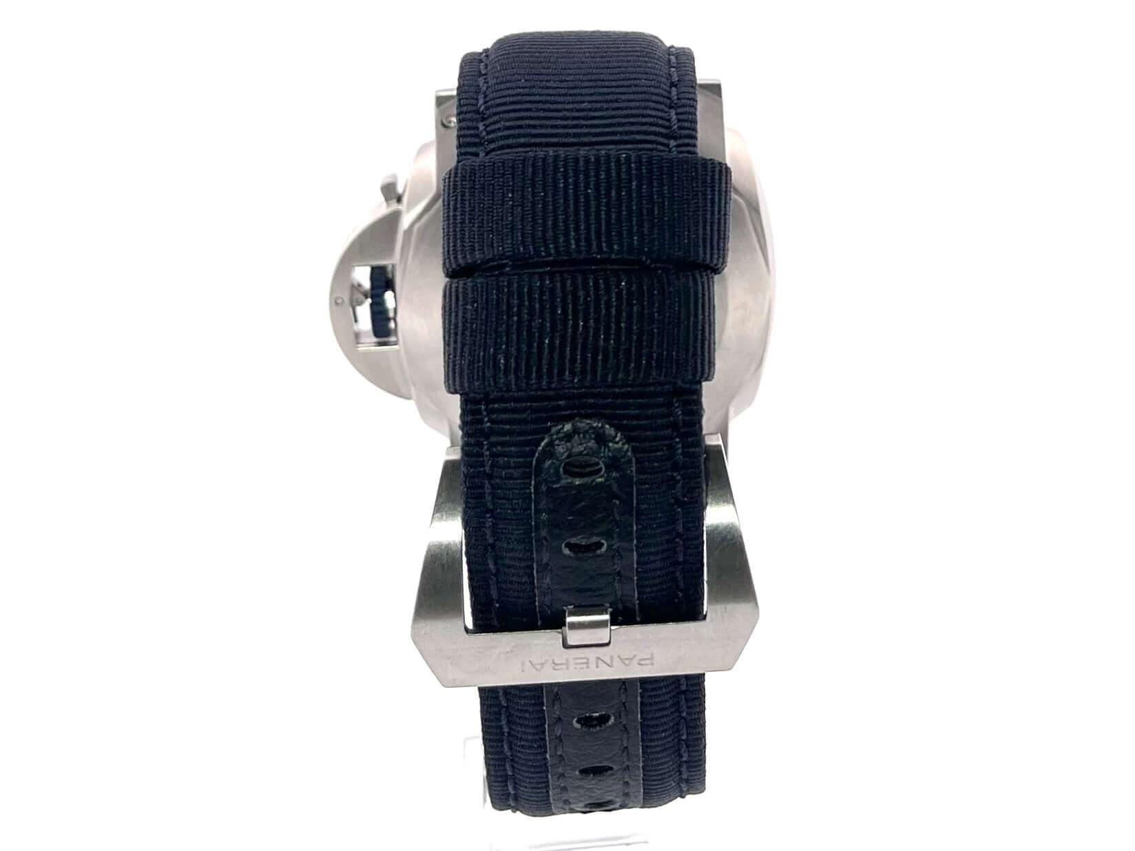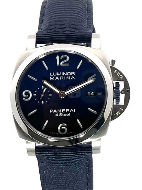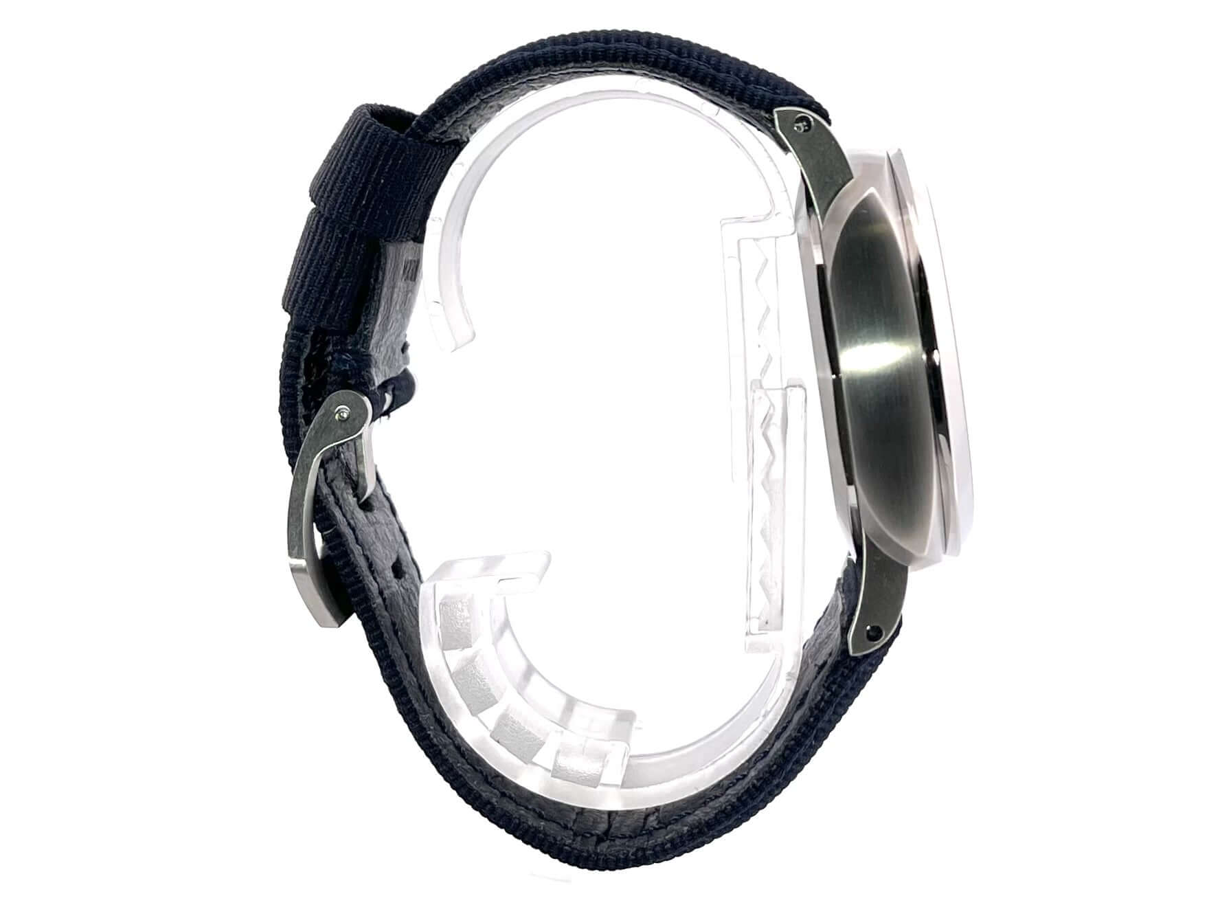 Gehäuse aus Edelstahl poliert und satiniert, Gehäusedurchmesser 44 mm, Lünette aus Edelstahl poliert, blaues Textilband mit Dornschließe, blaues Zifferblatt mit arabischen Leuchtziffern, Leuchtindizes, Leuchtzeiger, Automatik, Panerai Eigenfertigung, Kaliber Panerai P.9010, 31 Steine, Schwingung 28.800 A/h, Datum, 72 Stunden Gangreserve, kleine Sekunde, entspiegeltes Saphirglas aus Korund, Gehäuseboden aus Edelstahl, Wasserdicht bis zu 30 bar.